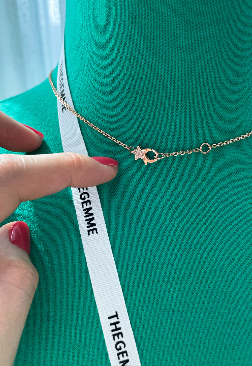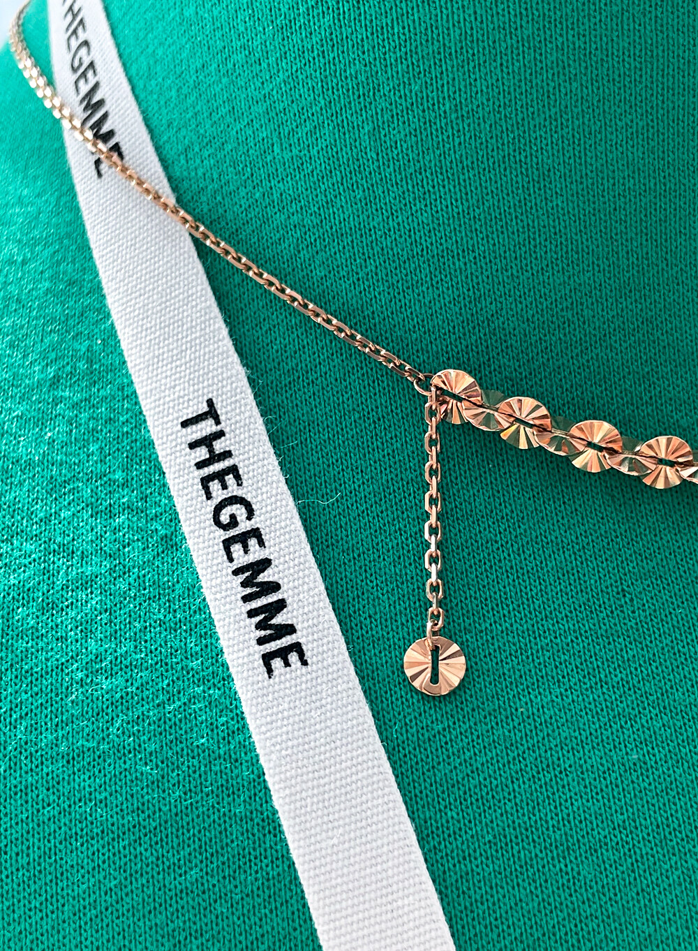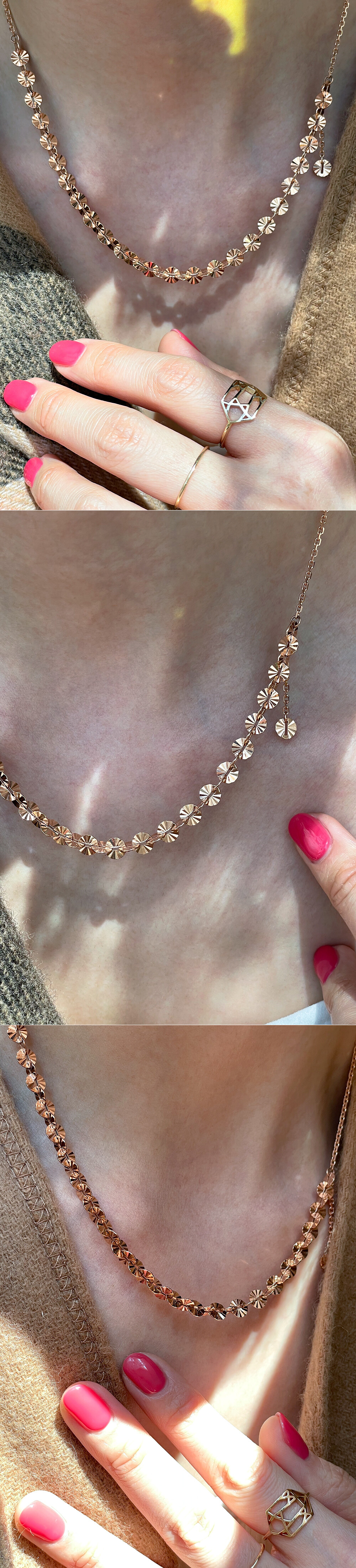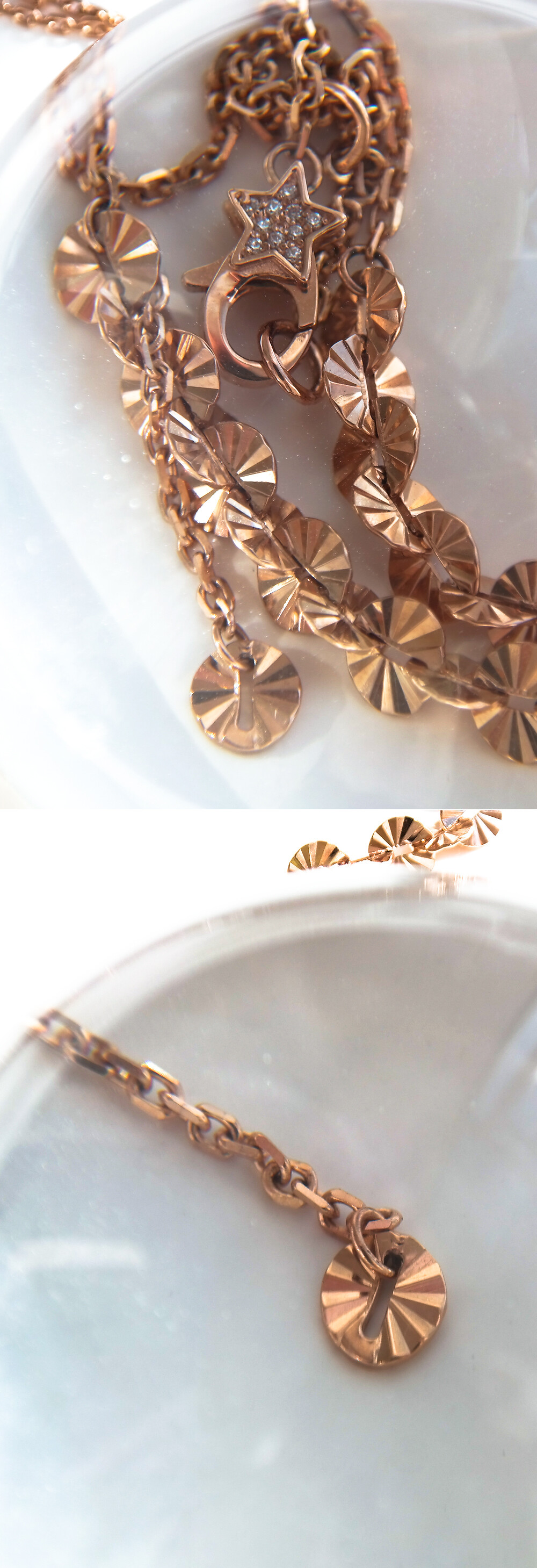 팅클팅클, ✨ 각도에 따라 반짝이는 빛이 유독 눈에 들어오는 디자인의 목걸이입니다. 동그랗고 플랫한 원형의 코인 디자인이 십자 형태로 볼륨감 있게 연결된 링크 목걸이에요. 사이드 부분에는 체인이 달린 드롭 스타일 팬던트가 포인트로 들어가 있구요, 잠금 장식 부분에는 깜찍한 별 모양 디자인이 들어간 붕어 장식이 있답니다! 붕어 장식은 기본 붕어 장식보다 2배 정도 사이즈가 더 큰 장식이에요. 🤩 전체적으로 유니크한 느낌이 강하죠? 중량감이 높아서 착용 시 묵직~한 느낌이 있어요. 볼륨감이 넘쳐서 존재감 확실한 목걸이 ... 볼드한 초커 스타일 목걸이로 착용하셔도 예쁠 것 같아요. 중앙 부분을 제외한 잠금 장식까지 연결된 체인은 각줄이구요, 약 7푼 정도 굵기의 체인입니다. 굵직굵직한 목걸이를 좋아하시는 분들에게 추천해 드릴게요, !🙌🏼💖