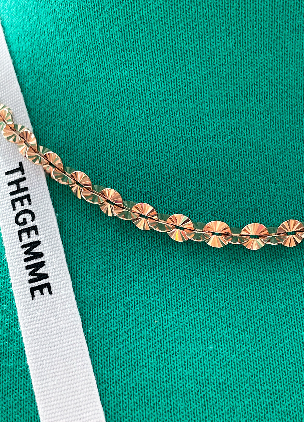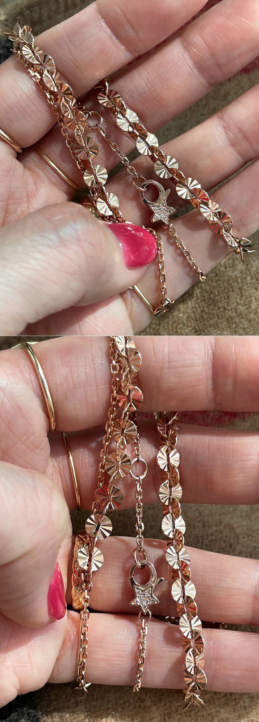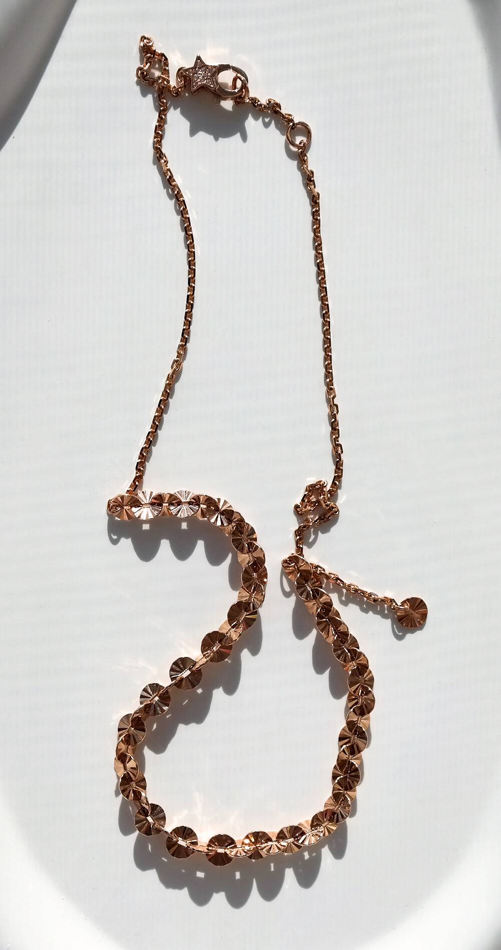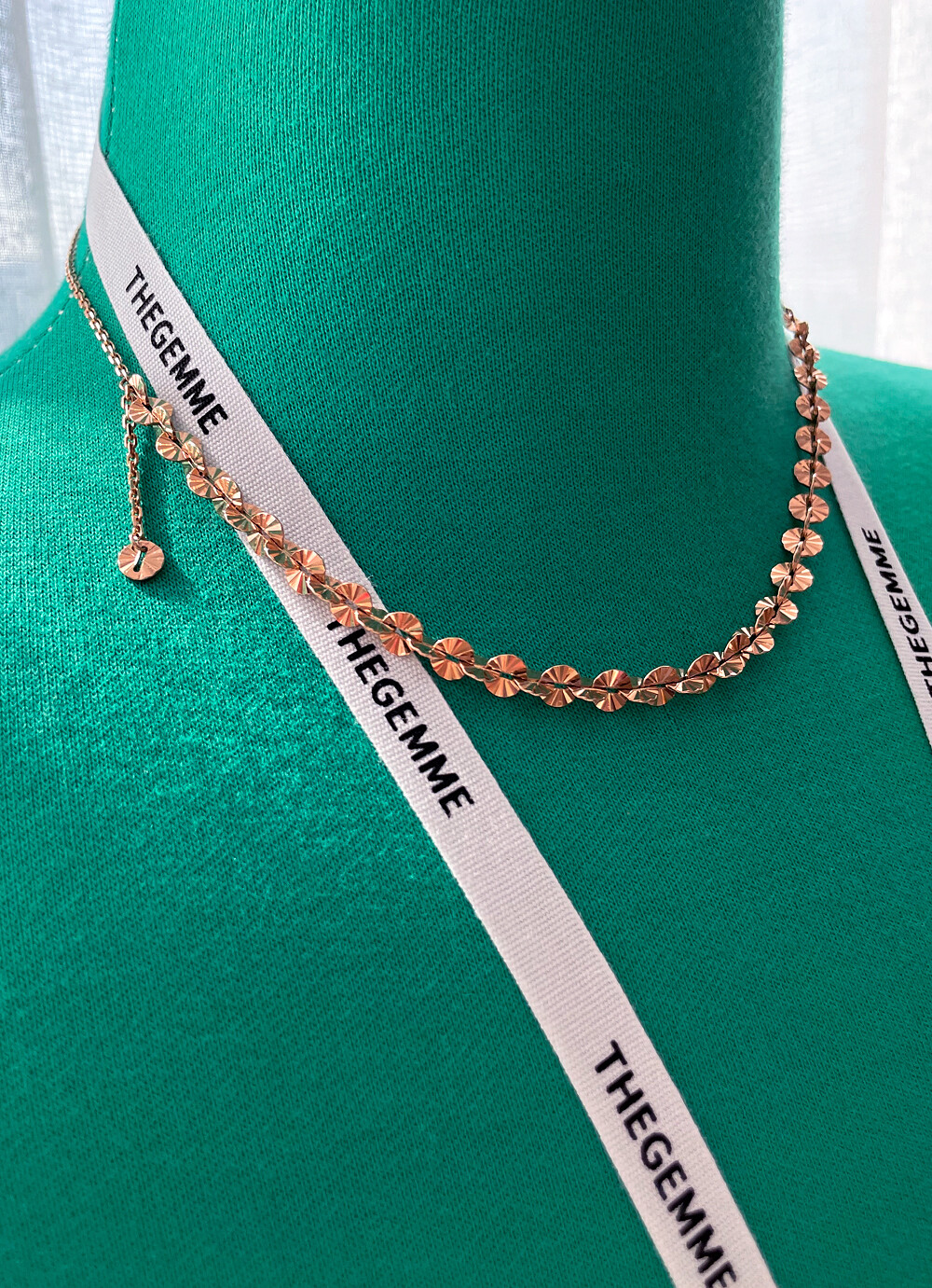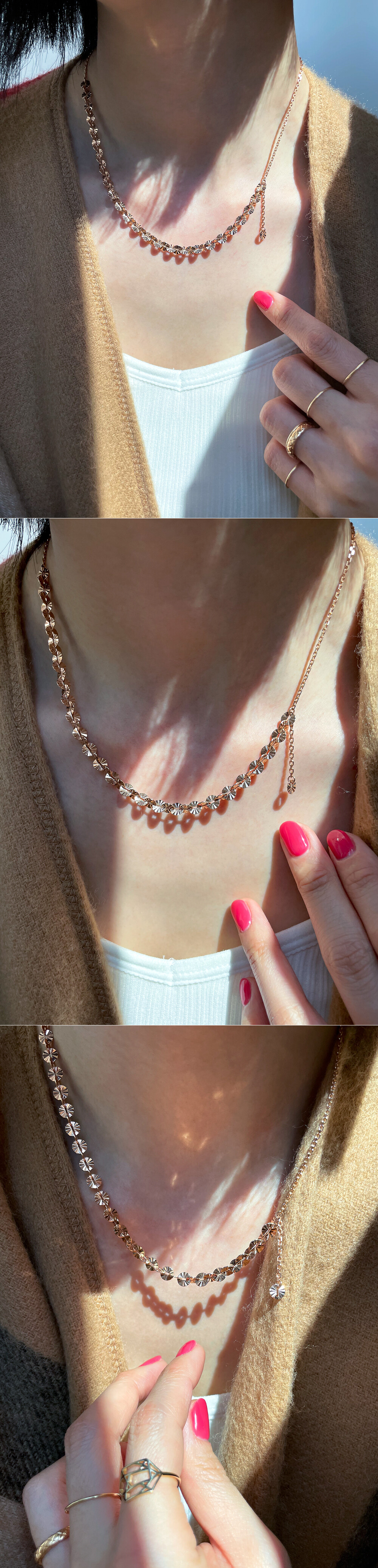 팅클팅클, ✨ 각도에 따라 반짝이는 빛이 유독 눈에 들어오는 디자인의 목걸이입니다. 동그랗고 플랫한 원형의 코인 디자인이 십자 형태로 볼륨감 있게 연결된 링크 목걸이에요. 사이드 부분에는 체인이 달린 드롭 스타일 팬던트가 포인트로 들어가 있구요, 잠금 장식 부분에는 깜찍한 별 모양 디자인이 들어간 붕어 장식이 있답니다! 붕어 장식은 기본 붕어 장식보다 2배 정도 사이즈가 더 큰 장식이에요. 🤩 전체적으로 유니크한 느낌이 강하죠? 중량감이 높아서 착용 시 묵직~한 느낌이 있어요. 볼륨감이 넘쳐서 존재감 확실한 목걸이 ... 볼드한 초커 스타일 목걸이로 착용하셔도 예쁠 것 같아요. 중앙 부분을 제외한 잠금 장식까지 연결된 체인은 각줄이구요, 약 7푼 정도 굵기의 체인입니다. 굵직굵직한 목걸이를 좋아하시는 분들에게 추천해 드릴게요, !🙌🏼💖