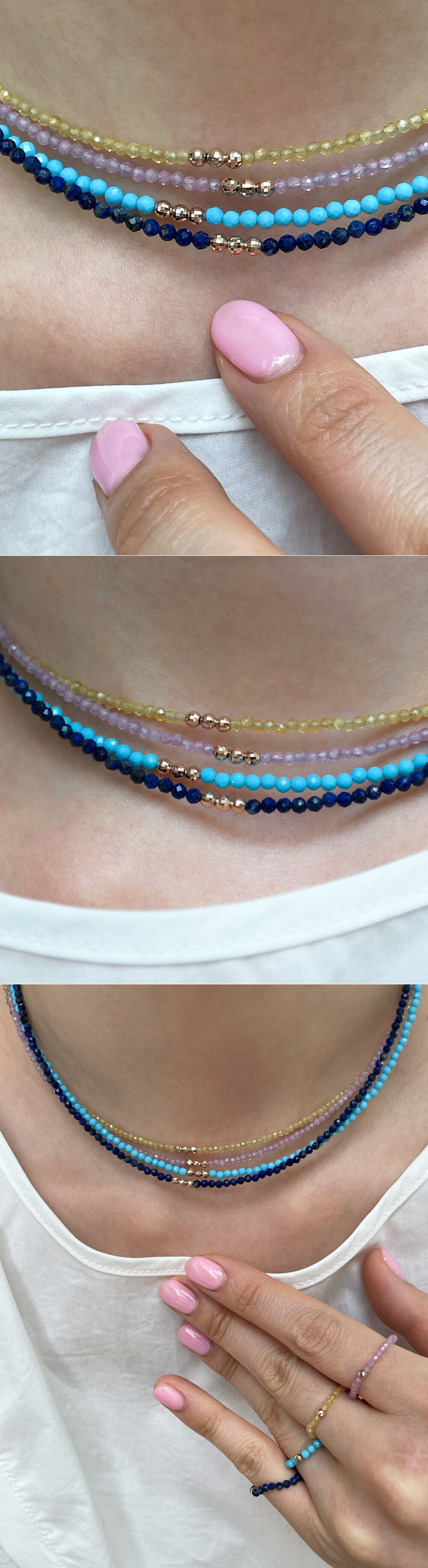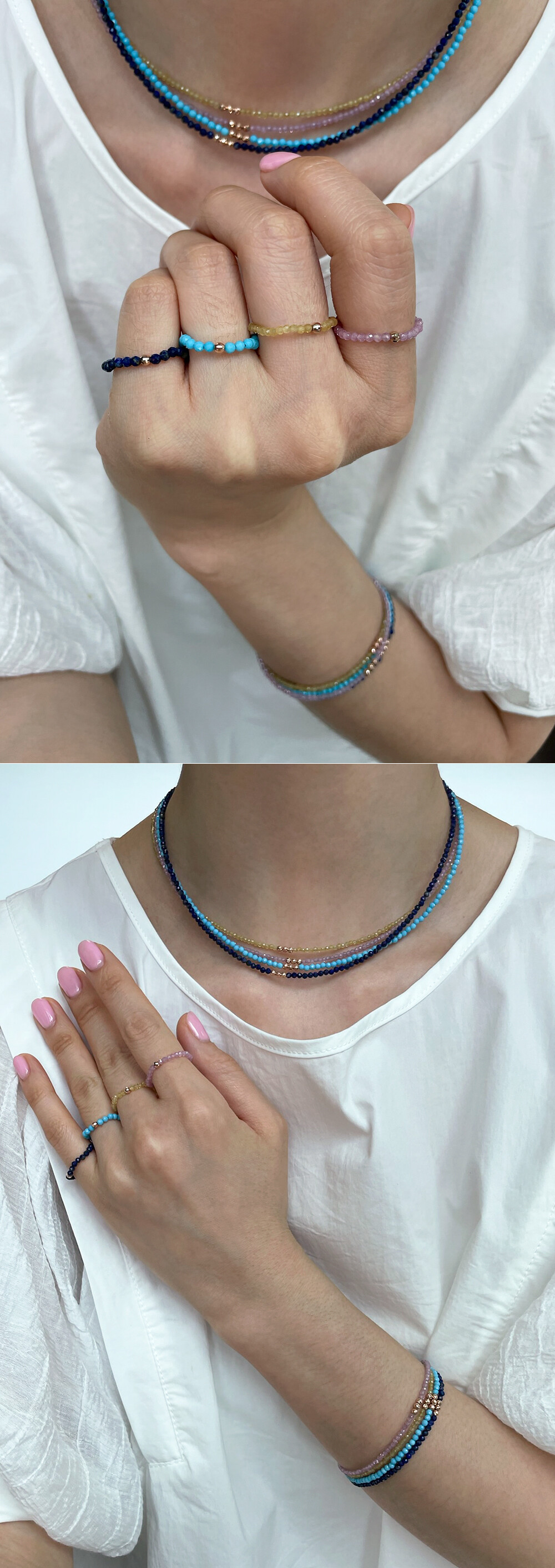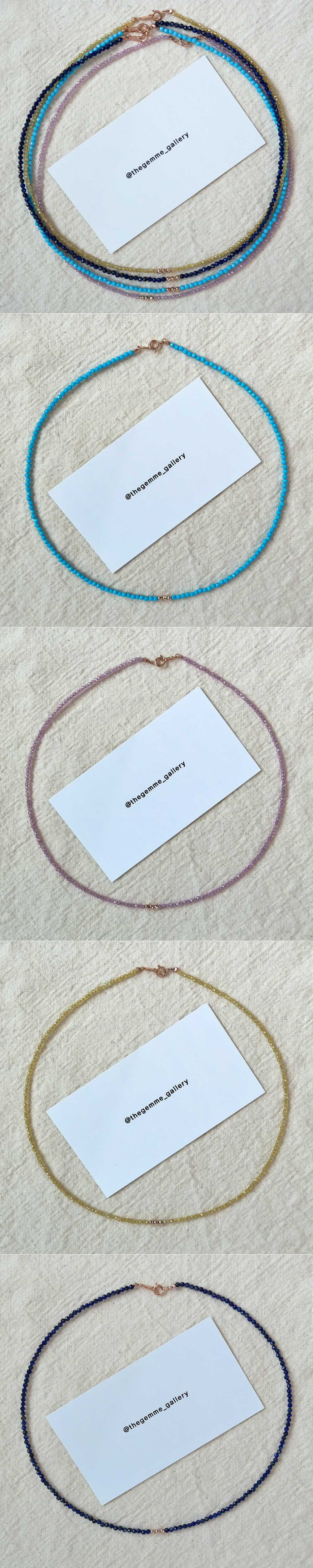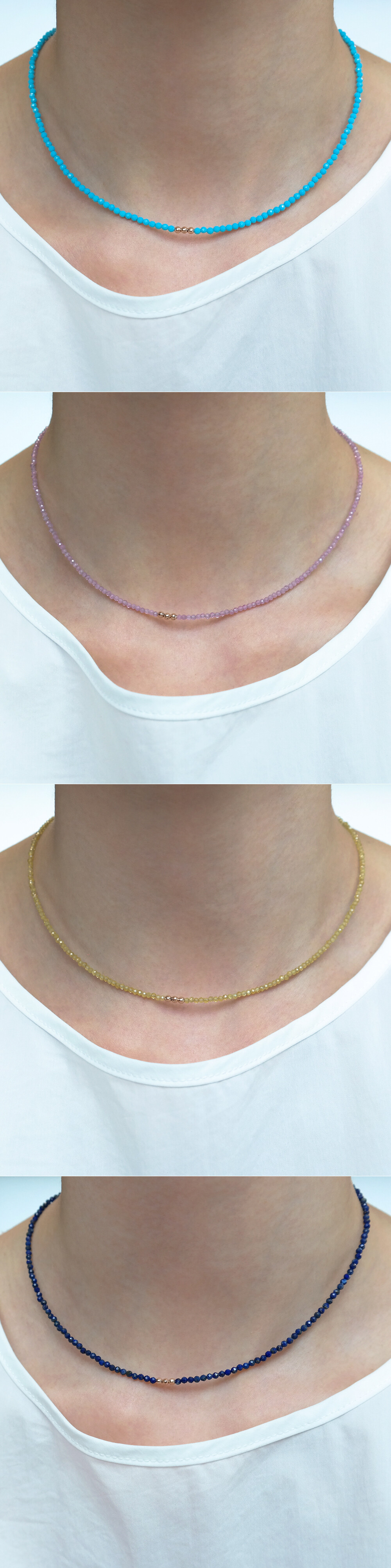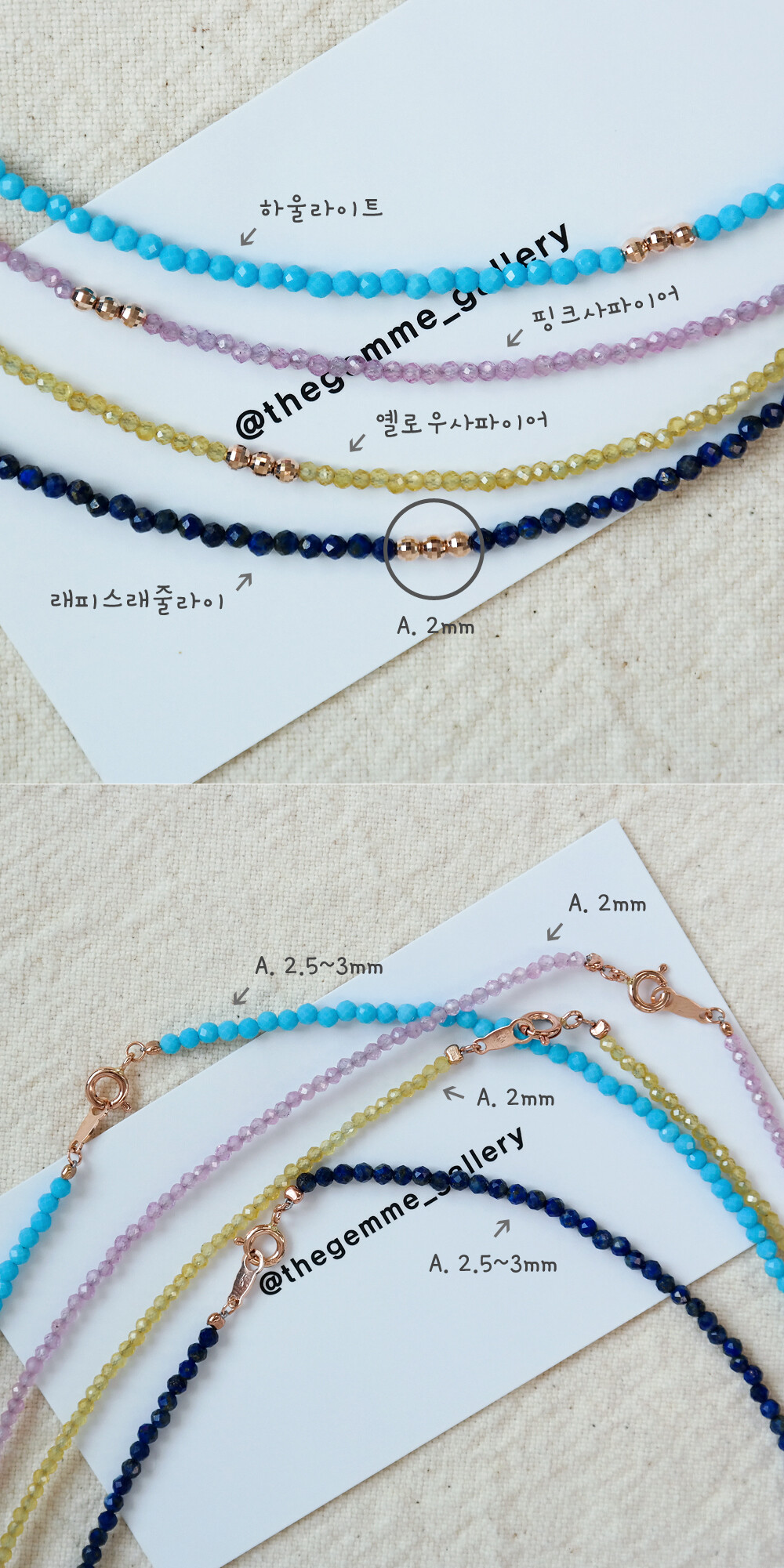 블리블리하고 화사한 느낌으로 착용하시기 좋은 원석 목걸이입니다, !!!!! ❤️ 론델컷으로 컷팅된 원석에 14K 컷팅 볼이 포인트로 들어간 비즈 목걸이에요. 원석은 하울라이트, 사파이어 (옐로우 & 핑크), 래피스래줄라이 원석입니다. 약 2~3mm 사이즈의 원석이구요, 원석에 따라서 아주 약간씩은 사이즈가 상이하니 자세한 사이즈는 상세 사이즈 이미지에서 확인해 주세요. ☺️ 원석 종류에 따라서 가격도 조금씩 차이가 있어요~ 자세한 가격은 옵션에서 확인! 😛 :) 와이어로 꿰어놓은 목걸이라 얇아도 탱탱한 라인을 유지합니다. (내부에 연결된 와이어를 제외한 모든 금속은 14K로 제작되었습니다.) 라인이 동그랗게 딱 나오기 때문에 초커 스타일로 약간 짧게 착용하는 게 더 예쁜 것 같구요, 여기저기 다른 목걸이들과 레이어드해도 다 잘 어울린답니다! 데일리 및 포인트 목걸이로 추천해 드려요! 👍🏼