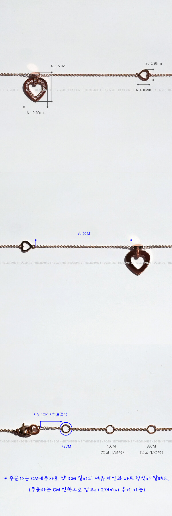 이미지상 샘플 목걸이는 42CM (38/40CM영고리포함) 촬영 사진입니다. (따로 여유 고리는 추가되지 않습니다.) * 이 제품은 주문하는 CM에 추가로 약 1CM 길이의 여유 체인과 하트 장식이 달려요. 주문하시는 CM의 안쪽으로는 영고리 2개가 기본으로 들어갑니다. (영고리 CM 지점은 직접 입력해주세요.)