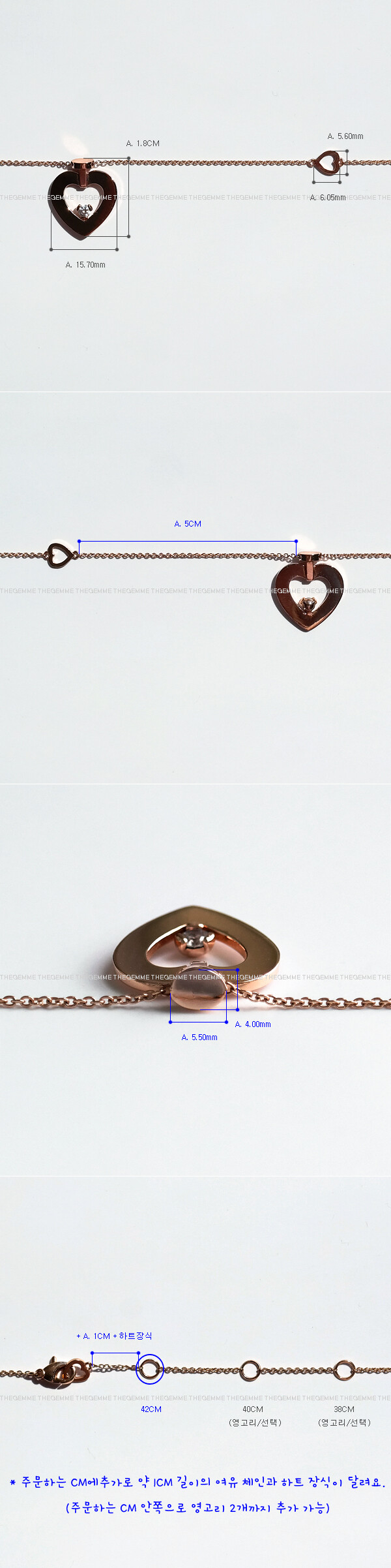 이미지상 샘플 목걸이는 42CM (38/40CM영고리포함) 촬영 사진입니다. (따로 여유 고리는 추가되지 않습니다.) * 이 제품은 주문하는 CM에 추가로 약 1CM 길이의 여유 체인과 하트 장식이 달려요. 주문하시는 CM의 안쪽으로는 영고리 2개가 기본으로 들어갑니다. (영고리 CM 지점은 직접 입력해주세요.)