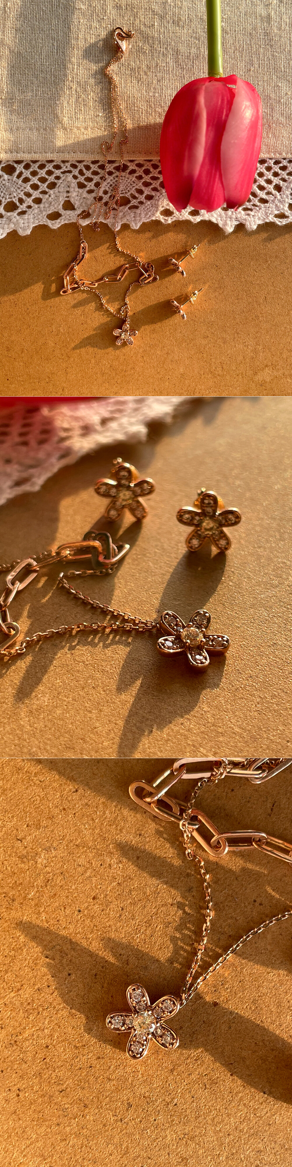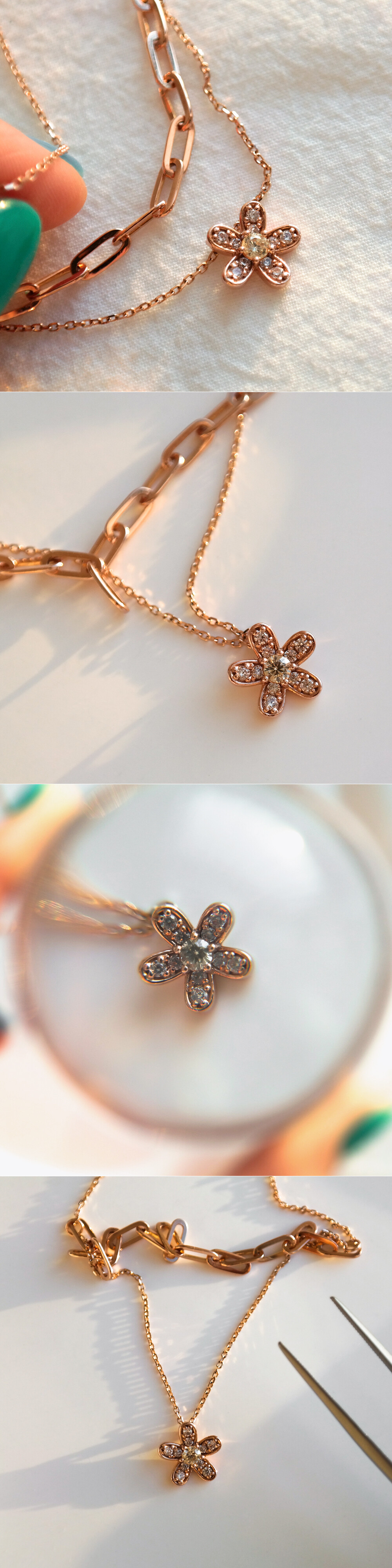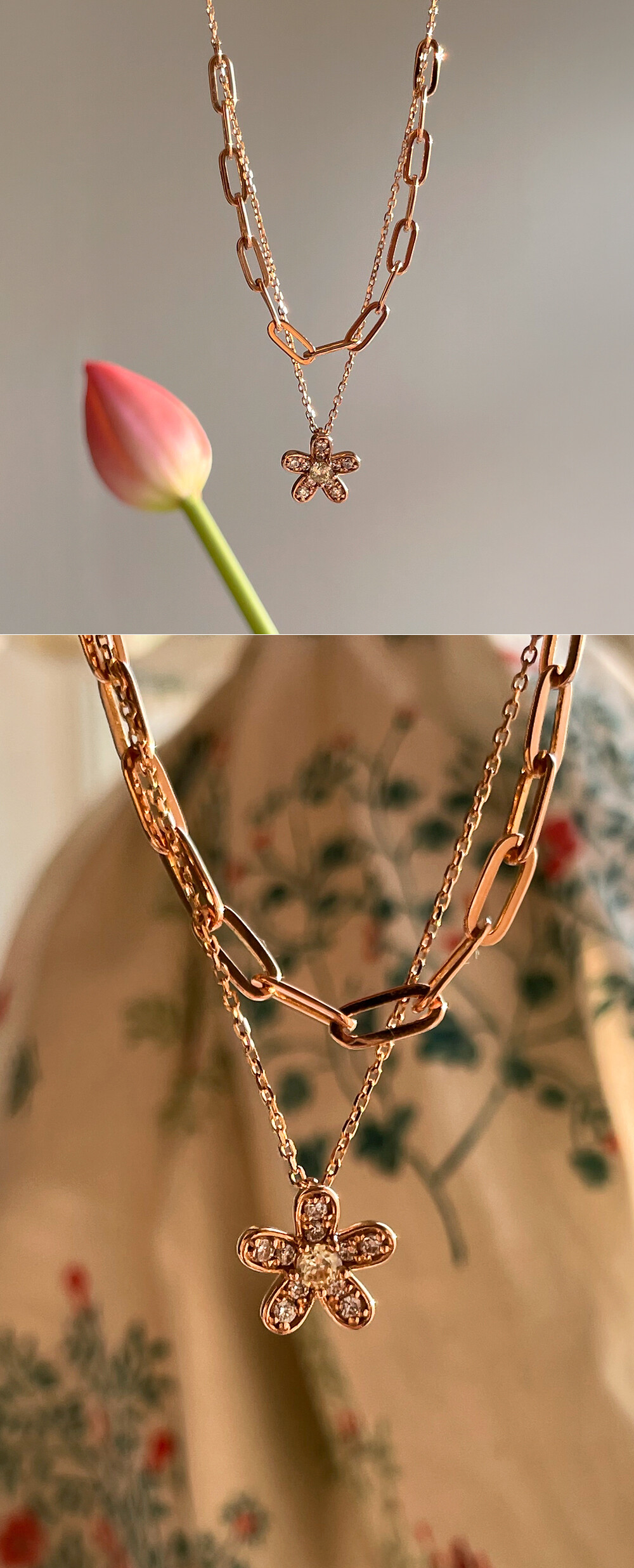 사랑스러운 플라워 장식의 목걸이입니다. 🌼💛 중앙 장식에 믹스 체인 디자인 포인트를 더해 유니크한 느낌을 살린 목걸입니다. 전체적으로 볼륨감이 있으면서 디테일한 디자인으로 고급스러운 느낌이 가득한 아이에요. 팬던트 장식은 전체 큐빅이 세팅된 디자인이구요, 플라워 중앙에 세팅된 밝은 옐로우 빛깔의 스톤은 라이트 옐로우 큐빅입니다. (옵션에서 전체 화이트(투명) 큐빅으로 변경 가능합니다.) 사랑스럽고 고급스러운 디자인의 목걸이를 찾으시는 분들께 포인트 목걸이로 추천해 드릴게요. 😉💖