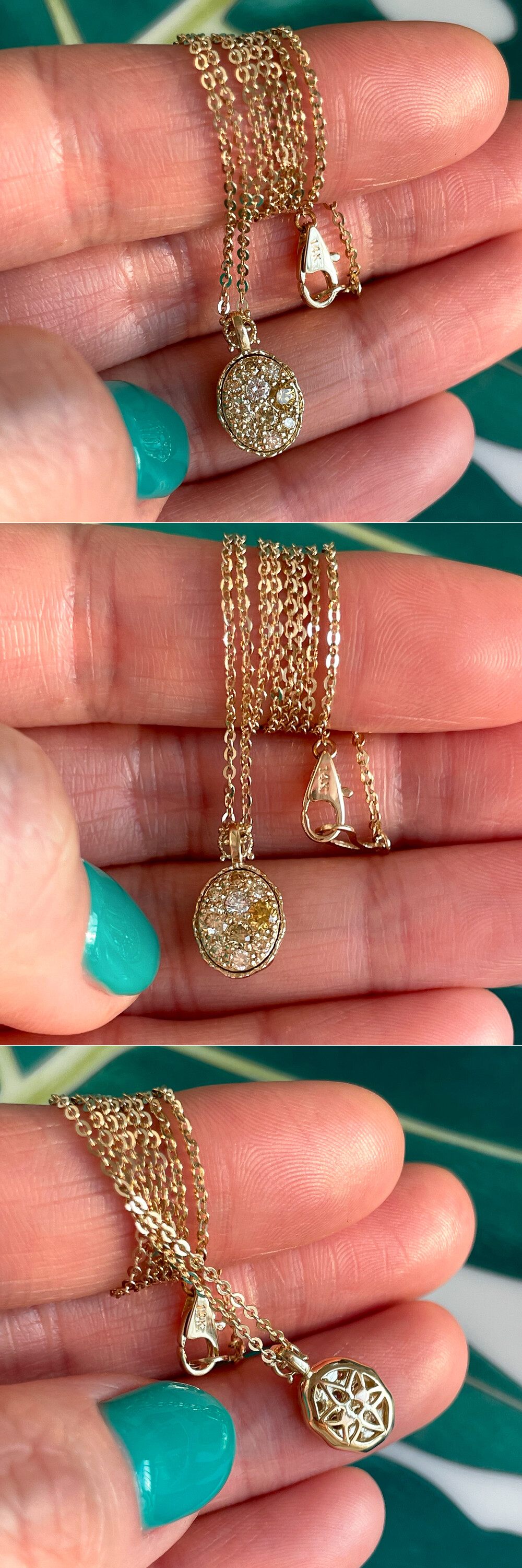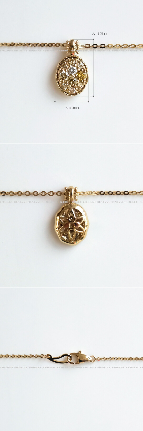 밝고 화사한 빛깔의 옐로우 다이아몬드가 세팅된 목걸이입니다. 🌼💛✨ 다양한 빛깔을 가진 내추럴 옐로우 다이아몬드들이 고루고루 세팅되어 있어서, 뭐랄까 .. 천연 다이아몬드의 고급스럽고 우아한 금빛을 그대로 머금고 있는 것 같은 느낌이에요. 팬던트 헤드 부분도 은은하고 섬세한 레이스 디자인으로 마감되어 여리여리한 느낌으로 여성적인 이미지를 연출하시고 싶으신 분들께 좋을 것 같아요. 스톤이 세팅된 부분이나 프롱 등 마감 상태도 깔끔하고 정결하게 잘 정돈되어 있는 디자인으로 전체적인 디자인 퀄리티가 너무 좋은 제품이라고 칭찬할게요. 아름다운 빛깔의 다이아몬드 목걸이를 찾으시는 분들께 데일리 및 포인트 목걸이로 추천해 드릴게요 :) 💖