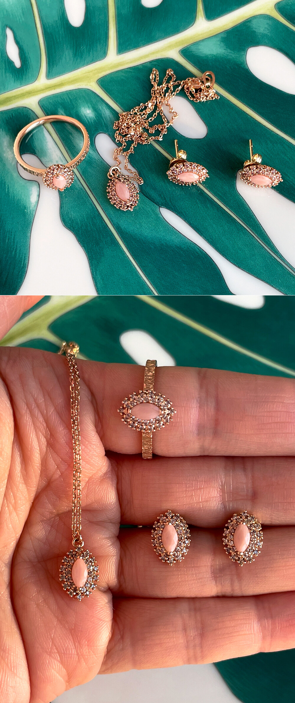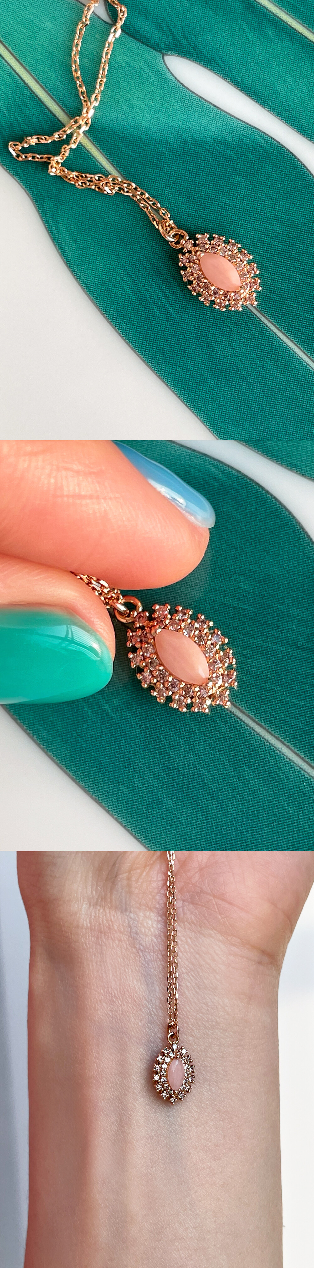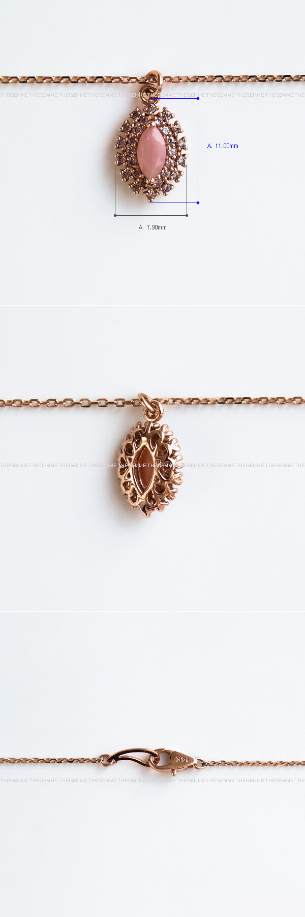 반짝반짝~ ✨ 사랑스럽고 러블리한 컬러를 가진 핑크 오팔 목걸이입니다. 💍 귀한 마퀴즈 쉐입의 패시티드 핑크 오팔이 메인으로 세팅된 헤일로 디자인의 목걸이로, 서브 스톤으로는 아주 은은한 브라운~그레이 톤의 흐린 코냑 컬러의 큐빅이 세팅되었어요. 자세히 눈여겨보지 않으면 일반 화이트(투명) 한 컬러의 큐빅처럼 보이기도 합니다! 😃 큐빅 사이즈가 작아서 육안으로 보았을 때는 보통의 화이트 큐빅과 아주 큰 색 차이는 없어 보이지만 코냑 컬러 큐빅입니다. 민감하신 분들을 위해 기본 화이트(투명) 큐빅으로 변경하실 수 있도록 옵션을 만들어 놓았으니 큐빅 색상 변경을 원하시는 분들은 옵션에서 선택하여 변경해 주세요. 🩷 작지만 섬세한 디자인으로 전체적으로 고급스러움이 느껴집니다. 자세한 디자인은 영상을 통해서 확인해 주세요. 작지만 화려한 이미지를 뽐내는 디자인으로 특별한 날에 착용하실 포인트 목걸이를 찾으시는 분들께 추천해 드릴게요! 👏🏼