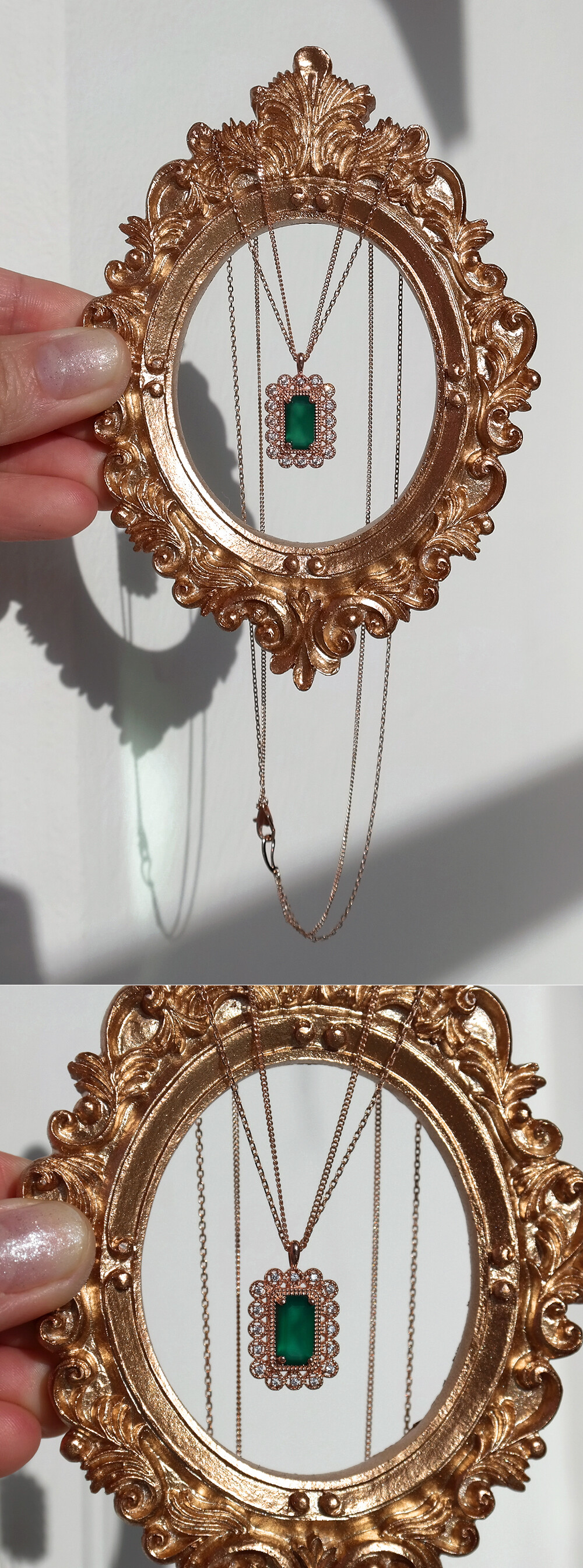 프렌치 감성을 가진 여성스럽고 고급스러운 디자인의 오닉스 목걸이입니다. 차분한 느낌을 주는 딥 그린 컬러의 에메랄드컷 그린 오닉스가 메인 스톤으로 세팅되었구요, 화이트 큐빅이 함께 조화를 이루었습니다. 💚 체인은 두 줄 스타일로~ 3푼 굵기의 각줄과 민줄이 함께 레이어드 되었어요. 멋스러운 유니크함이 느껴지시죠? 팬던트 장식 역시, 오밀조밀~ 전체적으로 세심한 디테일과 함께 볼륨감까지 있어서 보면 볼수록 고급스러운 느낌을 주는 아이랍니다. 🙌🏼 세팅된 그린 오닉스의 경우, 반투명한 투명도를 가진 원석이라 햇빛이 투과될 때와 투과되지 않을 때의 밝기가 달라 보이니 이 점도 참고해 주시기 바랍니다. 흔하지 않은 디자인으로, 차분하고 우아한 매력을 연출하시고 싶으신 분들께 데일리 및 포인트 목걸이로 추천해 드릴게요! 🫶🏼