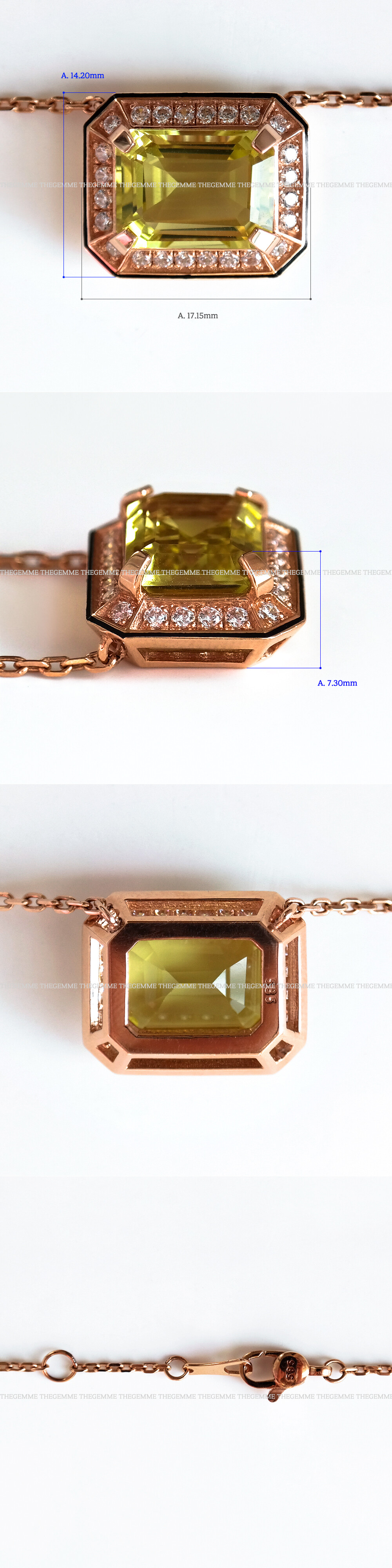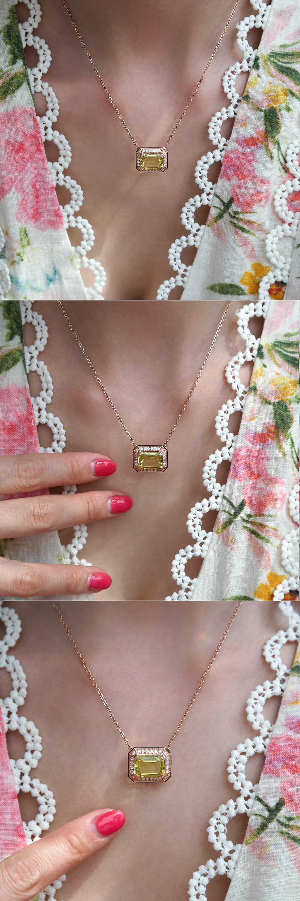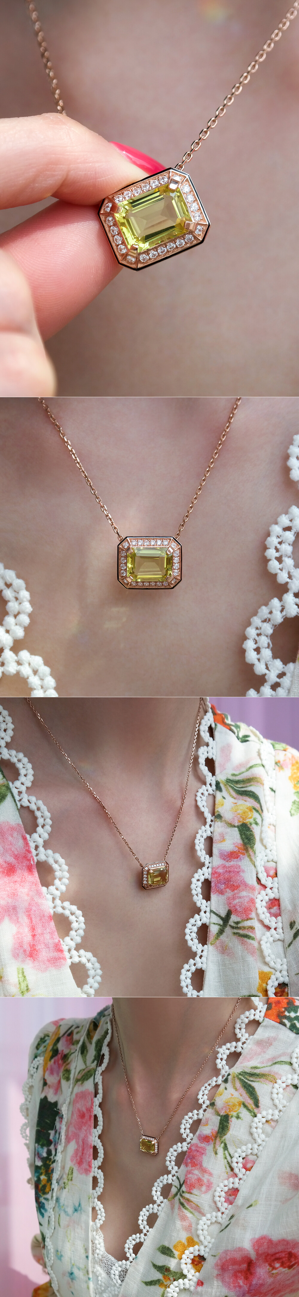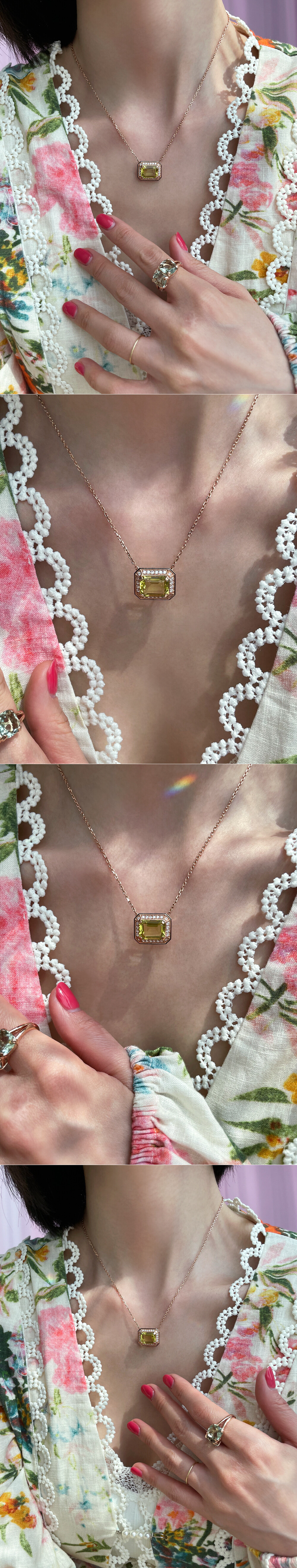싱그러운 자연의 풀잎 색도를 가진 베소나이트라는 스톤이 메인으로 세팅된 목걸이입니다. 사실, 이 베소나이트? 라고 불리는 스톤은 제가 유색 보석 공부를 오래 했음에도 불구하고 처음 만나보는 아주 생소한 이름의 스톤이었는데요, 알아보니 이 스톤은 이탈리아 화산에서 처음 발견되었다고 해요. 이 스톤을 처음 보았을 때는 페리도트와 색도가 너무 비슷해서 페리도트인줄 알았답니다. 처음 보는 이 스톤에 대해 궁금증을 참지 못하고 저를 가르치셨던 GIA (보석 학자) 교수님께도 여쭤보았는데, 교수님께서도 익숙하지 않은 스톤이라고 하시면서 아마 아이도크레이즈 (Idocrase) 의 일종인 것 같다고 하시더라구요! 그래서 백과사전을 찾아보니 화산에서 발견된 "베수비아나이트 (Vesuvianite)" 라는 이름을 가진 광물 중 하나라는 것을 알게 되었어요. (명명시 광물학적 명칭은 달라질 수 있습니다.) 저희 보석 학자들에게도 익숙하지 않은 스톤이라 아마 많은 분들께서 궁금해 하실까봐 관련 정보 전해드려요 :) 요즘에는 힐링 스톤이라고 해서 사람들에게 조금씩 알려지고 있는 스톤인 것으로 확인되었어요. 그리고 베수비아나이트는 이 색상 이외에도 다양한 색상을 가지고 있다고 해요. 다만, 풀색이라고 하죠? 이런 은은하고 차분한 풀색을 닮은 그린 색도의 베수비아나이트가 그나마 시장에서 많이 인지하고 있는 컬러인것 같아요. 위에서 말씀드렸다시피 색도는 페리도트와 비슷하고, 높은 투명도와 고급스러운 톤의 그린 색도가 돋보이는 스톤입니다. 차분한 느낌의 그린 색도를 좋아하시는 분들께 추천해 드리면 좋을것 같아요. 좀처럼 흔하지 않은 아주 큰 사이즈의 패시티드 스톤이 세팅되는 목걸이구요, 메인 스톤은 약 9X12 사이즈의 스톤이, 서브 스톤으로는 화이트 큐빅이 세팅됩니다. 압도적인 스톤 사이즈와 이 스톤만이 가지는 아름다운 빛깔로 저절로 시선이 가는 목걸이 되실거에요! 참고로, 이 목걸이는 팬던트 사이즈가 크기 때문에 40대 여성분들부터 추천해 드릴게요. 풍부한 그린 색감과 고급스러운 디자인으로 포인트로 착용하실 스톤 목걸이를 찾으시는 분들에게 강추해 드려요. 💚