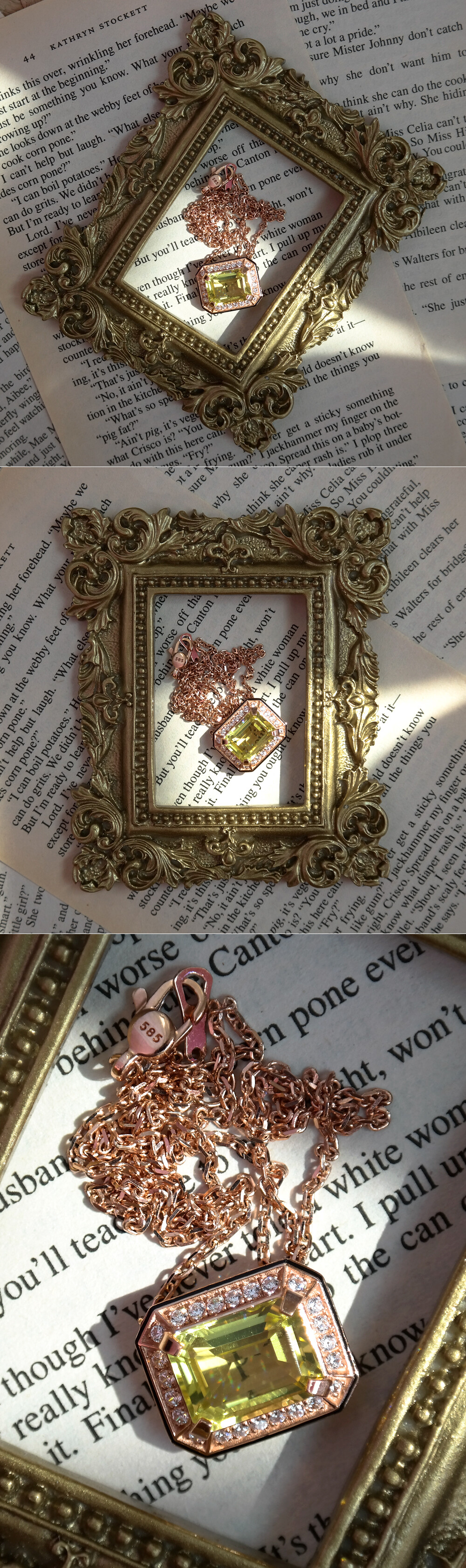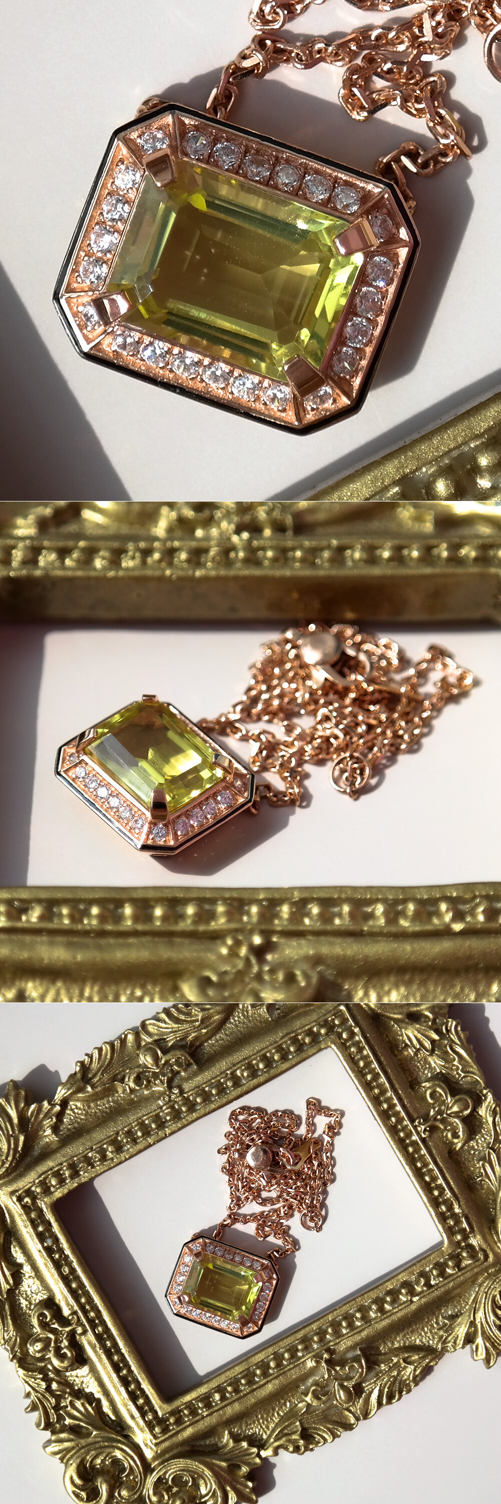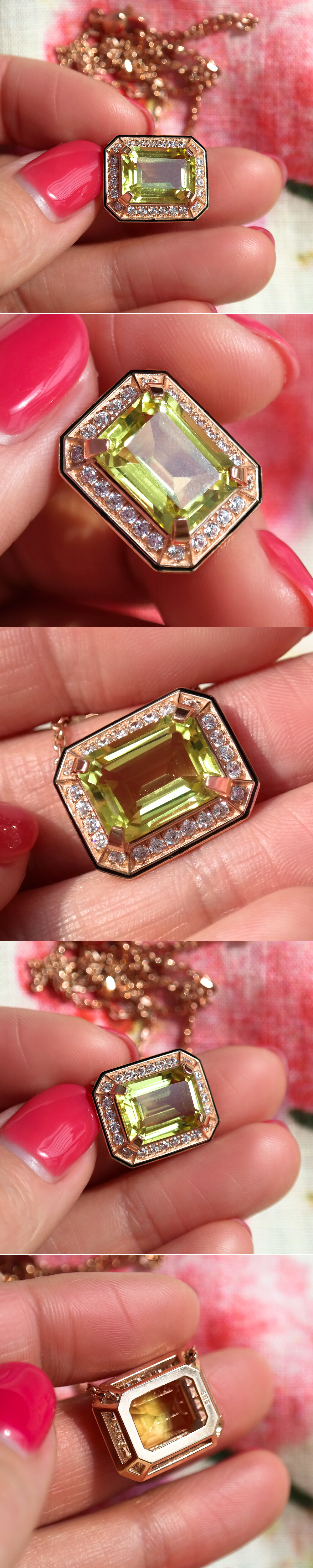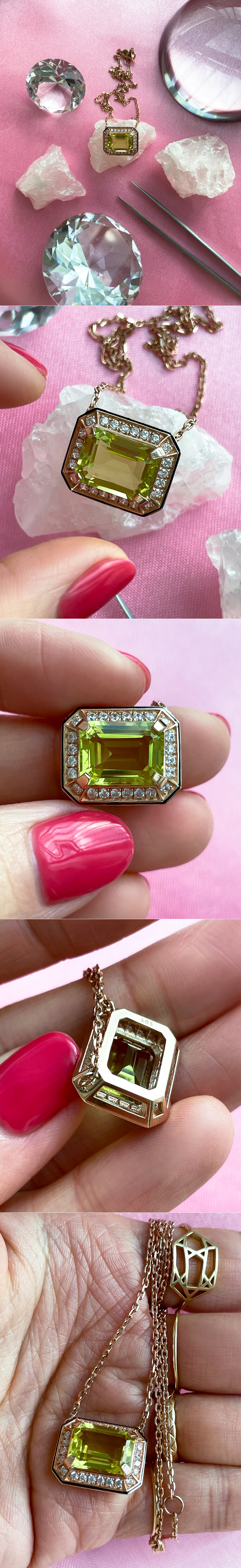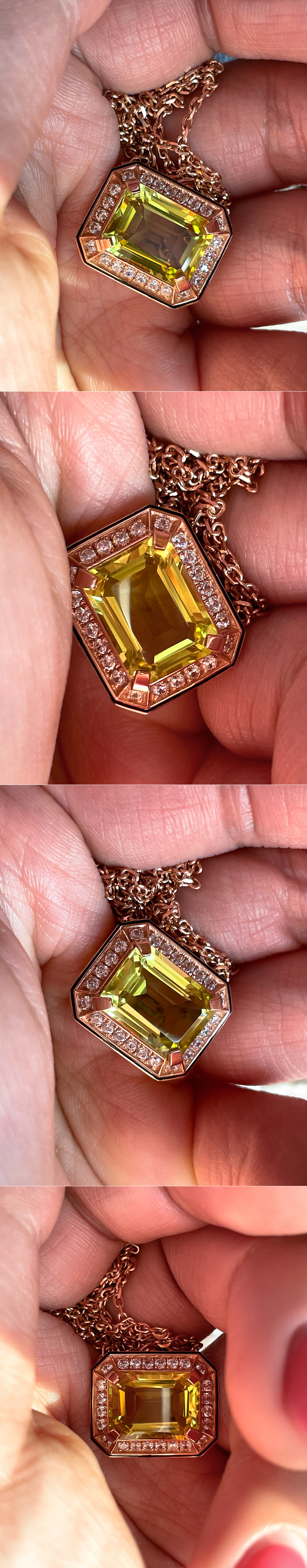 싱그러운 자연의 풀잎 색도를 가진 베소나이트라는 스톤이 메인으로 세팅된 목걸이입니다. 사실, 이 베소나이트? 라고 불리는 스톤은 제가 유색 보석 공부를 오래 했음에도 불구하고 처음 만나보는 아주 생소한 이름의 스톤이었는데요, 알아보니 이 스톤은 이탈리아 화산에서 처음 발견되었다고 해요. 이 스톤을 처음 보았을 때는 페리도트와 색도가 너무 비슷해서 페리도트인줄 알았답니다. 처음 보는 이 스톤에 대해 궁금증을 참지 못하고 저를 가르치셨던 GIA (보석 학자) 교수님께도 여쭤보았는데, 교수님께서도 익숙하지 않은 스톤이라고 하시면서 아마 아이도크레이즈 (Idocrase) 의 일종인 것 같다고 하시더라구요! 그래서 백과사전을 찾아보니 화산에서 발견된 "베수비아나이트 (Vesuvianite)" 라는 이름을 가진 광물 중 하나라는 것을 알게 되었어요. (명명시 광물학적 명칭은 달라질 수 있습니다.) 저희 보석 학자들에게도 익숙하지 않은 스톤이라 아마 많은 분들께서 궁금해 하실까봐 관련 정보 전해드려요 :) 요즘에는 힐링 스톤이라고 해서 사람들에게 조금씩 알려지고 있는 스톤인 것으로 확인되었어요. 그리고 베수비아나이트는 이 색상 이외에도 다양한 색상을 가지고 있다고 해요. 다만, 풀색이라고 하죠? 이런 은은하고 차분한 풀색을 닮은 그린 색도의 베수비아나이트가 그나마 시장에서 많이 인지하고 있는 컬러인것 같아요. 위에서 말씀드렸다시피 색도는 페리도트와 비슷하고, 높은 투명도와 고급스러운 톤의 그린 색도가 돋보이는 스톤입니다. 차분한 느낌의 그린 색도를 좋아하시는 분들께 추천해 드리면 좋을것 같아요. 좀처럼 흔하지 않은 아주 큰 사이즈의 패시티드 스톤이 세팅되는 목걸이구요, 메인 스톤은 약 9X12 사이즈의 스톤이, 서브 스톤으로는 화이트 큐빅이 세팅됩니다. 압도적인 스톤 사이즈와 이 스톤만이 가지는 아름다운 빛깔로 저절로 시선이 가는 목걸이 되실거에요! 참고로, 이 목걸이는 팬던트 사이즈가 크기 때문에 40대 여성분들부터 추천해 드릴게요. 풍부한 그린 색감과 고급스러운 디자인으로 포인트로 착용하실 스톤 목걸이를 찾으시는 분들에게 강추해 드려요. 💚