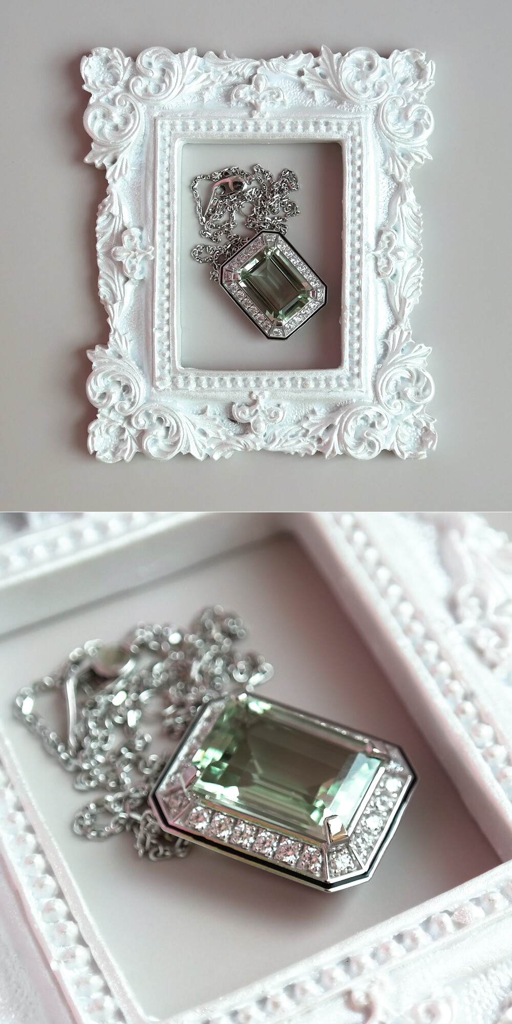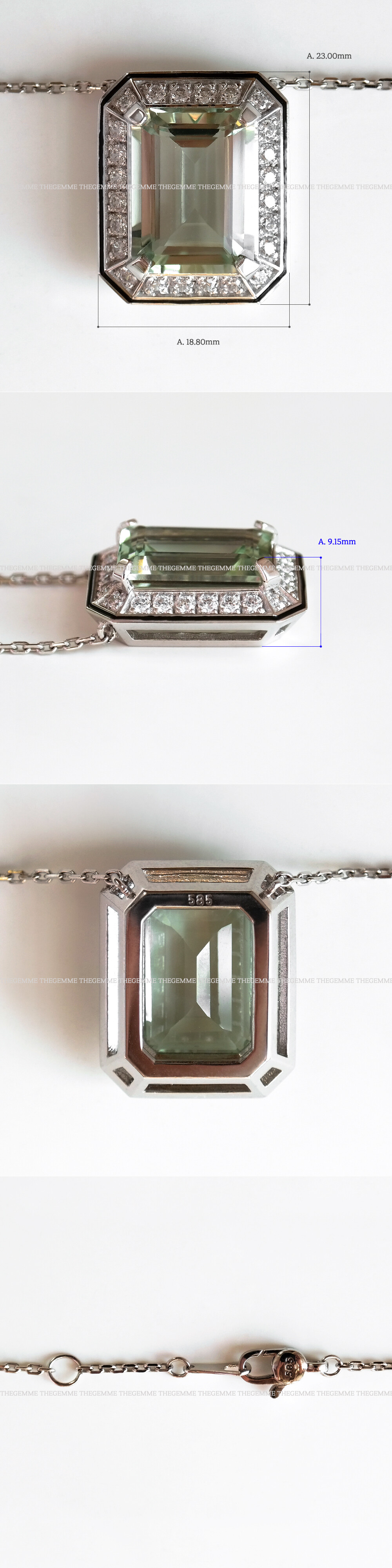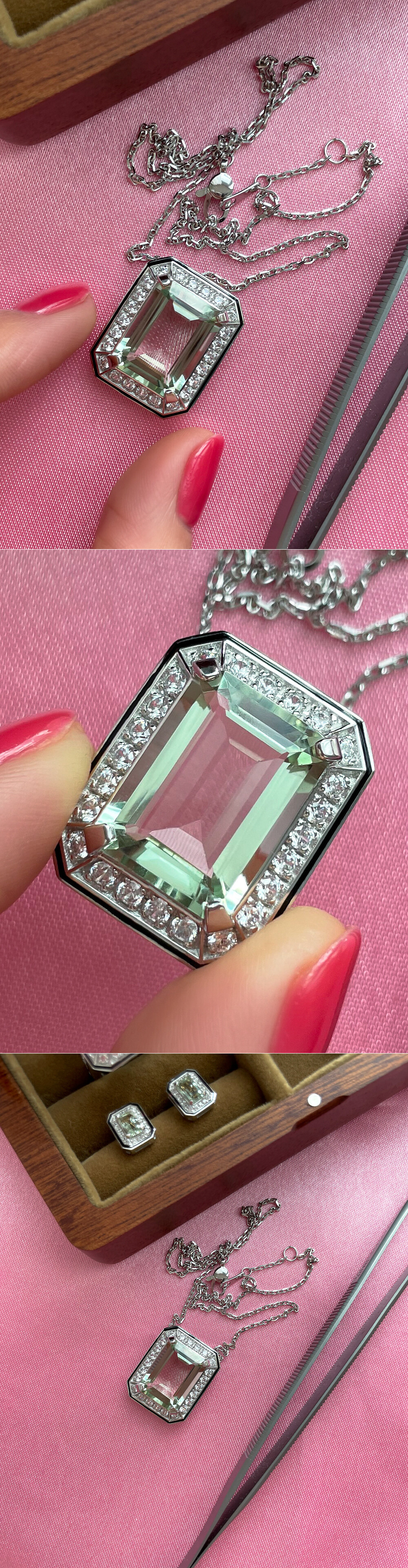 은은하고 청아한 그린 빛깔의 아름다움을 머금고 있는 그린 쿼츠 (그린 자수정) 목걸이입니다. 💍 좀처럼 흔하지 않은 아주 큰 사이즈의 패시티드 스톤이 세팅되는 목걸이구요, 메인 스톤은 약 12X16 사이즈의 스톤이, 서브 스톤으로는 화이트 큐빅이 세팅됩니다. 그린 쿼츠는 우리가 흔히 알고 있는 자수정과 같은 쿼츠의 변종이기 때문에 시중에서는 그린 자수정이라고도 불리기도 해요. 또 다른 말로는 프라시오라이트라고도 알려져 있답니다. 자수정과 마찬가지로 2월의 탄생석이기도 하면서 성장, 번영, 풍요의 상징으로 여겨 특히 보석 애호가들에게 인기가 높은 보석 중에 하나이기도 해요. 또한, 투명감이 있는 밝은 녹색의 광채를 가지고 있는 것이 특징으로 ; 독특하고 눈에 띄는 주얼리를 찾는 사람들에게 추천해 드리고 있어요. 경도도 약 7 정도로 관리하기가 편해서 데일리 스톤 주얼리로 활용하시기에도 아주 좋답니다. 압도적인 스톤 사이즈와 그린 쿼츠만이 가지는 아름다운 빛깔로 저절로 시선이 가는 아이에요. 이 목걸이는 사이즈가 크기 때문에 40대 여성분들부터 추천해 드릴게요. 아름다운 스톤 색감과 고급스러운 디자인으로 포인트로 착용하실 스톤 목걸이를 찾으시는 분들께 강추해 드려요! 💚
