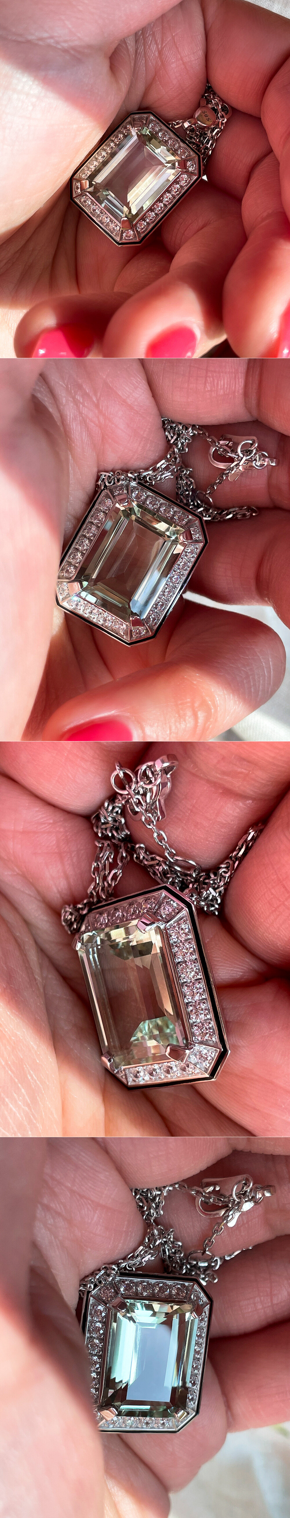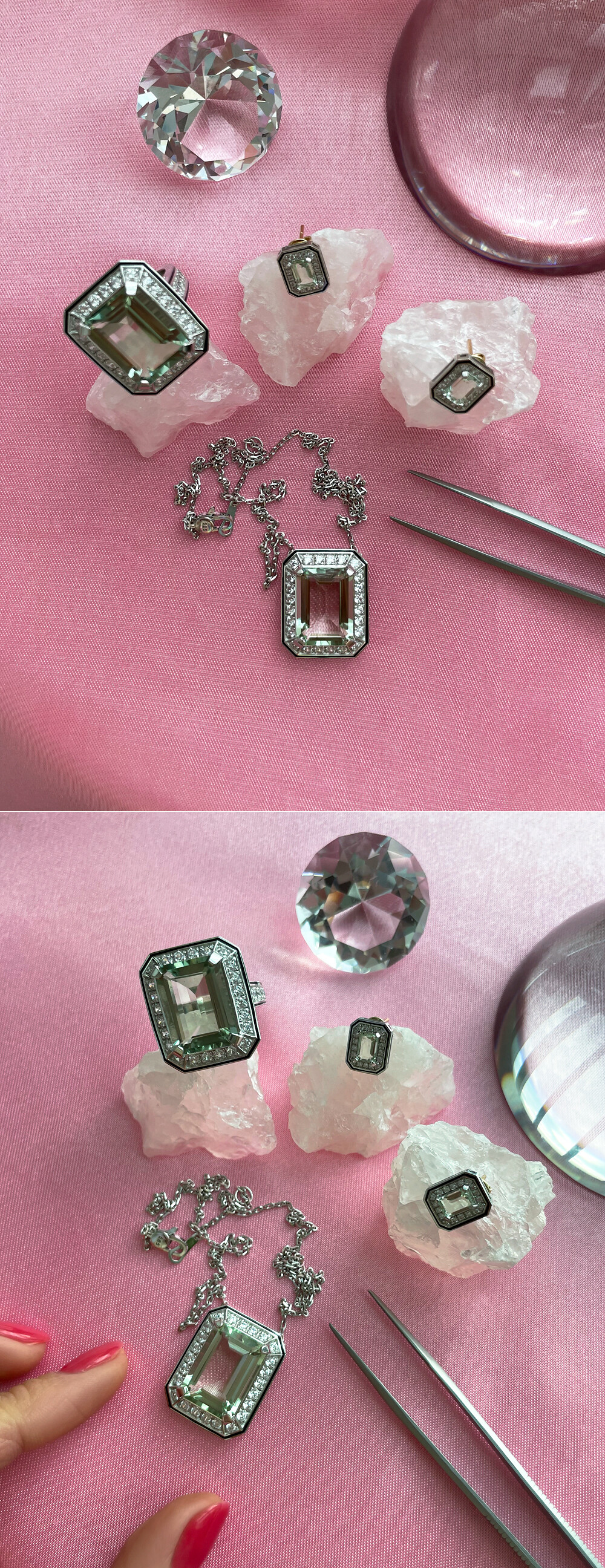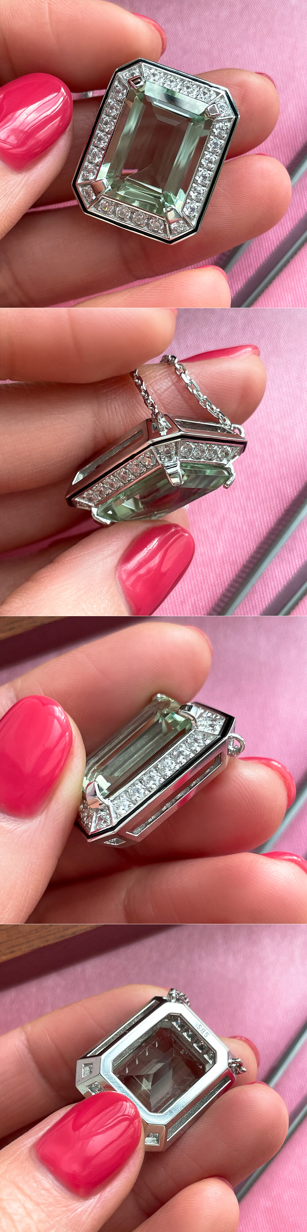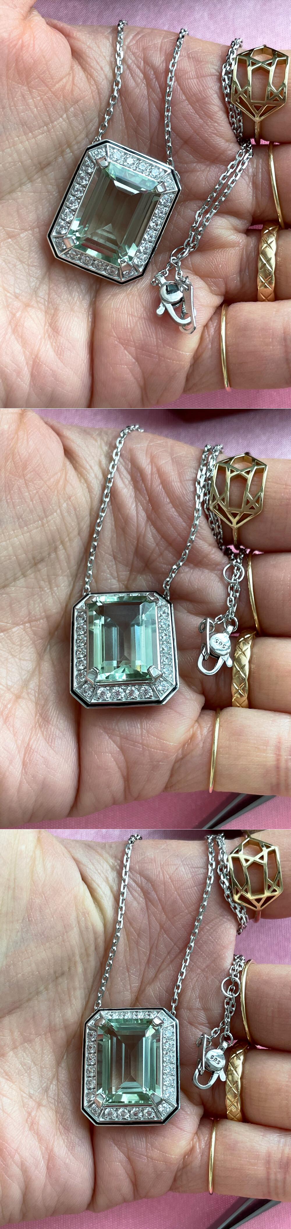 은은하고 청아한 그린 빛깔의 아름다움을 머금고 있는 그린 쿼츠 (그린 자수정) 목걸이입니다. 💍 좀처럼 흔하지 않은 아주 큰 사이즈의 패시티드 스톤이 세팅되는 목걸이구요, 메인 스톤은 약 12X16 사이즈의 스톤이, 서브 스톤으로는 화이트 큐빅이 세팅됩니다. 그린 쿼츠는 우리가 흔히 알고 있는 자수정과 같은 쿼츠의 변종이기 때문에 시중에서는 그린 자수정이라고도 불리기도 해요. 또 다른 말로는 프라시오라이트라고도 알려져 있답니다. 자수정과 마찬가지로 2월의 탄생석이기도 하면서 성장, 번영, 풍요의 상징으로 여겨 특히 보석 애호가들에게 인기가 높은 보석 중에 하나이기도 해요. 또한, 투명감이 있는 밝은 녹색의 광채를 가지고 있는 것이 특징으로 ; 독특하고 눈에 띄는 주얼리를 찾는 사람들에게 추천해 드리고 있어요. 경도도 약 7 정도로 관리하기가 편해서 데일리 스톤 주얼리로 활용하시기에도 아주 좋답니다. 압도적인 스톤 사이즈와 그린 쿼츠만이 가지는 아름다운 빛깔로 저절로 시선이 가는 아이에요. 이 목걸이는 사이즈가 크기 때문에 40대 여성분들부터 추천해 드릴게요. 아름다운 스톤 색감과 고급스러운 디자인으로 포인트로 착용하실 스톤 목걸이를 찾으시는 분들께 강추해 드려요! 💚