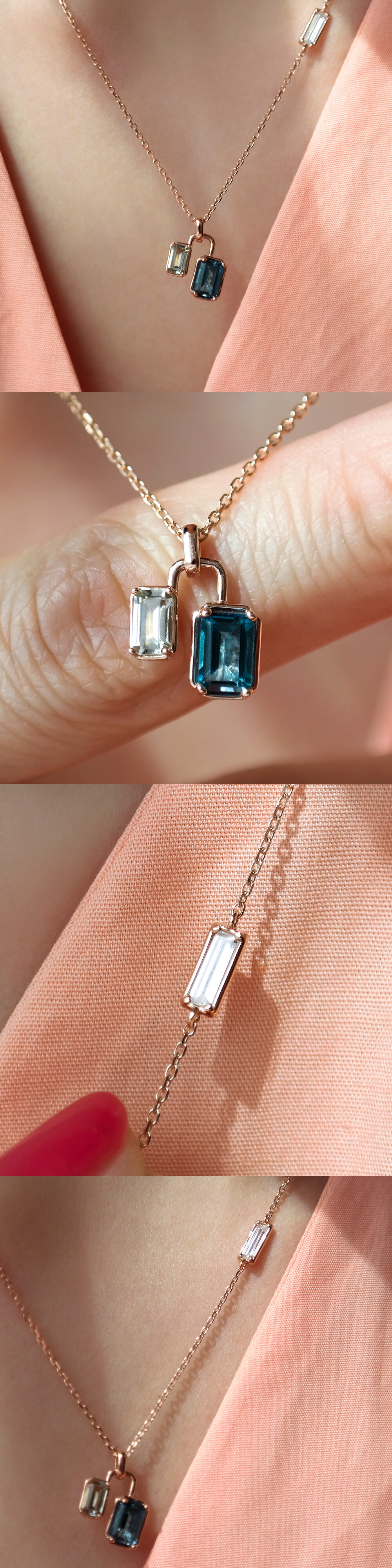 심플하면서도 우아한 매력을 지닌 스톤 목걸이입니다. 💍 팬던트 메인 스톤으로는 에메랄드컷의 쉐입을 가진 ; 차분하고 딥한 매력의 블루 컬러를 가진 런던블루 토파즈와 은은하고 옅은 빛깔의 그린 쿼츠가 함께 세팅되었구요, 체인 부분에는 바게트컷의 큐빅이 세팅되었습니다. 유니크한 디자인으로 포인트로 착용하실 스톤 목걸이를 찾으시는 분들께 추천해 드릴게요 :) 💙