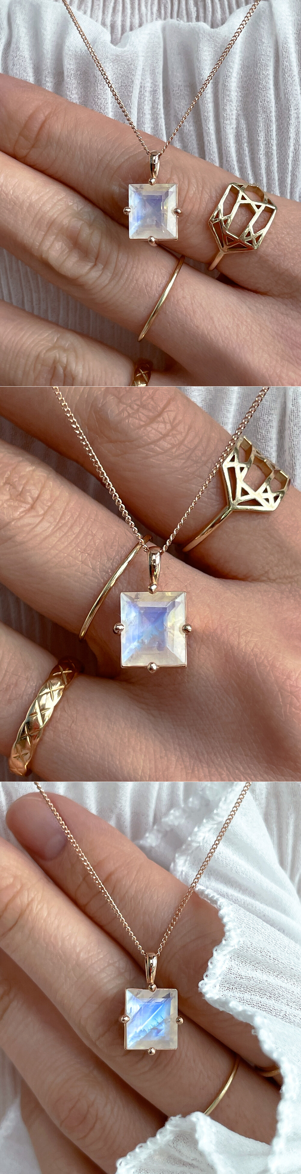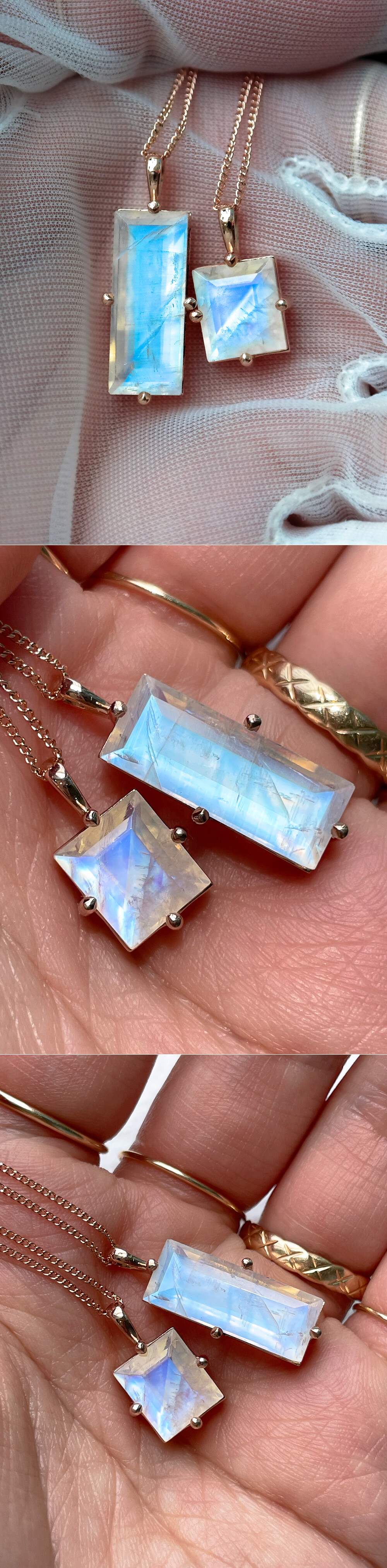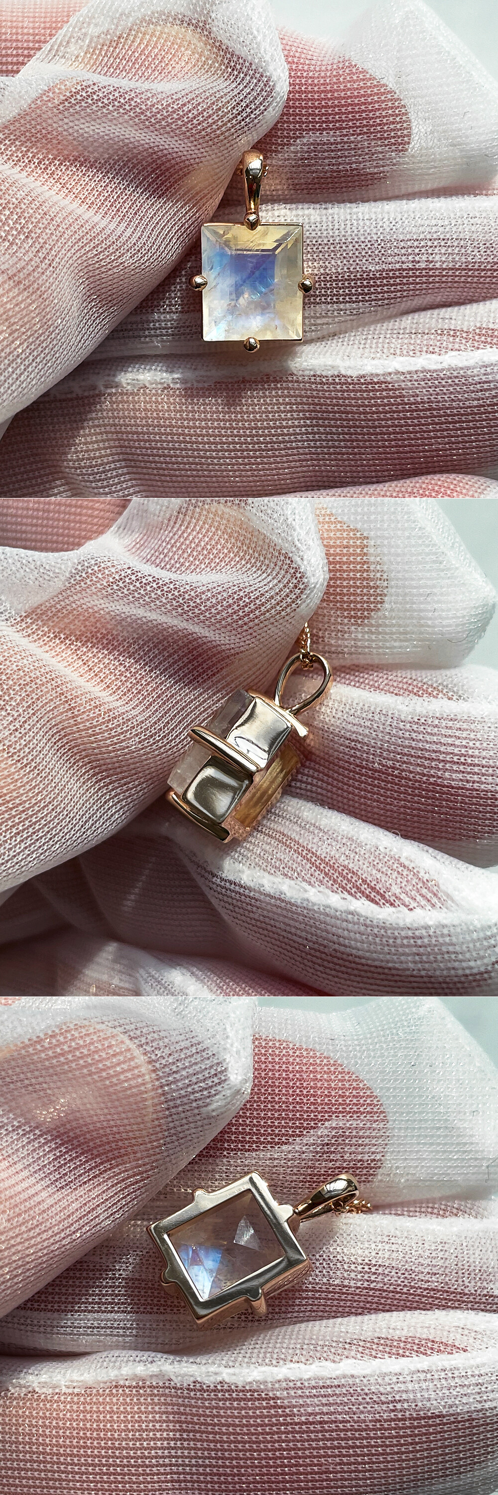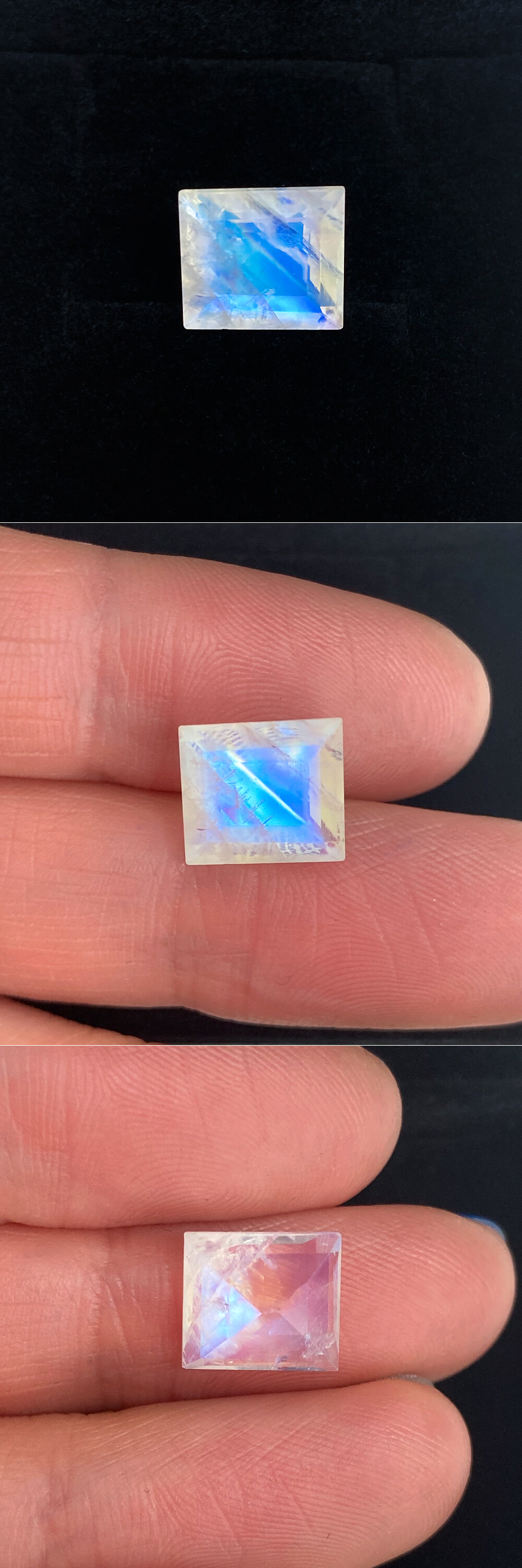 문스톤에서 이러한 블루빛 섬광을 나타내는 것을 아둘라레센스 효과라고 하는데 이는 문스톤만이 가지는 특유의 유색효과로, 이 아둘라레센스가 강하게 보여질수록 가치가 높게 평가됩니다. 문스톤도 유색효과가 있는 문스톤이 있고 그렇지 않은 문스톤이 있는데 유색효과를 띄는 문스톤이 가치가 훨씬 더 높답니다. 그동안 문스톤을 많이 접하셨던 분들도 아마 이런 패시티드 스톤이 아닌, 캐보션 (돔) 형태로 컷팅된 아이들을 주로 만나보셨을 거에요. 저희도 예전부터 이런 최상급 퀄리티의 문스톤들을 많이 소개해 드렸지만 패시티드 스톤은 처음으로 소개해 드리는 것 같아요. 아름다운 유색효과에 세련미가 더해진 모양까지 갖추고 있어서 그런지 더욱더 매력 있게 다가오는 것 같습니다. 사진에서 보시다시피 ; 요 아이들은 매우 강렬하고 매혹적인 블루 쉴드 효과를 가진답니다. (문스톤은 보통 유색효과가 나오지 않는 각도에서는 무색으로 보여지기도 하는데, 다양한 각도에서 유색효과가 잘 올라오는 아이들입니다. 문스톤의 광학은 개체마다 나타나는 방향이 다르기 때문에 어느 각도에서 보느냐에 따라서 유색효과의 색감과 강도가 다르게 보인답니다. 문스톤을 구매하시는 분들은 기본적으로 알고 계셔야 할 스톤의 특성이기 때문에 추가로 기재해 드립니다. ^^) 이런 광학효과가 나타나는 이유는 문스톤 내부의 (내포물 또는 내부 균열처럼 보이는) 특이하게 벌어진 구조 때문에 그렇습니다. 그 부분을 사진에 담기 위해서 많이 노력을 했는데 ... 나름 잘 보이는 것 같아요 :) 혹시라도 스톤을 보실 때 위 내용을 참고하셔서 봐주시면 도움이 될 것 같습니다! 사진만으로는 담기 힘든 부분이 있는 스톤이라 영상 촬영도 꼼꼼히 해서 올려드리니 영상도 꼭 참고해 주세요. 💙