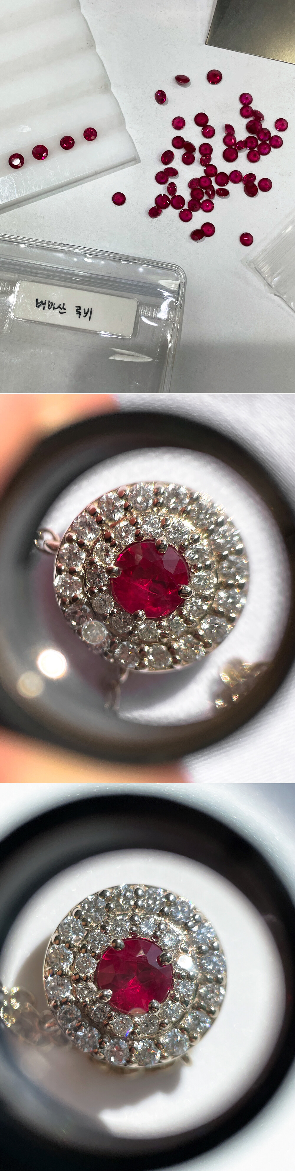 ※ 하단의 이미지는 주문 제작시 세팅되는 루비의 나석 사진입니다. 약 2.2~2.5부에 해당하는 루비로 세팅되구요, 색감은 거의 같지만 천연 보석이기 때문에 세팅 시 선택되는 스톤마다 함유하는 내포물이 각각 달라 명도나 채도에서 아주 약간의 차이는 있습니다. 이 점 참고해 주시구요, 요 아이들 모두 스톤 강화를 목적으로 한 단순 가열 처리만 된 상태의 품질 좋은 루비입니다. 원하시는 함량 (14K&18K), 골드 색상, 사이즈가 따로 있으신 분들은 옵션에서 직접 해당 사항들을 선택하여 주문해 주시면 예쁘게 제작해 드리겠습니다 :)