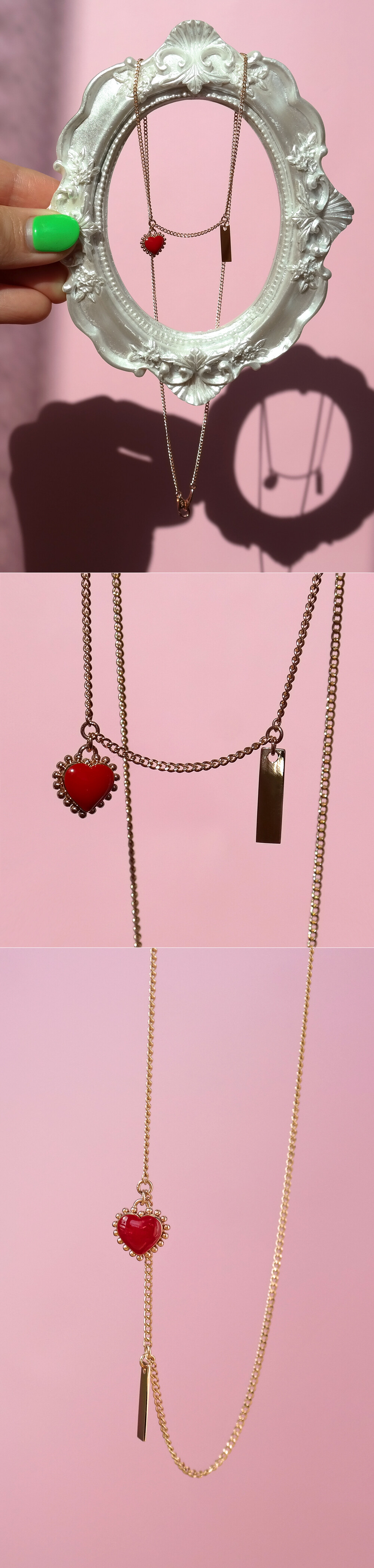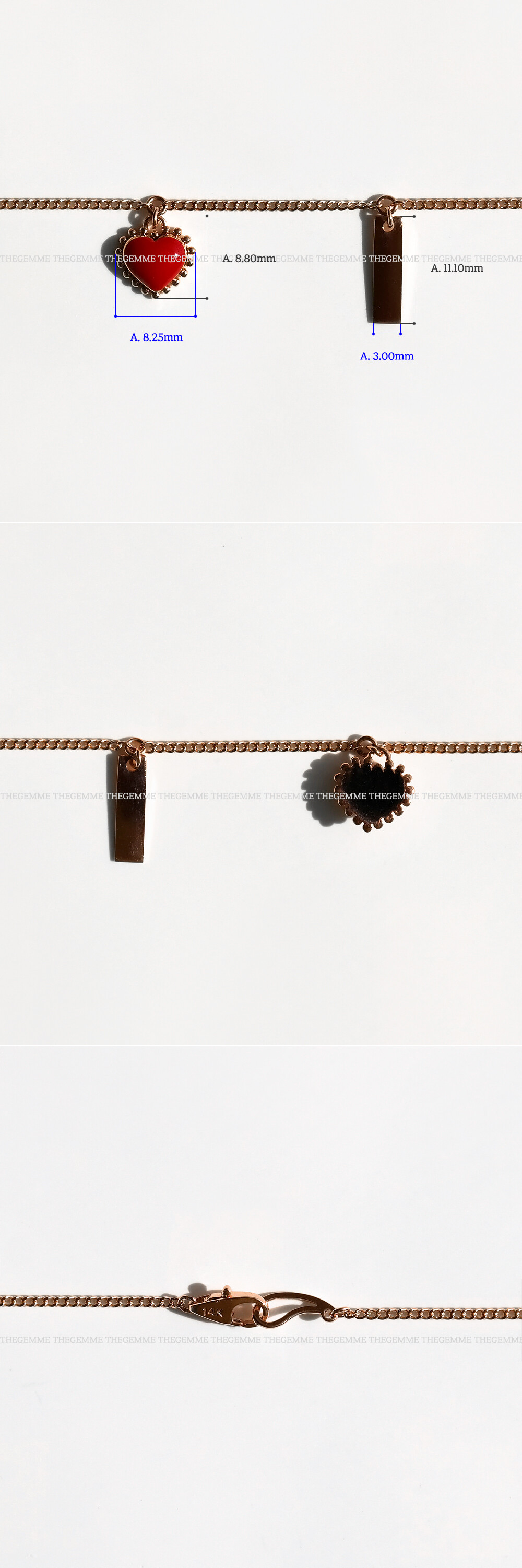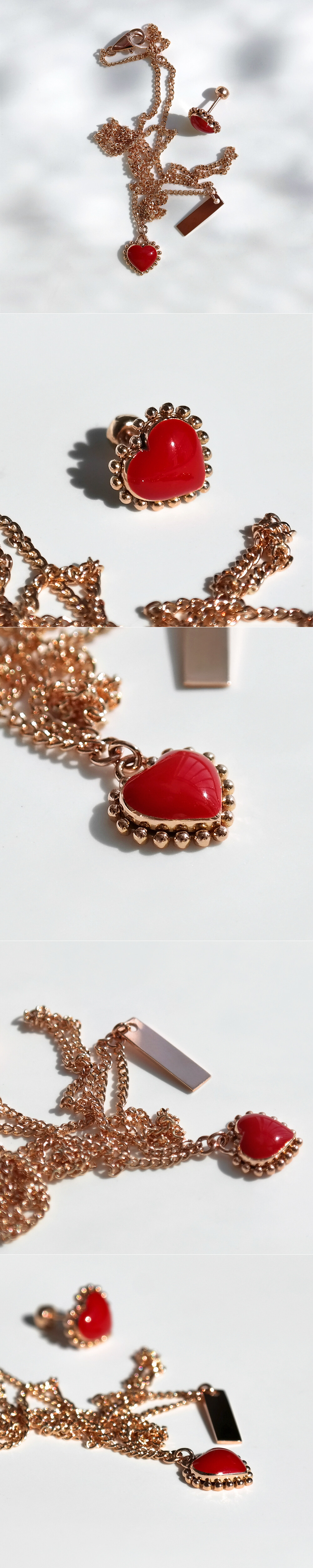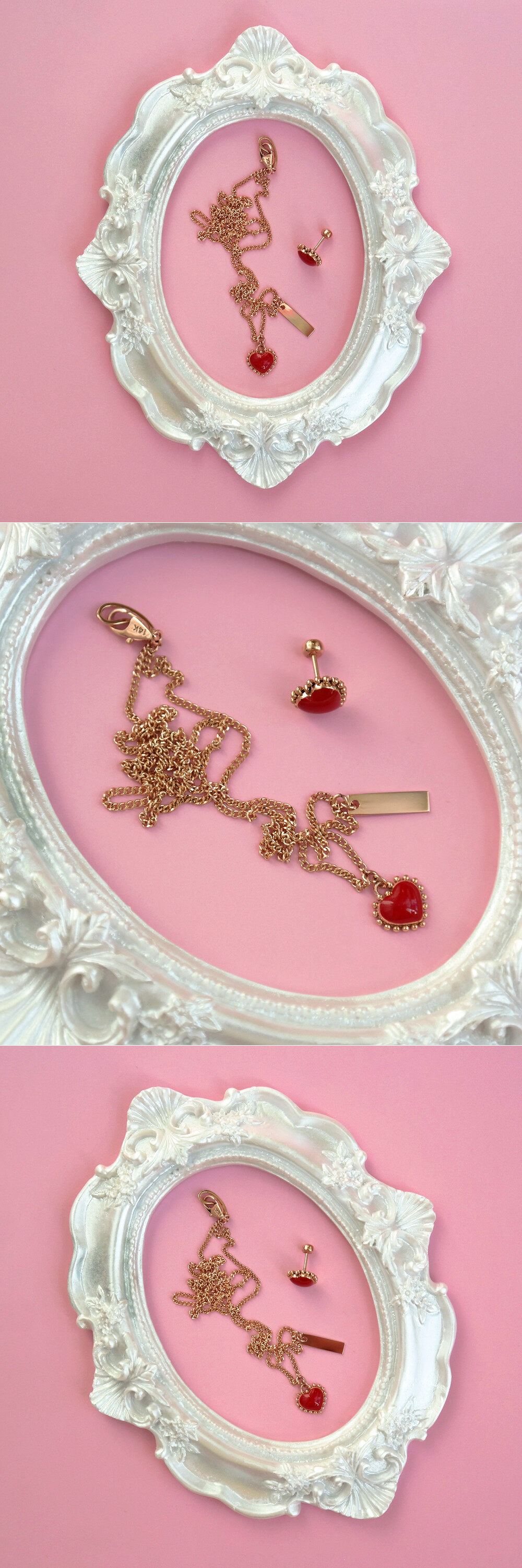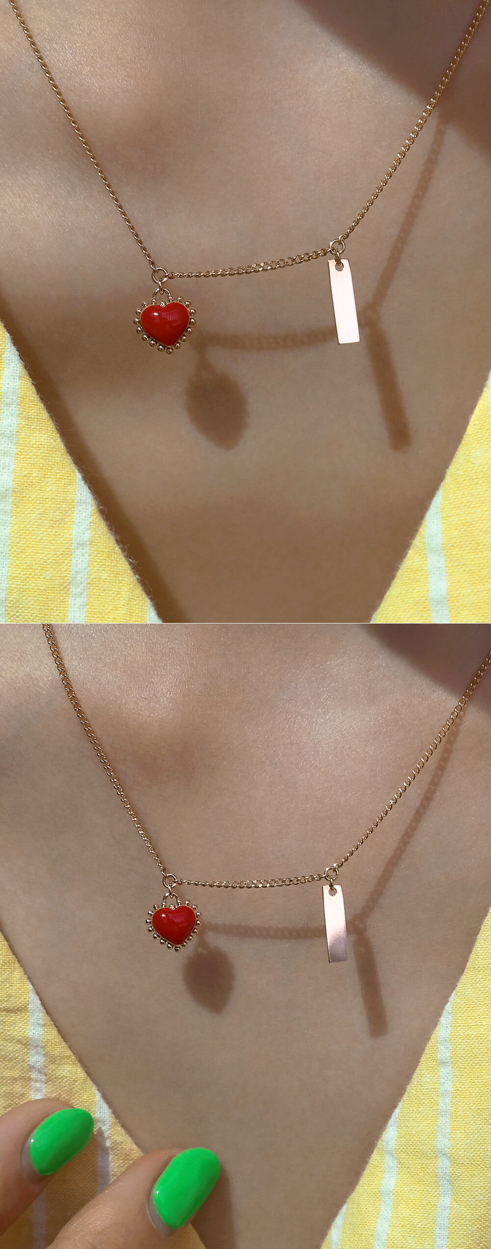 귀엽고 사랑스러운 하트 모티브와 스틱 장식이 함께 레이어드 된 목걸이입니다. ⭐️ 작지만 쨍한 레드 색감과 디테일한 디자인을 가진 하트 모티브와 플랫한 스틱 장식이에요. 스틱 장식에는 이니셜을 넣으셔도 좋을 것 같아서 각인을 추가하실 수 있도록 옵션을 만들어 놓았답니다. 원하시는 분들은 이니셜 추가로 나만의 목걸이를 소장해 보세요! (이니셜 각인의 경우, 글자의 수가 많아질수록 글씨 크기가 줄어듭니다. 각인을 추가하시는 경우에는 이 부분을 꼭 참고하셔서 기입 부탁드리겠습니다.) 하트 색상은 ; 골드의 표면에 얇게 컬러 에폭을 입힌 것입니다. 이 점도 참고해 주시구요, 유니크한 데일리 목걸이를 찾으시는 분들께 추천해 드릴게요. ❤️