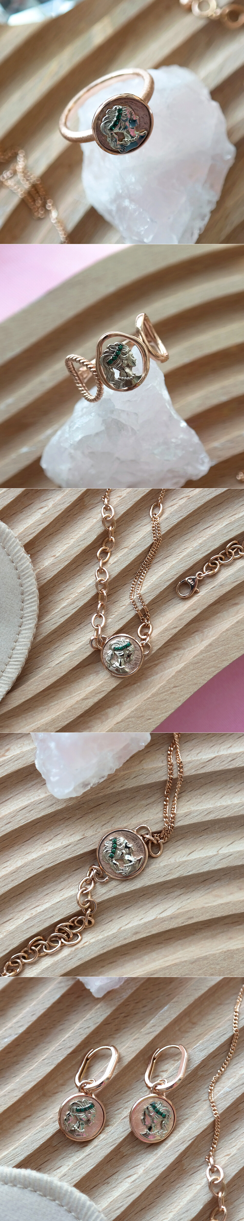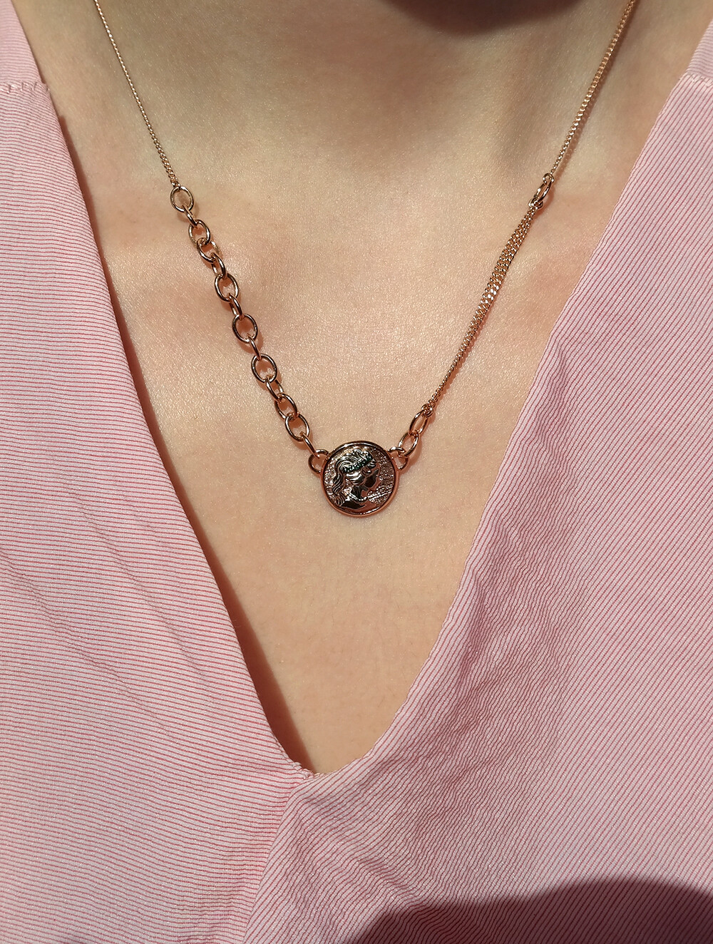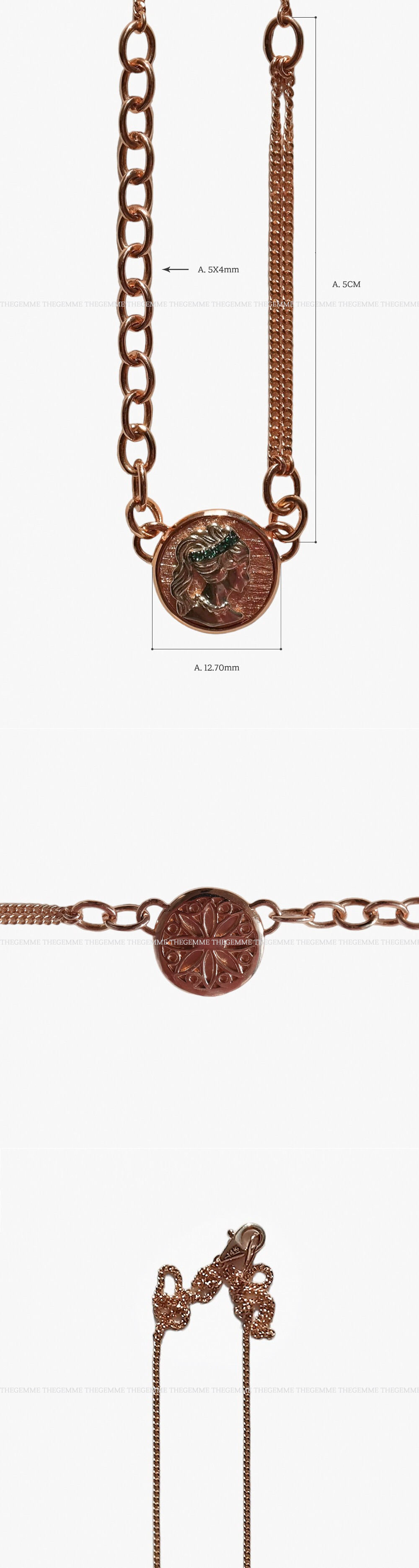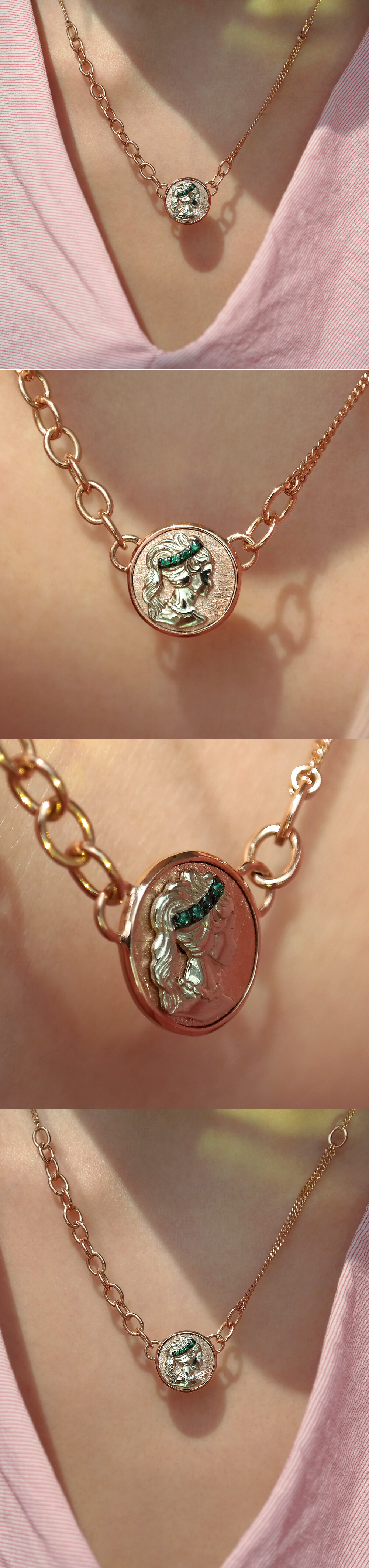 여성미가 물씬 풍기는 고급스러운 디자인의 코인 목걸이입니다. 💍 다양한 체인들이 결합된 멀티 체인 디자인으로 세련되면서 볼드한 중량감이 있는 스타일이에요. 팬던트는 한눈에 보아도 우아함이 가득한 여인의 모습이 양각으로 장식된 코인 디자인이랍니다. 골드 색상은 기본 투톤 디자인이구요, 중앙에 있는 여인 부분이 포인트 골드 색상입니다. (포인트 골드 색상은 옵션에서 따로 선택해 주세요. * 원톤으로 주문 시에는 기본 골드 색상과 포인트 골드 색상을 동일하게 선택해 주시면 됩니다.) 참고해 주시구요, 이미지에서 보여지는 여인의 헤어밴드 부분에는 그린 다이아몬드가 세팅된 모습입니다. 주문 시에도 같은 그린 다이아몬드로 세팅되어요. (다른 색상의 다이아몬드나 기타 스톤으로도 변경 가능하니 원하시는 분들은 네이버 톡톡으로 따로 문의주세요.) 그리고 다이아몬드가 세팅된 부분에 까맣게 보이는 부분은 블랙도금 처리가 되어있는 것이랍니다. 블랙 도금을 바탕에 깔면 다이아몬드가 더 쨍하게 빛나는 효과가 있어요. 게다가 전체적으로 샌딩된 무광 디자인이 골고루 믹스되어 있어서 보면 볼수록 은은한 골드의 광택에 빠져들게 된답니다. 정말 유니크하죠? 코인 스타일의 목걸이를 좋아하시는 분들이라면 아마 정말 좋아하실 것 같아요. 매일매일 착용하실 데일리용 포인트 및 레이어드 목걸이를 찾으시는 분들께 적극 추천해 드릴게요. 💚