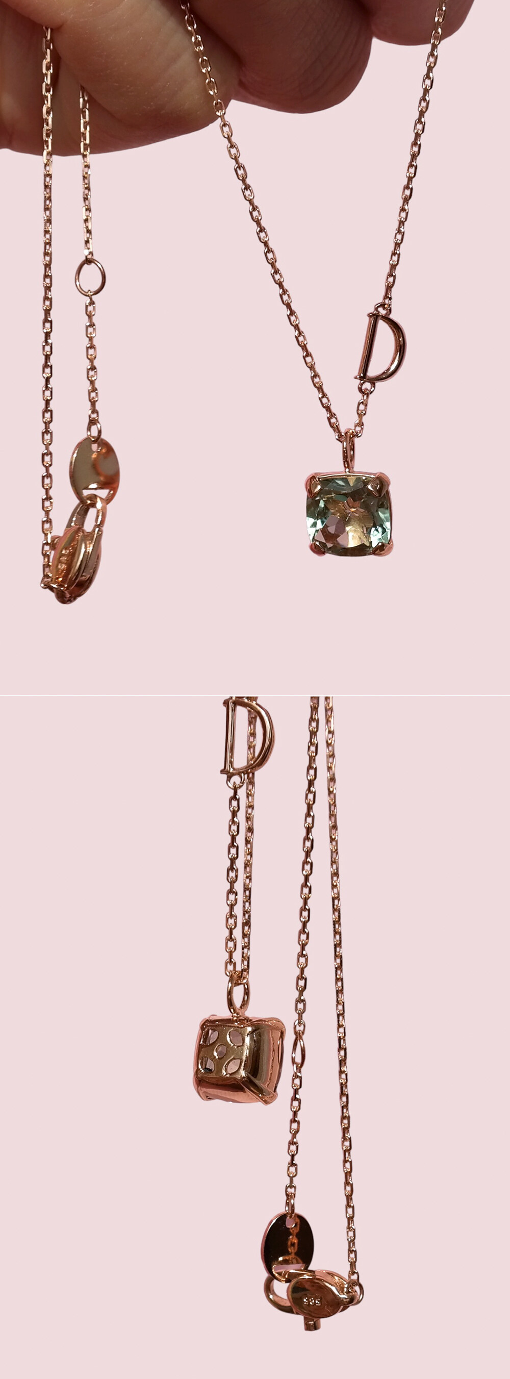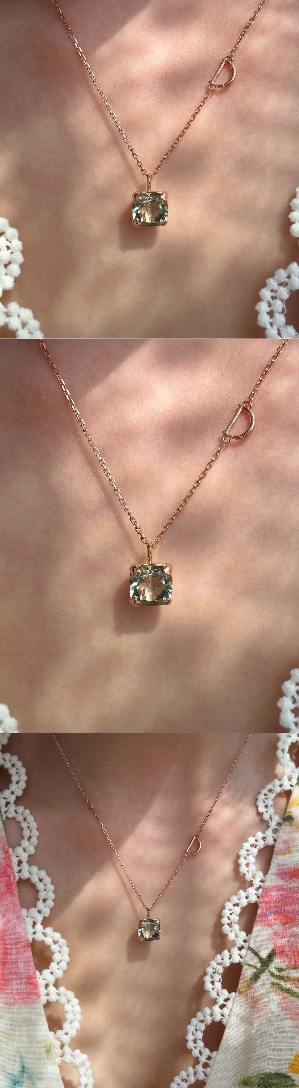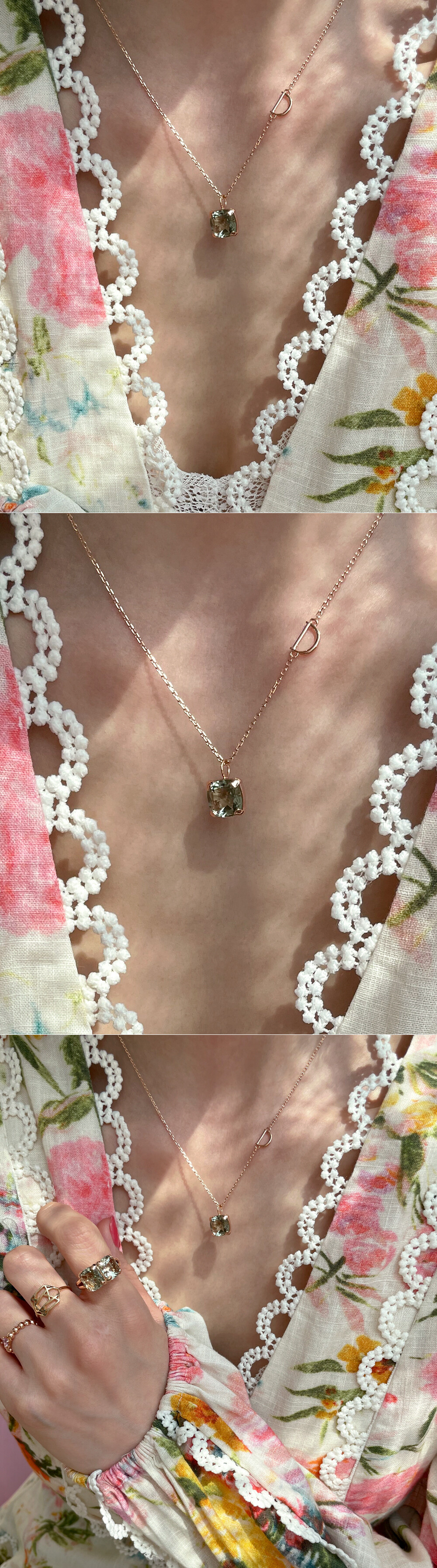 은은하고 청아한 그린 빛깔의 아름다움을 머금고 있는 그린 쿼츠 (그린 자수정) 목걸이입니다. 지름 약 9mm 사이즈의 쿠션컷 스톤이 세팅된 디자인으로 멀리서도 한 눈에 들어올만큼 볼륨감이 있어요. 체인 사이드 측면에는 이니셜이 포함되어 있는데 ; 촬영된 이미지에는 D 이니셜로 촬영이 되었어요. (이니셜은 원하시는 영문으로 선택하셔서 주문 가능합니다. * A-Z 까지 원하시는 이니셜을 주문시 배송 메모에 함께 적어주세요.) 그린 쿼츠는 우리가 흔히 알고 있는 자수정과 같은 쿼츠의 변종이기 때문에 시중에서는 그린 자수정이라고도 불리기도 하는데요, 또 다른 말로는 프라시오라이트라고도 알려져 있답니다. 자수정과 마찬가지로 2월의 탄생석이기도 하면서 성장, 번영, 풍요의 상징으로 여겨 특히 보석 애호가들에게 인기가 높은 보석 중에 하나이기도 해요. 또한, 투명감이 있는 밝은 녹색의 광채를 가지고 있는 것이 특징으로 ; 독특하고 눈에 띄는 주얼리를 찾는 사람들에게 추천해 드리고 있어요. 경도도 약 7 정도로 관리하기가 편해서 데일리 스톤 주얼리로 활용하시기에도 아주 좋답니다. 전체적으로 고급스럽고 세련된 디자인과 함께 그린 쿼츠만이 가지는 아름다운 빛깔로 저절로 시선이 가는 아이에요. 포인트로 착용하실 나만의 스톤 목걸이를 찾으시는 분들께 추천해 드릴게요. 💚