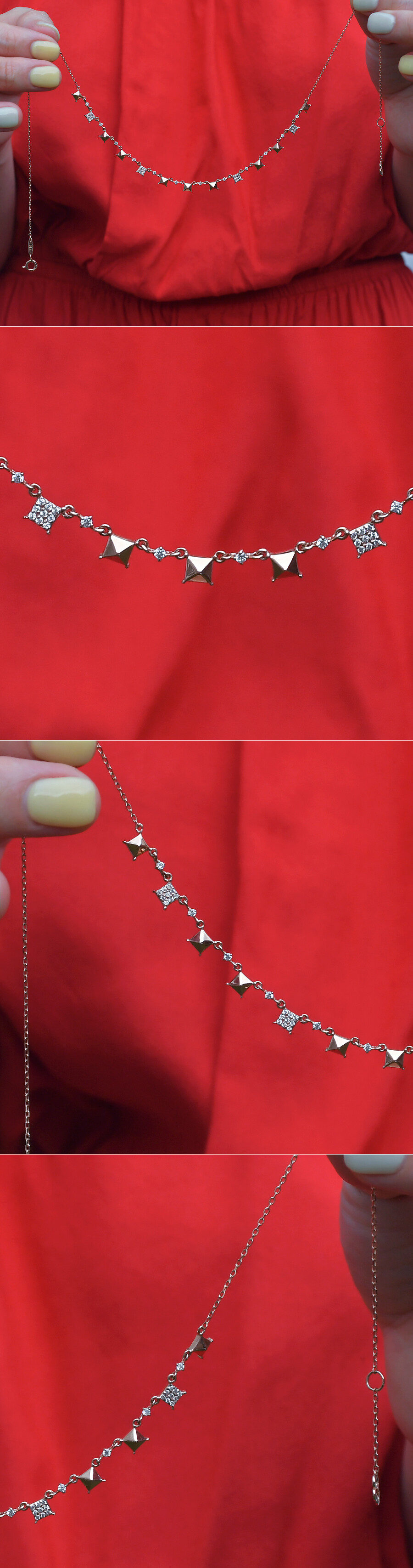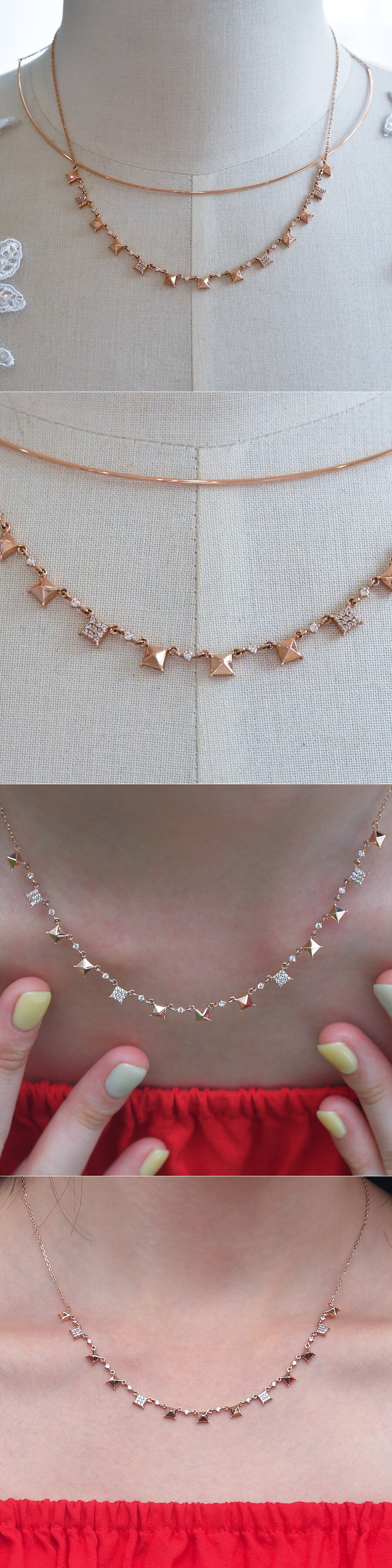 방사형으로 이어진 사각 도형 목걸이입니다. 깔끔하고 세련된 사각 스타일로 멋스럽게 착용하시기에 좋습니다 :)