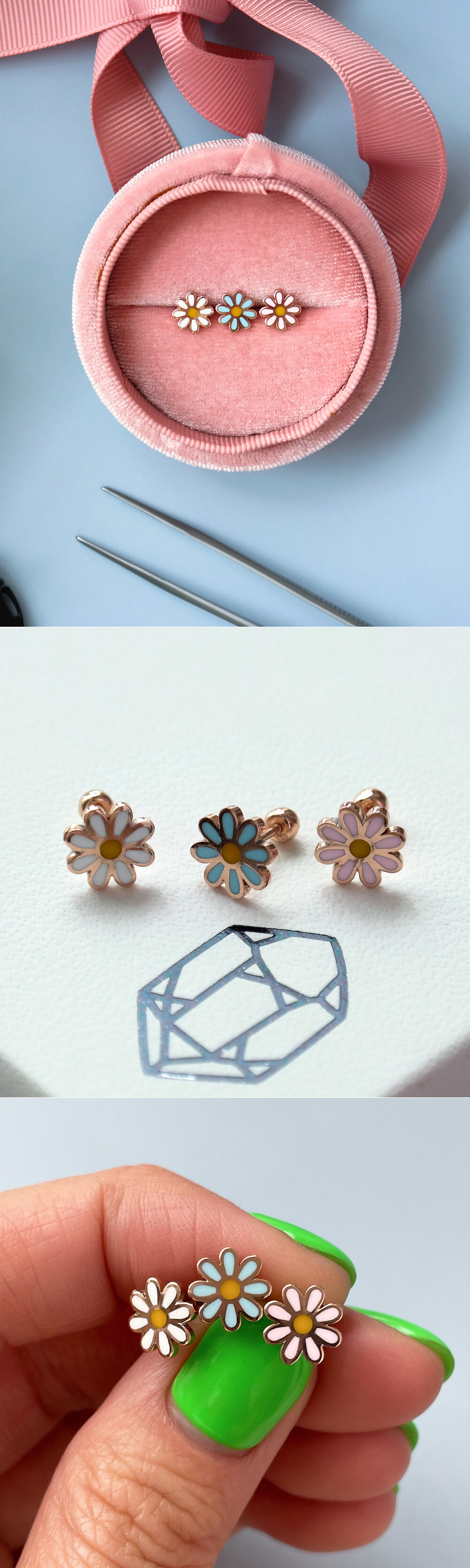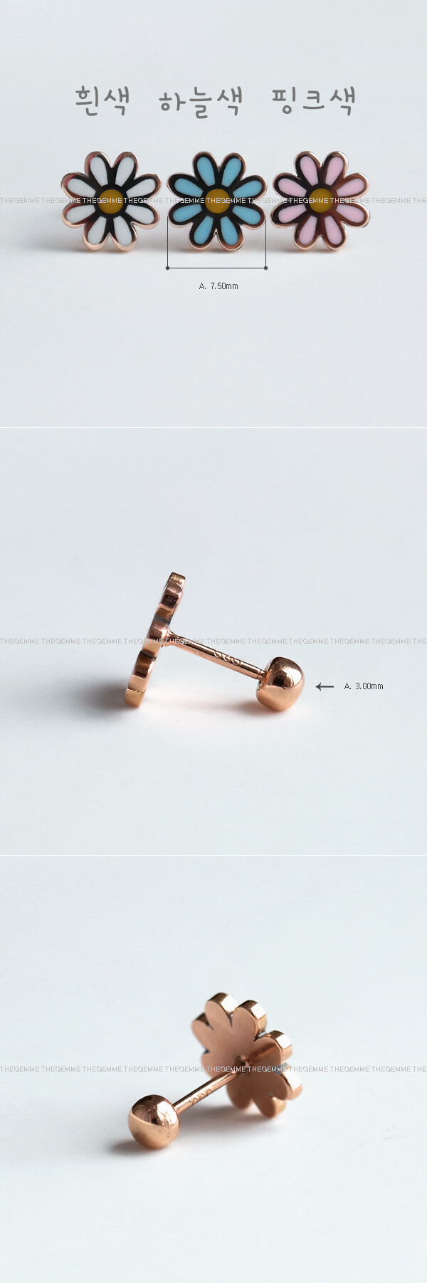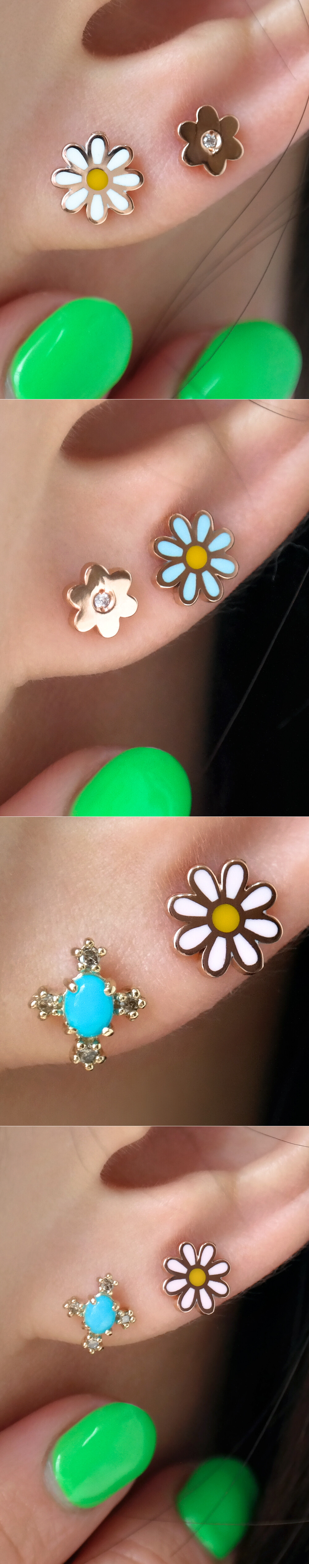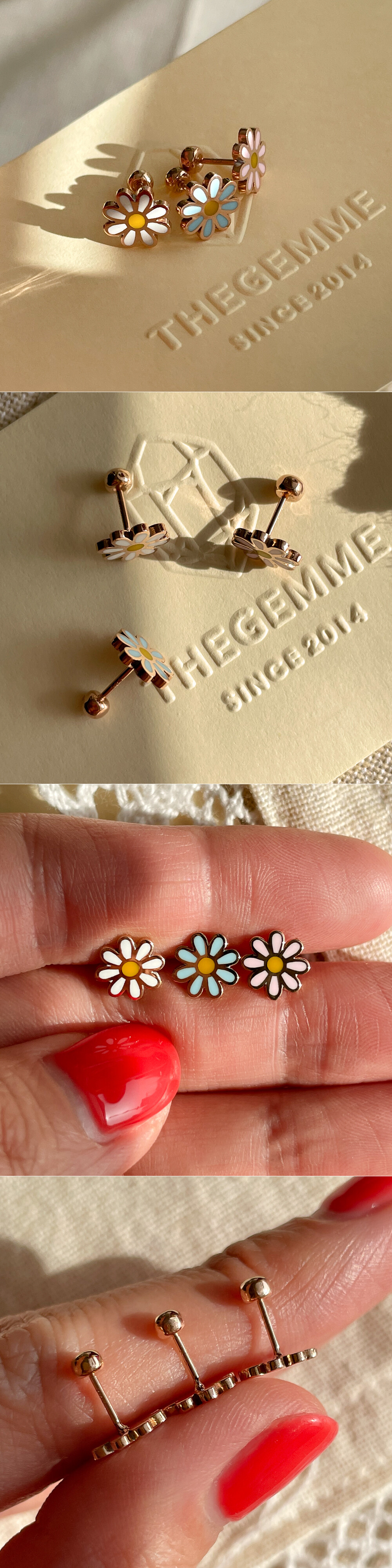 귀엽고 사랑스러운 디자인의 플라워 피어싱입니다. 🌸 세 가지 컬러로 나뉘구요, 알록달록한 꽃 모양 팬던트는 ; 골드의 표면에 얇게 컬러 에폭시 처리를 한 것입니다. 이 점 참고해 주시구요, 어여쁜 파스텔톤 컬러라 전체적으로 사랑스러운 느낌이 있어요. 귀걸이 용도로 착용하시기에도 적당한 사이즈라 데일리 귀걸이 및 피어싱을 찾으시는 분들께 추천해 드릴게요. 😛