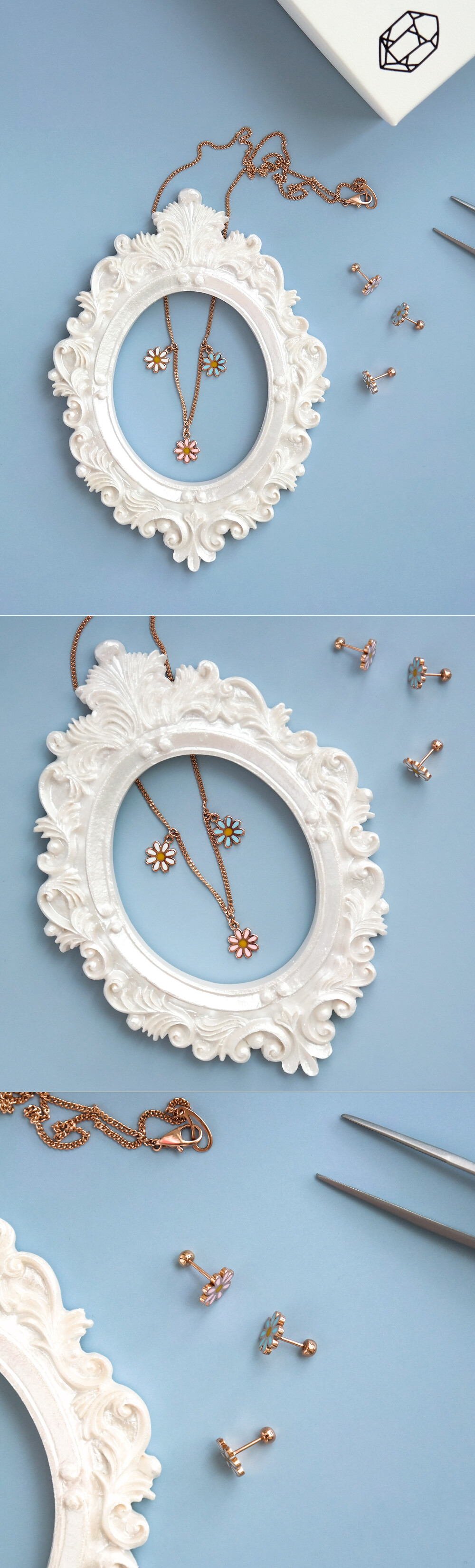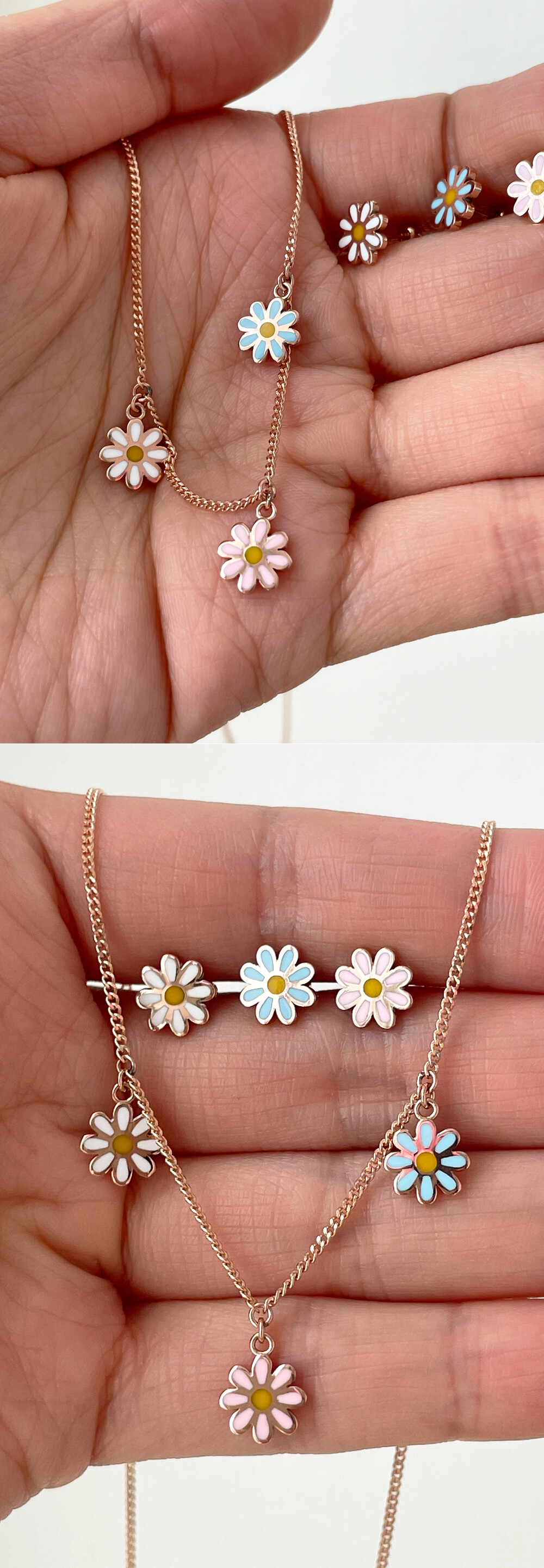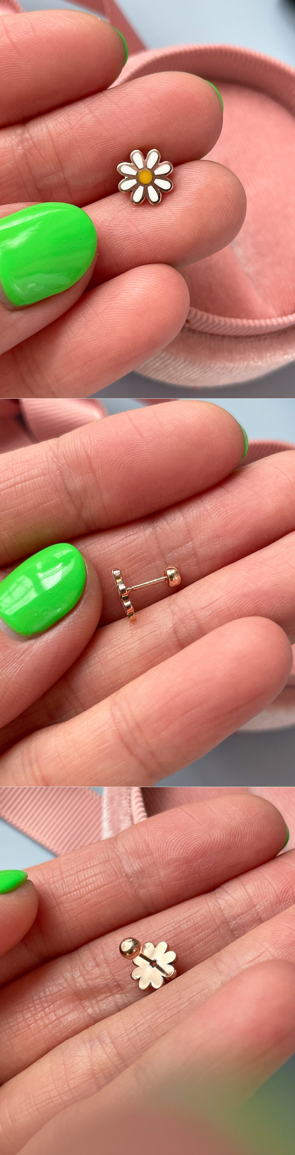 귀엽고 사랑스러운 디자인의 플라워 피어싱입니다. 🌸 세 가지 컬러로 나뉘구요, 알록달록한 꽃 모양 팬던트는 ; 골드의 표면에 얇게 컬러 에폭시 처리를 한 것입니다. 이 점 참고해 주시구요, 어여쁜 파스텔톤 컬러라 전체적으로 사랑스러운 느낌이 있어요. 귀걸이 용도로 착용하시기에도 적당한 사이즈라 데일리 귀걸이 및 피어싱을 찾으시는 분들께 추천해 드릴게요. 😛