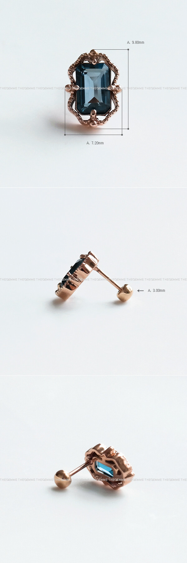 고급스러운 색감이 매력적인 에메랄드 컷의 런던블루 토파즈가 세팅된 피어싱입니다. 벨벳처럼 부드러운 곡선의 느낌을 담은 프레임 장식으로 전체적으로 볼륨감이 있어 보이는 아이에요. 보통 블루 토파즈는 같은 블루 계열 토파즈 중에서도 ; 색에 따라서 세 가지 종류로 나뉘어요. 연한 하늘색의 스카이 블루 토파즈, 그보다 약간 더 진하고 시원한 색상을 가진 스위스 블루 토파즈, 그리고 이렇게 짙고 우아한 블루 색상의 런던블루 토파즈로 나뉜답니다. 😊 원래 본연의 천연 토파즈는 무색에서 황색 계열의 색 범위를 가지는데, 이 이외의 색을 가진 모든 토파즈는 방사선 처리 및 열처리를 통해 다양한 색상으로 변신하는 것이에요. (* 스톤 상태에 따라 무색에서 황색 범위도 열처리로 색향상 되는 경우도 있음) 이와 같은 이유로 토파즈는 단 한 가지 색이 아닌 다양한 색상으로도 만나볼 수 있어서 더 매력적인 보석인 것 같아요. 주요 특징으로는 뛰어난 경도와 투명도인데, 토파즈는 모스 경도 (8)로 다이아몬드(10)와 사파이어(9) 다음으로 일상 스크래치에 대한 마모에 강하고, 투명도도 매우 뛰어나기 때문에 데일리 주얼리에 적합한 유색보석 중에 하나랍니다. 묘한 블루 색감을 좋아하시는 분들이나, 경도가 강한 스톤 주얼리를 찾으시는 분들께 추천해 드릴게요. 💜