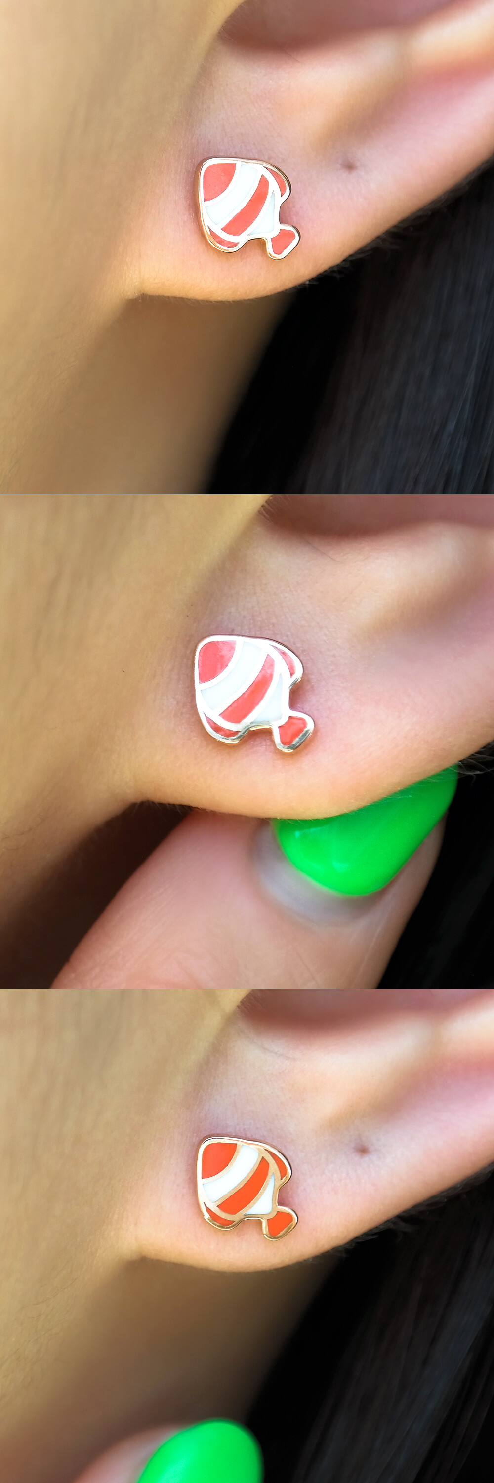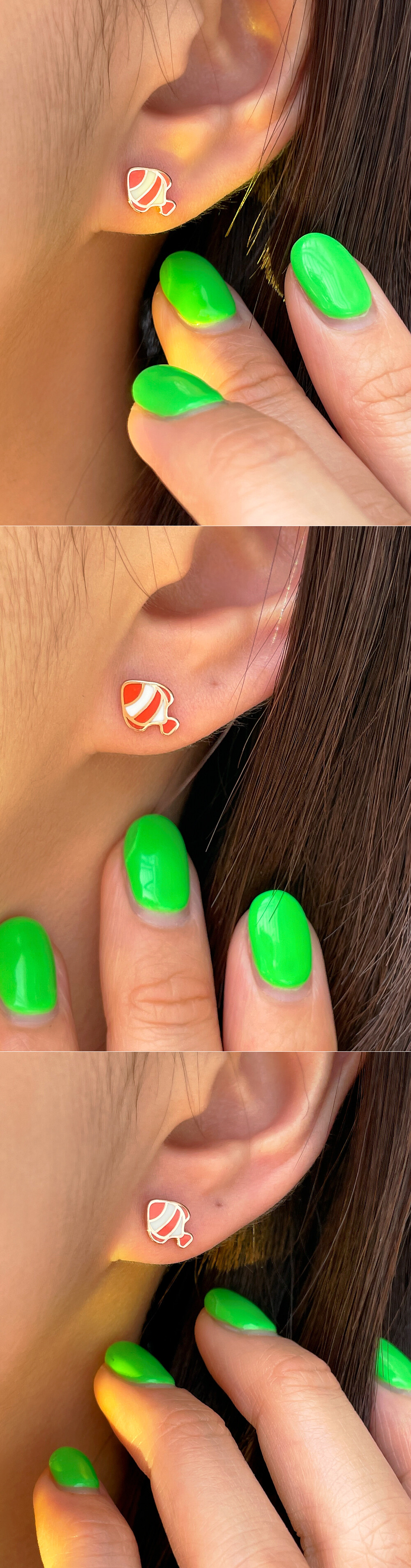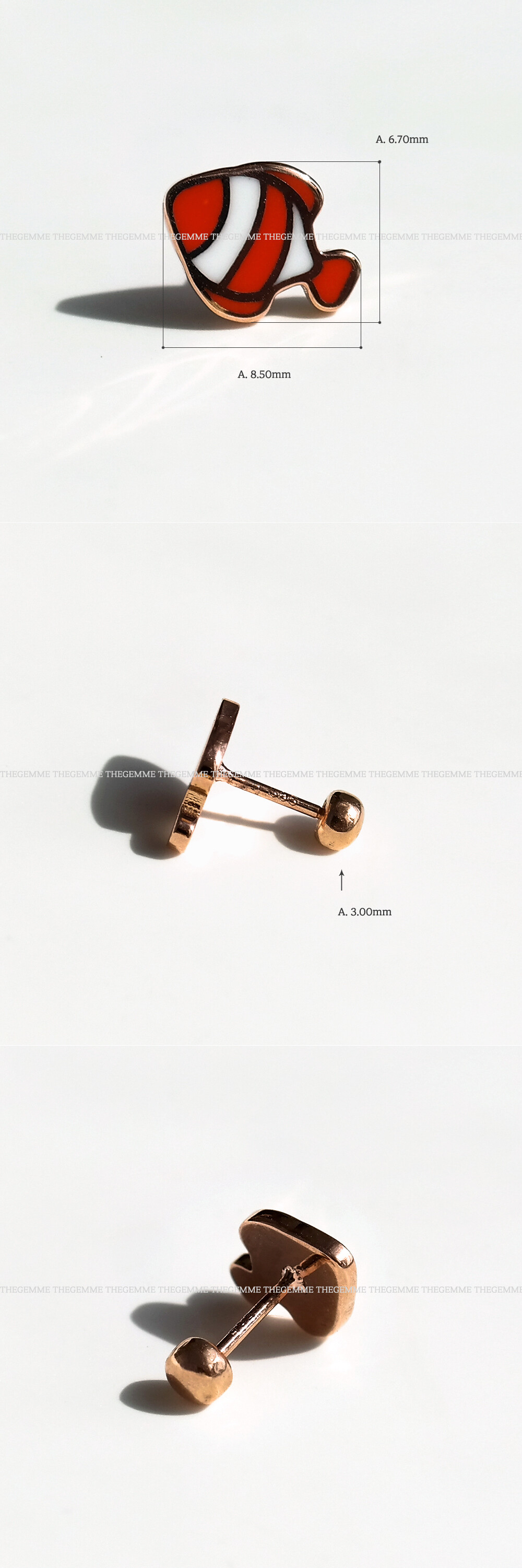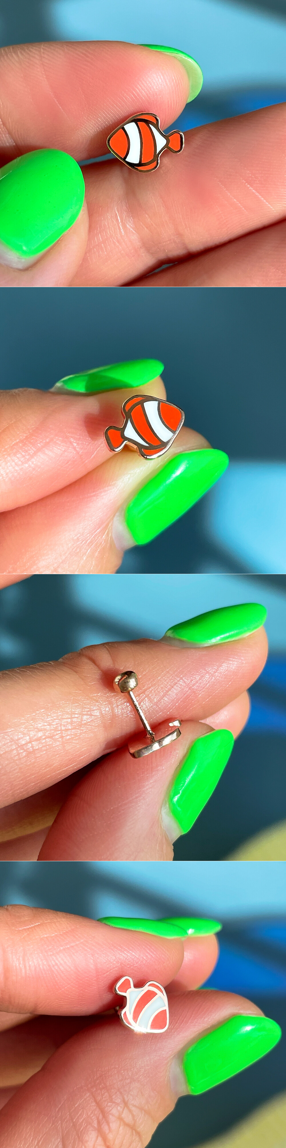 귀여운 니모 모티브의 피어싱입니다. 🐠 한 눈에 들어오는 밝은 컬러감과 패턴을 가지고 있어서 포인트 주얼리로 제격이에요! 알록달록한 색상은 ; 골드의 표면에 얇게 컬러 에폭을 입힌 것입니다. 이 점 참고해 주시구요, 귀걸이 용도로 착용하시기에도 적당한 사이즈라 데일리 귀걸이 및 피어싱을 찾으시는 분들께 추천해 드릴게요. 🧡