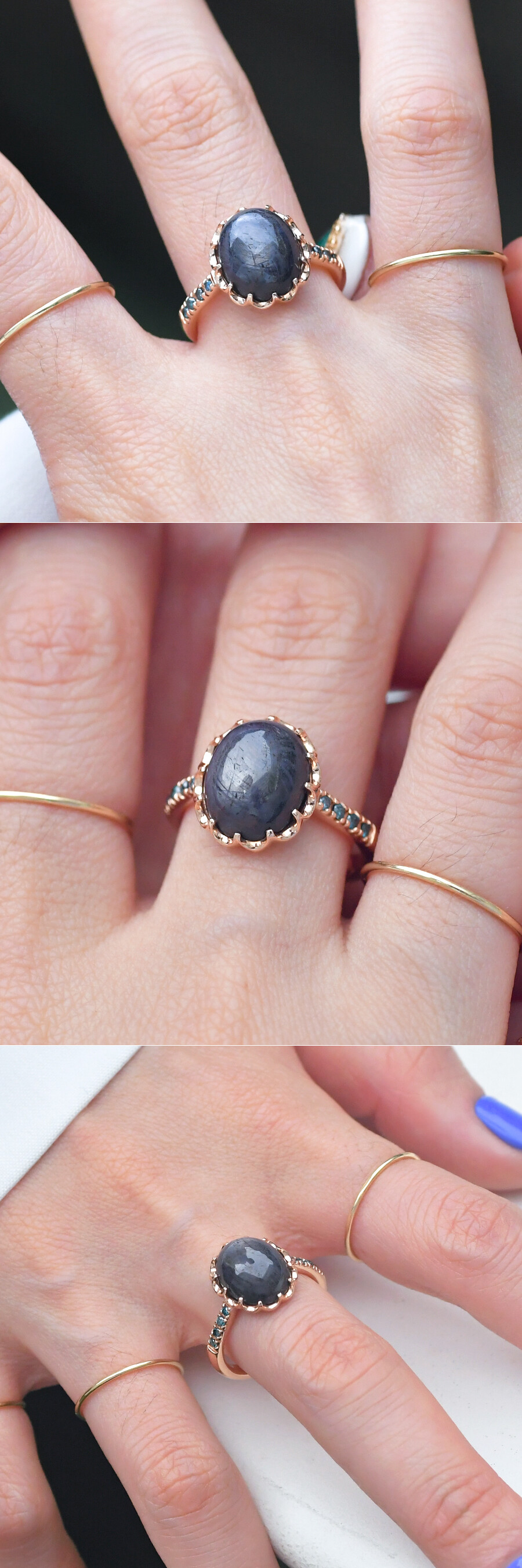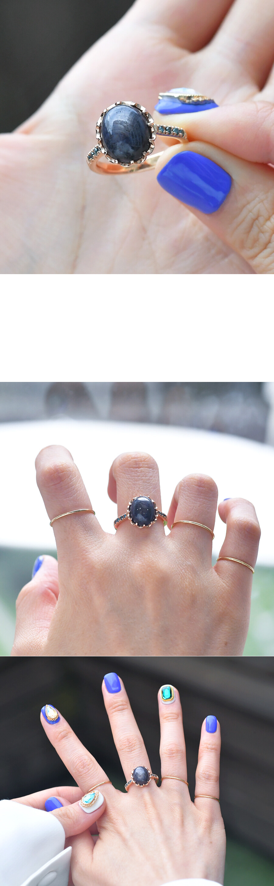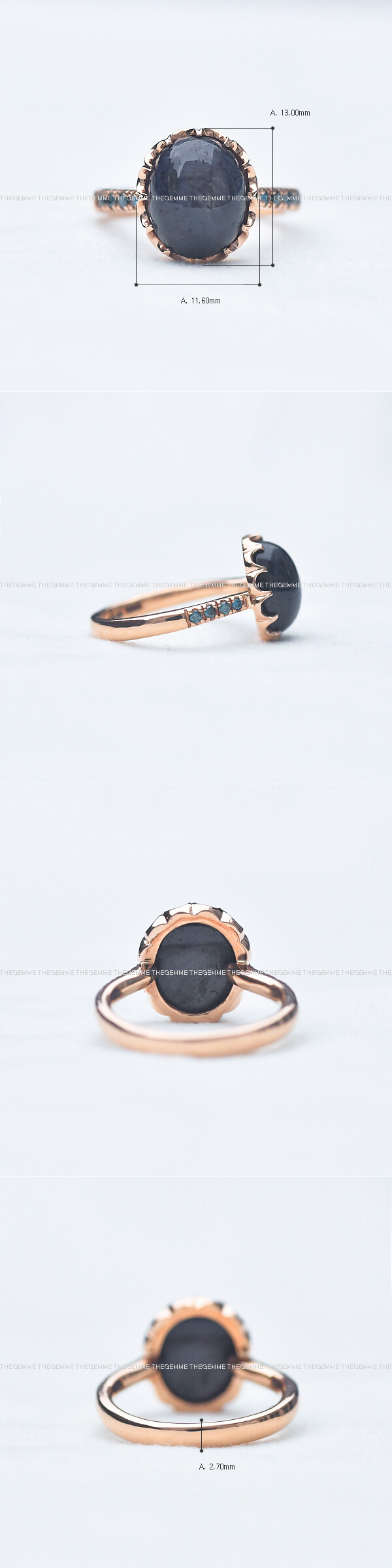 밀키한 블루 색상을 가진 천연 스타 사파이어 캐보션 원석으로 제작한 반지입니다. 네이비와 그레이가 약간 섞인듯한 바디 색상을 가지고 있구요, 빛의 각도에 따라서 약한 스타 효과를 나타내는 아이입니다. 사파이어 중에서는 상당히 큰 사이즈에 속하지만 스타 효과가 강한 아이가 아니라서 캐럿 사이즈에 비해서 아주 착한 가격에 데려온 아이랍니다. * 서브 스톤으로는 블루 다이아몬드가 함께 세팅되었어요 :) 그리고 사파이어 표면을 자세히 보시면 중간중간 커런덤의 특징인 //// < 이런 직선의 성장선들이 보여지기도 합니다. 스톤의 바디 색상은 각도에 따라서 사진보다 더 밝게 보이기도 또 어둡게 보이기도 하며, 반지를 요리조리 돌려보면 원형의 구름이 떠보이는 듯한 오묘한 스타 효과를 보실 수 있습니다. 완벽한 스타 효과는 아니지만 각도에 따라서 보여지는 은은한 느낌의 유색효과로 나만의 의미있는 반지로 소장하시기에 좋을듯 싶어요. 금속은 18K, 자체 핑크(로즈) 골드로 제작되었습니다. 특별하고 앤틱한 매력의 내츄럴 스톤을 좋아하시는 분들께 추천해 드릴게요 :) * 이미지 제품은 하나밖에 없는 스톤으로 제작한 반지로, 온리원 (Only One) 제품입니다. 총 1점 제작되었으며 사이즈 조절이 가능합니다. (당일 발송은 제작된 사이즈 기준이며 사이즈 조절 요청 시에는 제품을 받으시는 날까지 2~3일 정도 소요되니 이 점 꼭 참고해 주세요.)