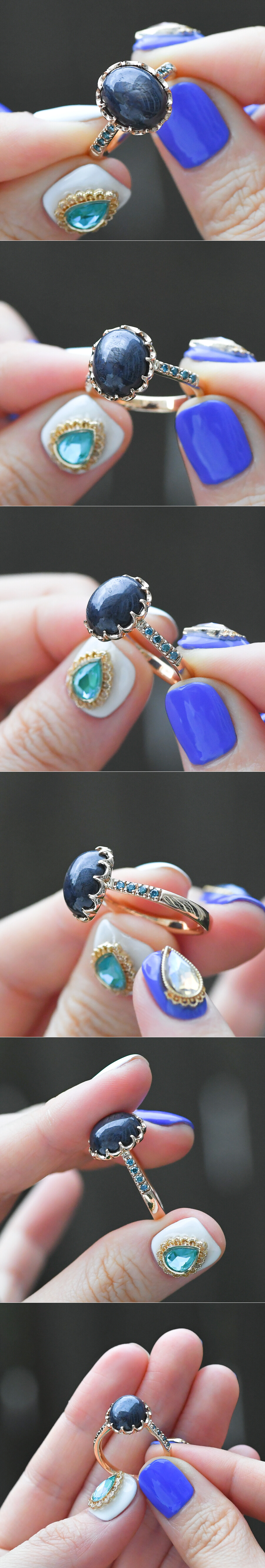 18K 10X12 블루 스타 사파이어 & 블루 다이아몬드 반지