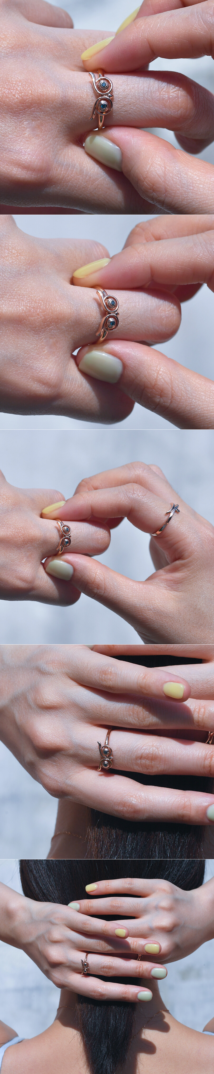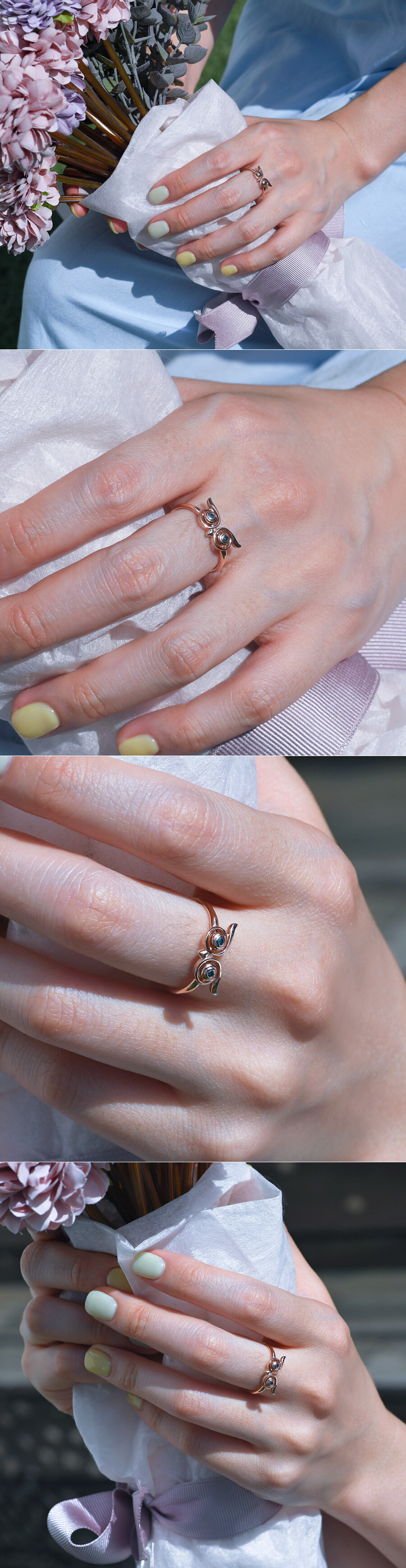 세련된 느낌으로 제작된 부엉이 반지입니다. 부엉이의 눈 부분에는 블루 다이아몬드가 세팅되었어요. 부엉이는 부와 건강을 의미하는 상징적인 모티브로 의미 있는 반지를 원하시는 분들에게 좋은 아이템이 될 것 같아요 :)