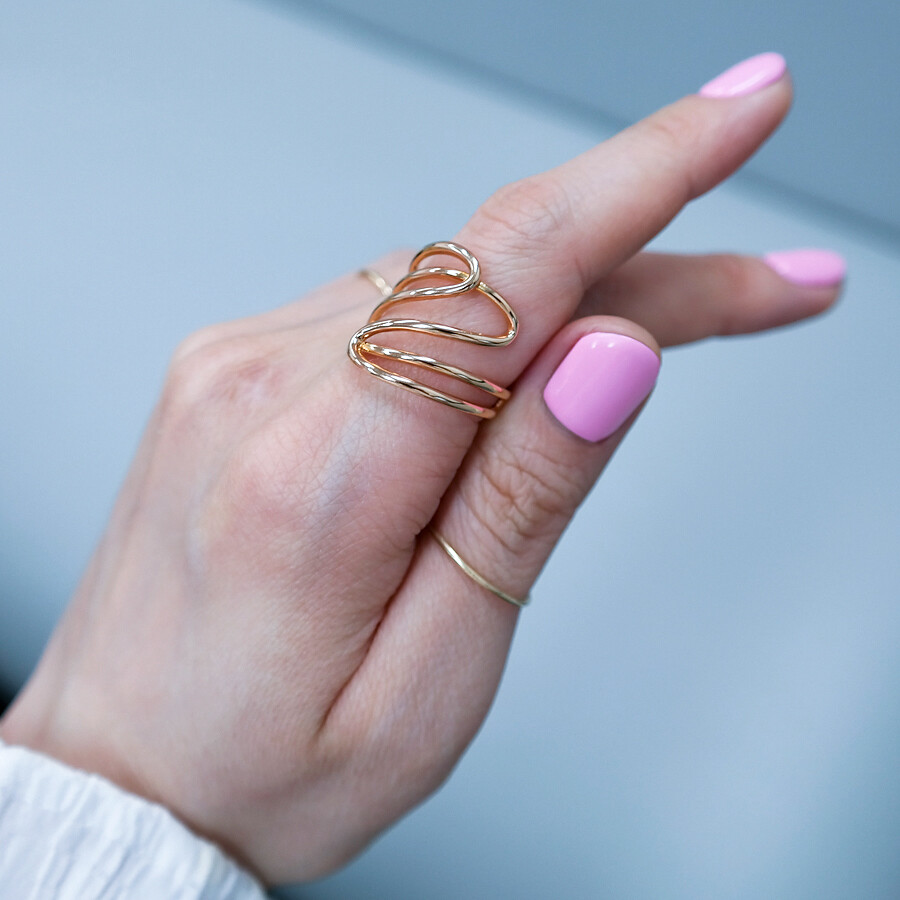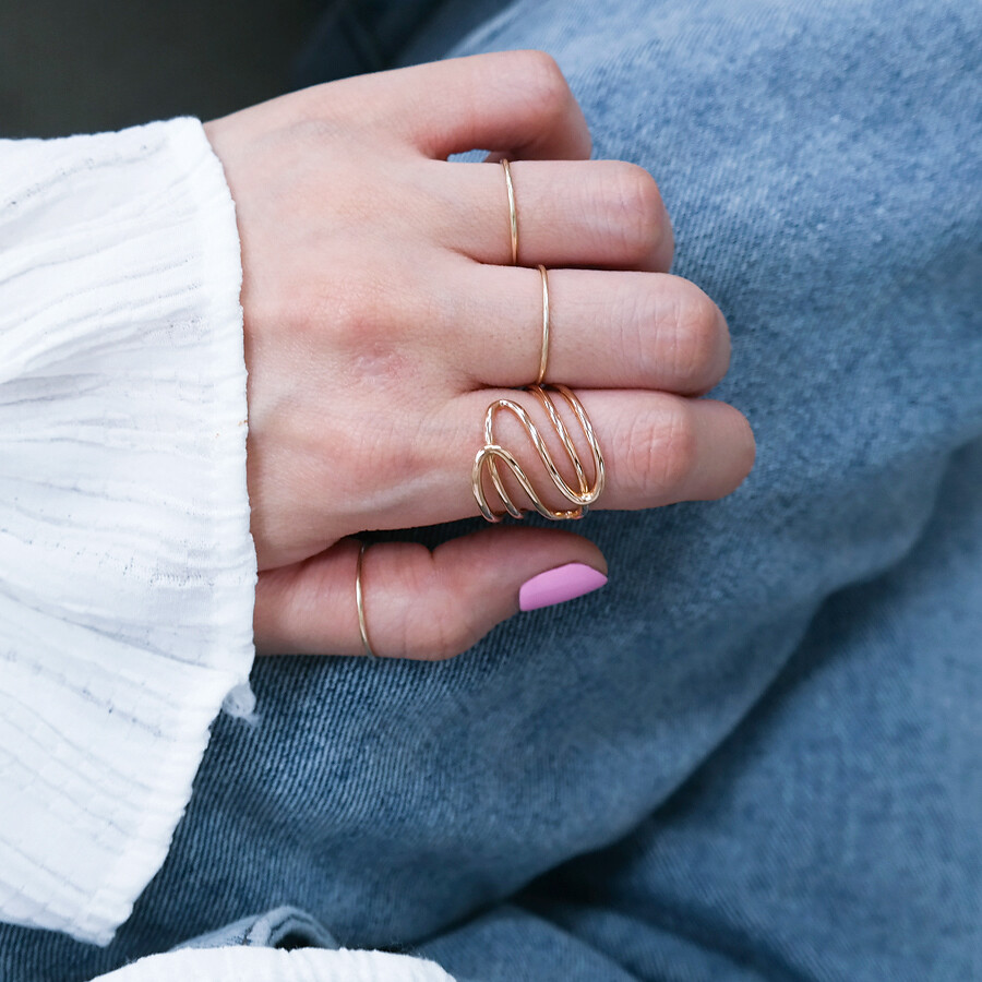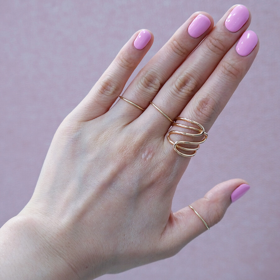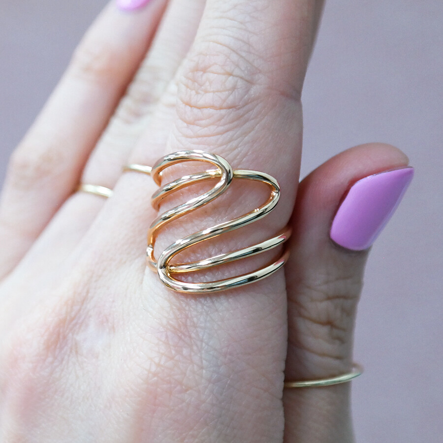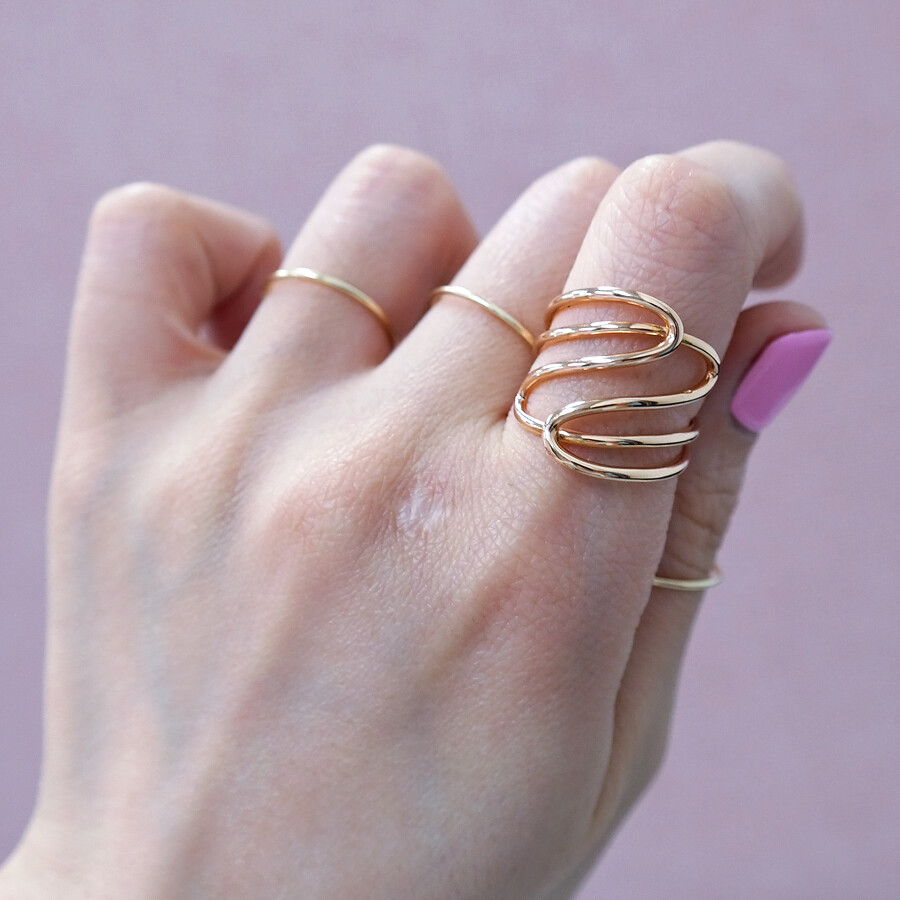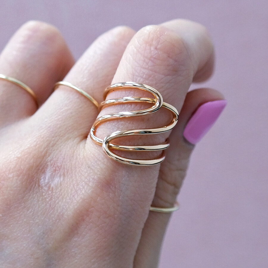 파이프 형태의 금선이 웨이브 형태로 겹쳐진 디자인의 반지입니다. 유니크한 반지를 선호하시는 분들께 추천해 드려요 :)