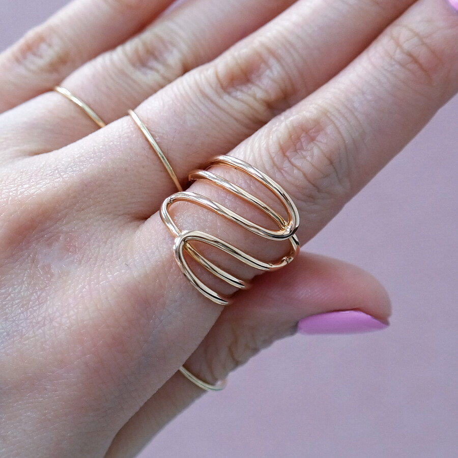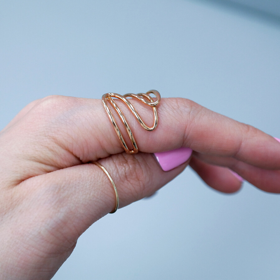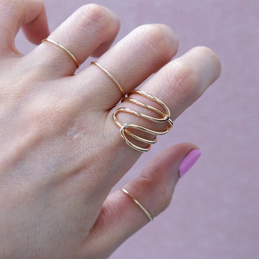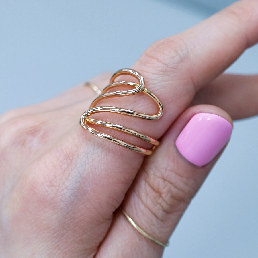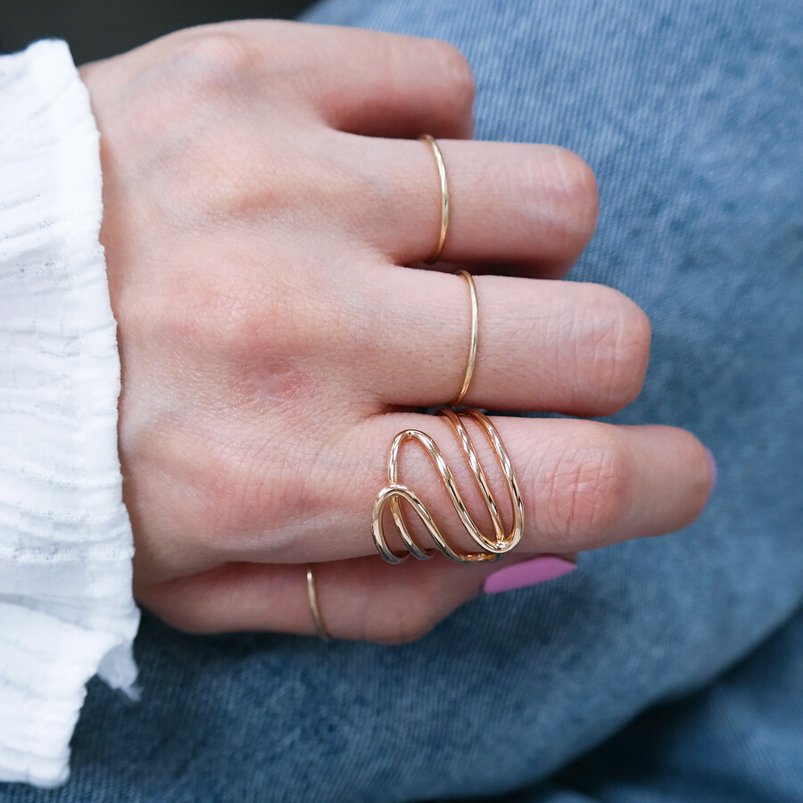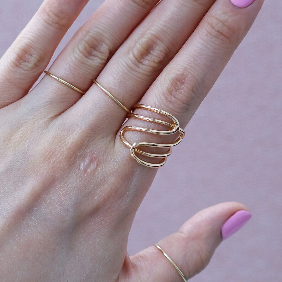 파이프 형태의 금선이 웨이브 형태로 겹쳐진 디자인의 반지입니다. 유니크한 반지를 선호하시는 분들께 추천해 드려요 :)