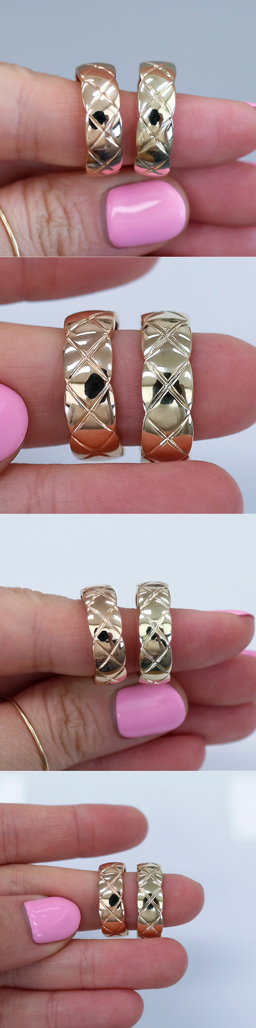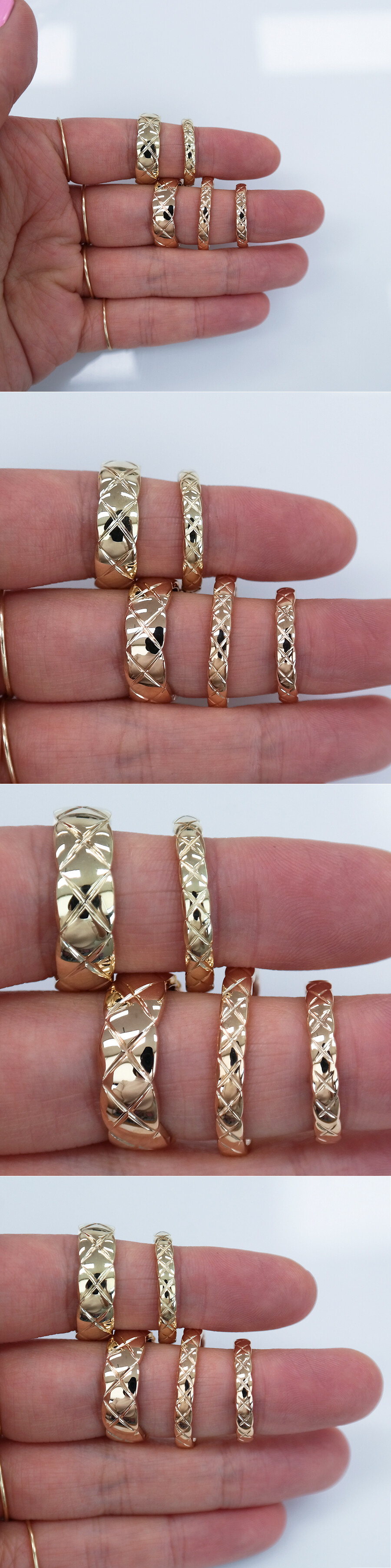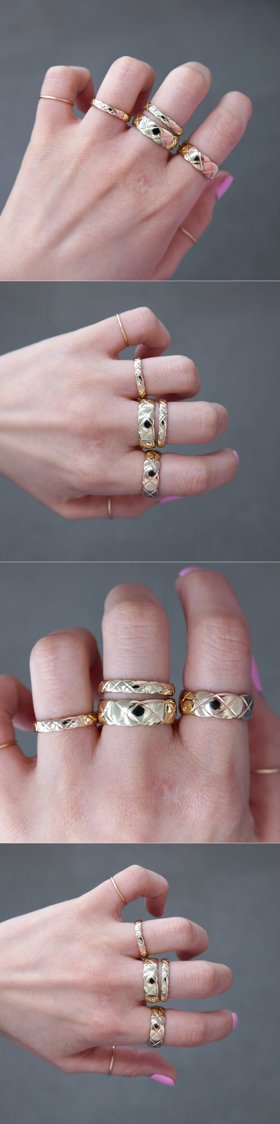 첫 번째 줄에 있는 반지 : 18K 자체 베이지 골드, 두 번째 줄에 있는 반지 : 14K 자체 핑크(로즈) 골드
