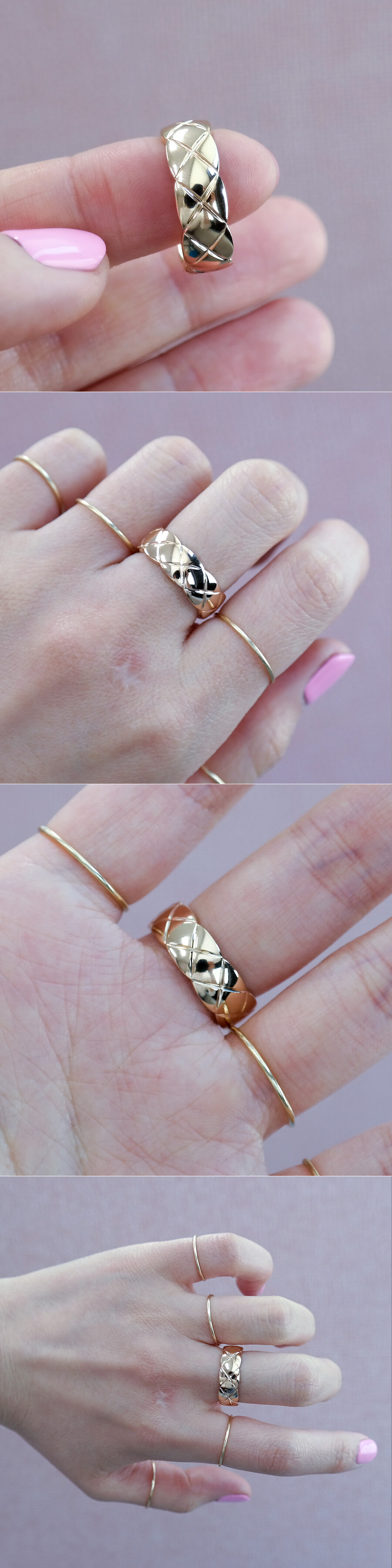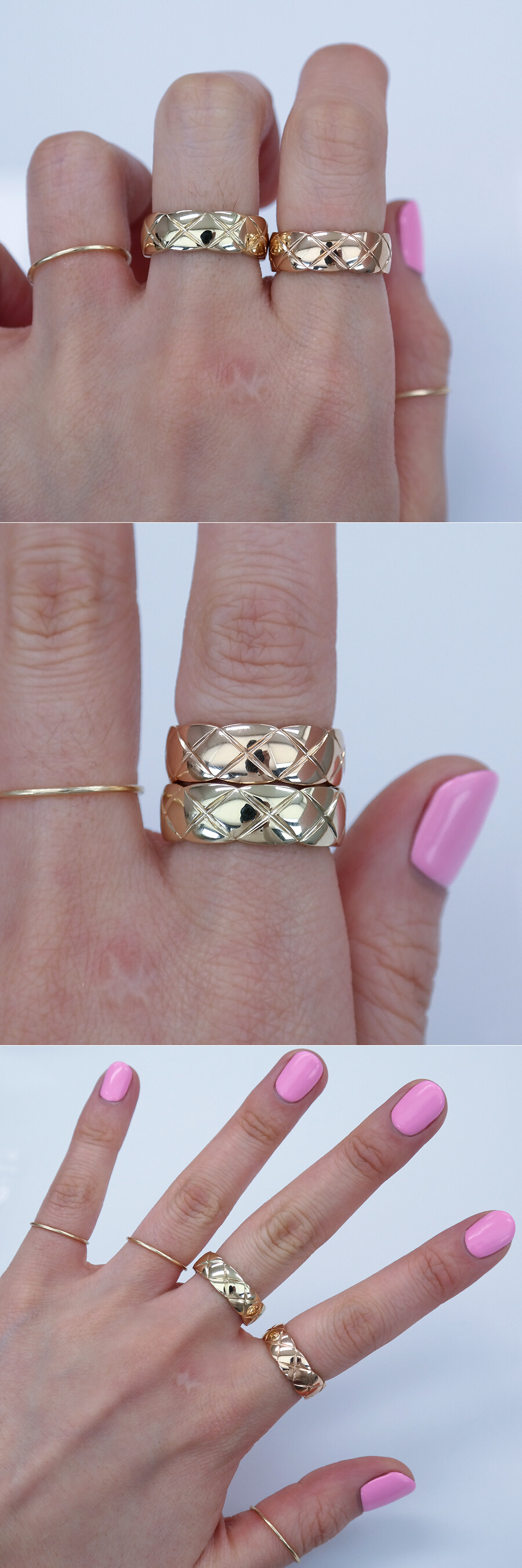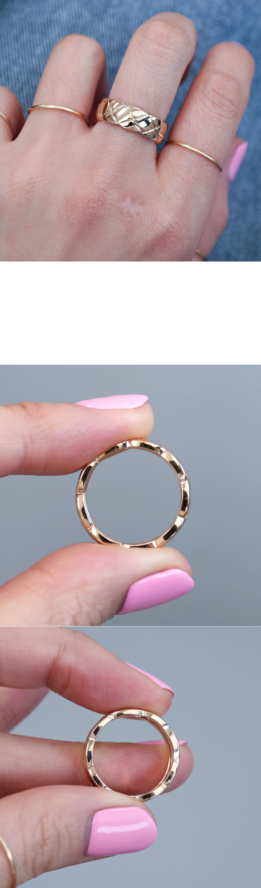 첫 번째 줄에 있는 반지 : 18K 자체 베이지 골드, 두 번째 줄에 있는 반지 : 14K 자체 핑크(로즈) 골드