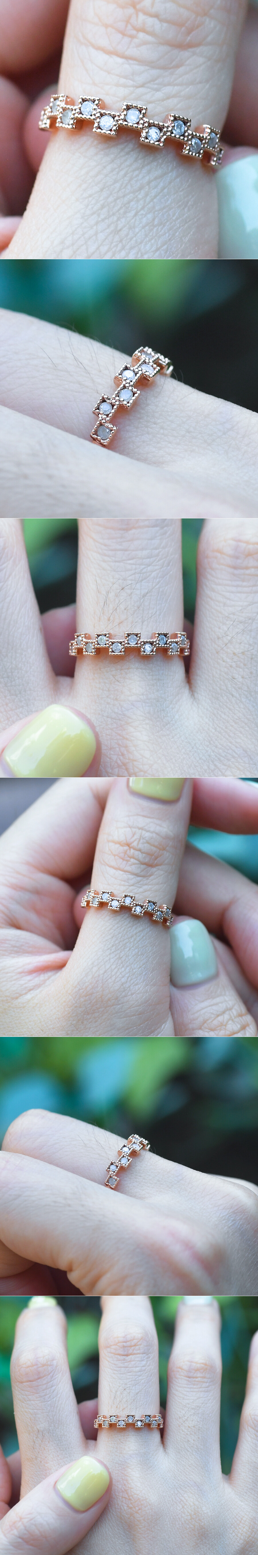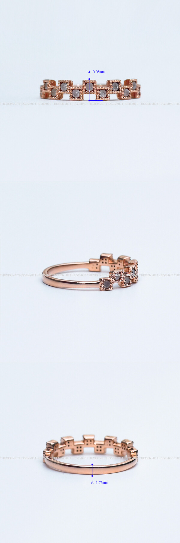 멜리 사이즈의 라운드 브릴리언트컷 러프 다이아몬드가 세팅된 다이아몬드 반지입니다. 지그재그 패턴의 유니크한 사각 디자인으로 포인트 및 레이어드 반지로 착용하시기 좋아요. 이미지에는 청아한 빛깔의 그레이 러프 다이아몬드가 세팅된 제품으로 촬영되었구요, 다이아몬드 색상은 그레이 외에도 블루, 코냑 (브라운 계열), 옐로우, 그린 등으로 옵션에서 변경 가능합니다. 핸드메이드 느낌의 유니크한 다이아몬드를 찾으시는 분들께 추천해 드릴게요 :)