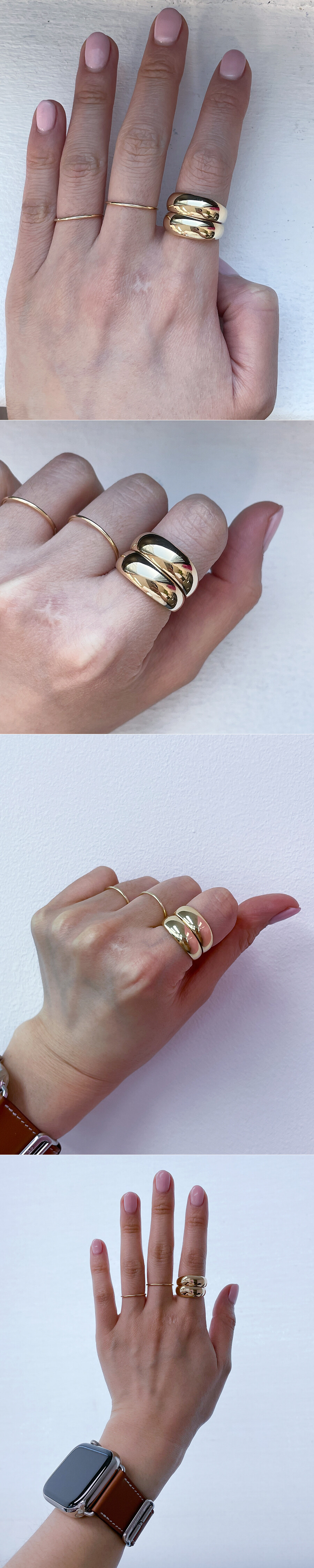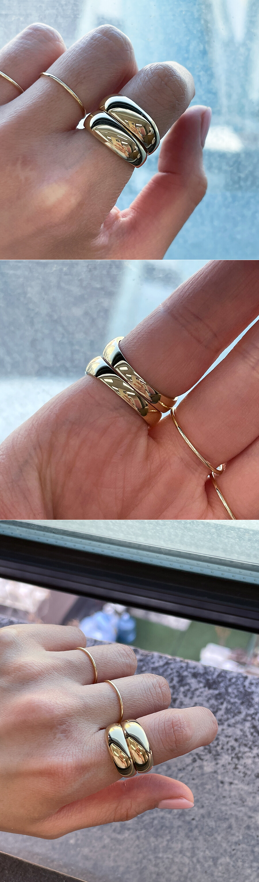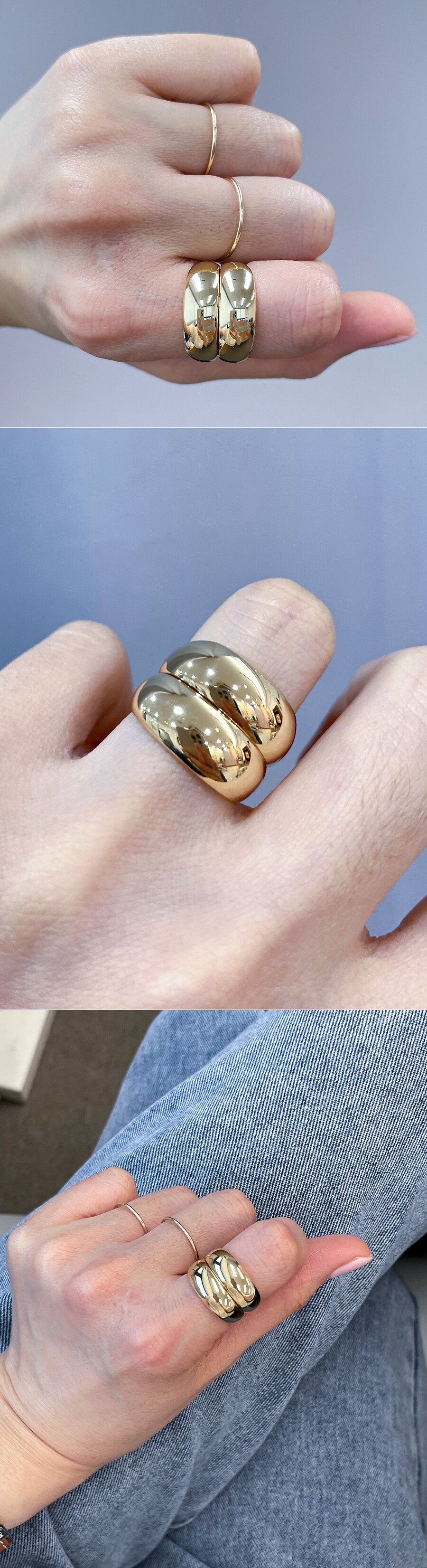 볼륨감 있는 디자인의 볼륨 반지입니다. 유행도 안타고, 가볍고, 편안하고, 중량감까지 잘빠진 착한 반지에요! ♥ 하나만 착용하셔도 예쁘지만, 쌍가락지로 나온 제품인만큼 사진처럼 두개를 함께 끼워주시면 훨씬 더 볼륨감도 있어 보이고 2배로 예쁘답니다! ※ 게시된 가격은 반지 1개 가격입니다. (쌍가락지로 끼우시고 싶으신 분들은 2개를 구매해 주셔야 합니다.)