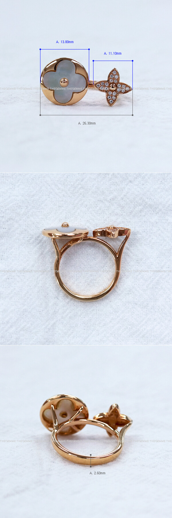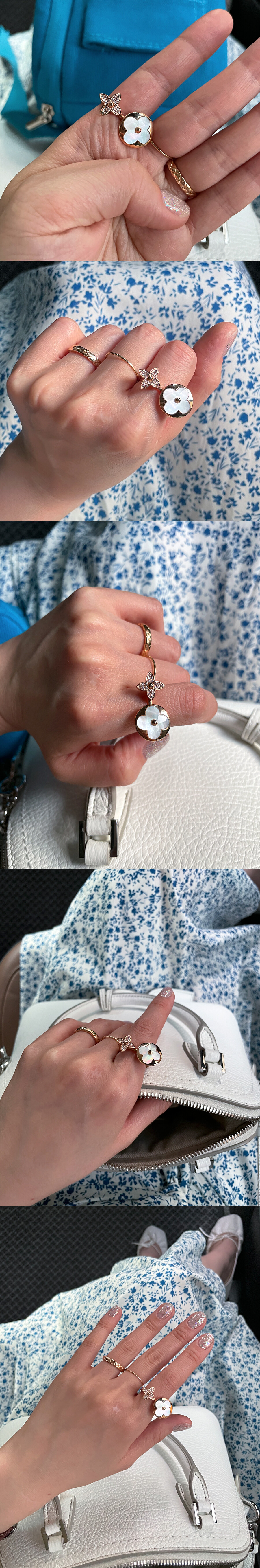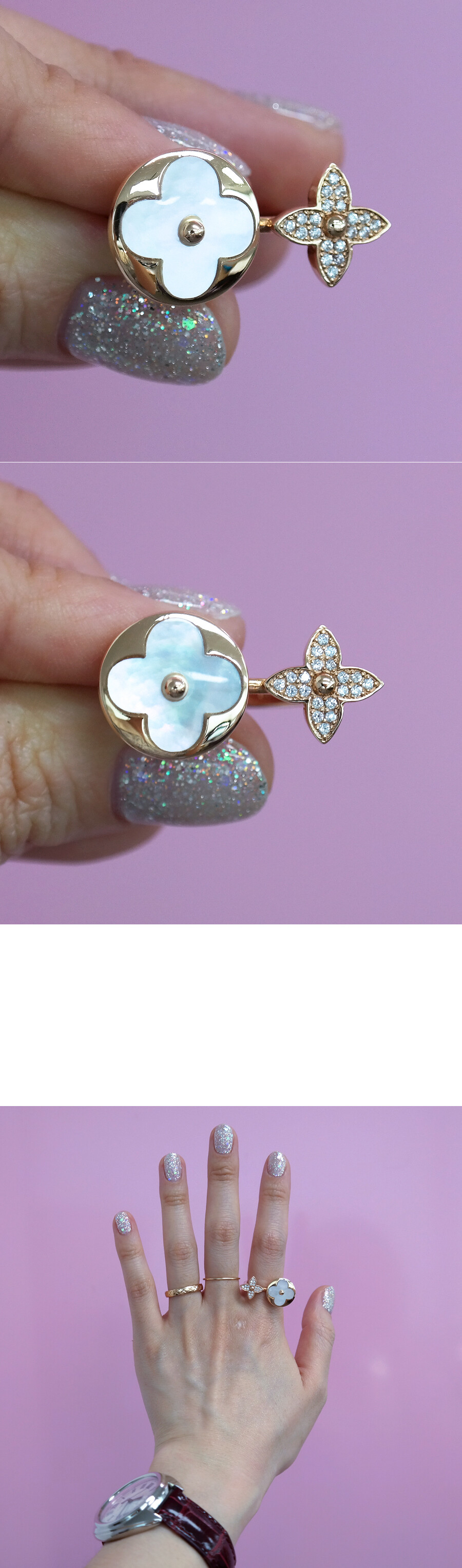 중량감이 다소 나가는 묵직한 스타일의 크로버 반지입니다. 트윈 크로버 디자인으로 오픈 반지처럼 보이지만 오픈된 반지는 아니니 참고해 주세요. 큐빅과 자개가 함께 어우러진 스타일로 라운드 크로버 내부에는 화이트 자개 스톤이 세팅되었어요. 유니크한 매력과 함께 자개의 마더 오브 펄 효과 때문에 밝고 화사한 느낌이 있어서 보면 볼수록 여성스러운 느낌이 물씬 풍기는 반지랍니다. 고급스럽고 화사한 느낌의 반지를 찾으시는 분들께 추천해 드릴게요 :)
