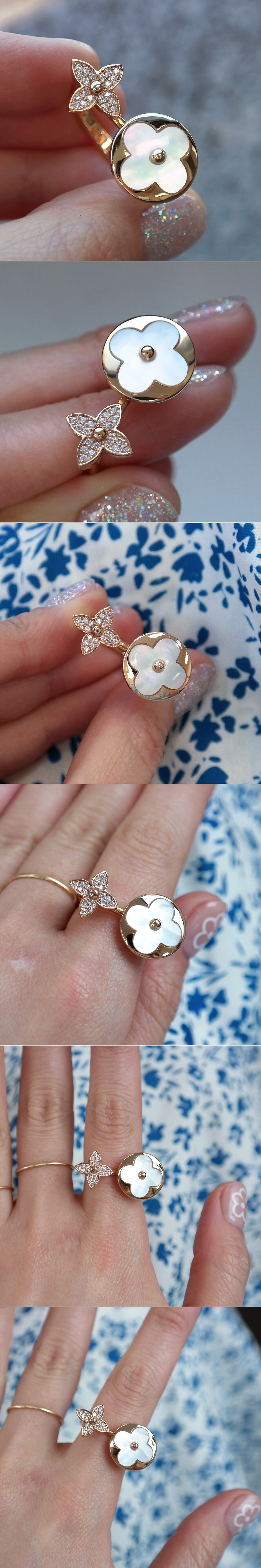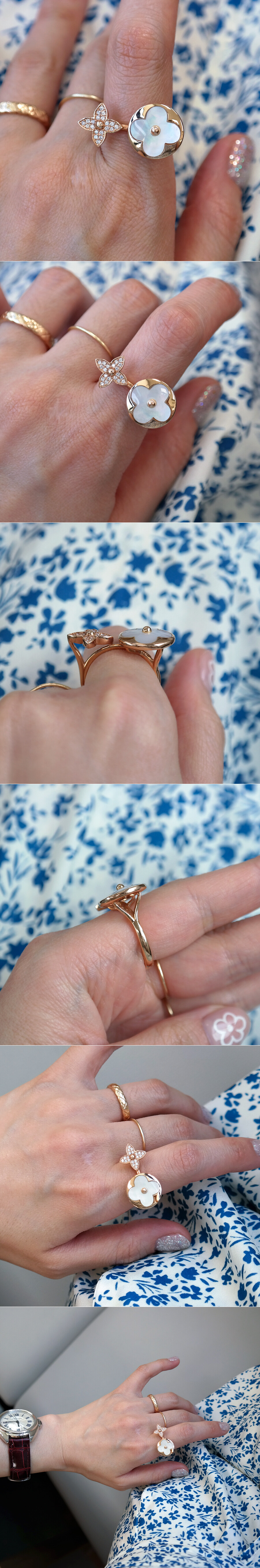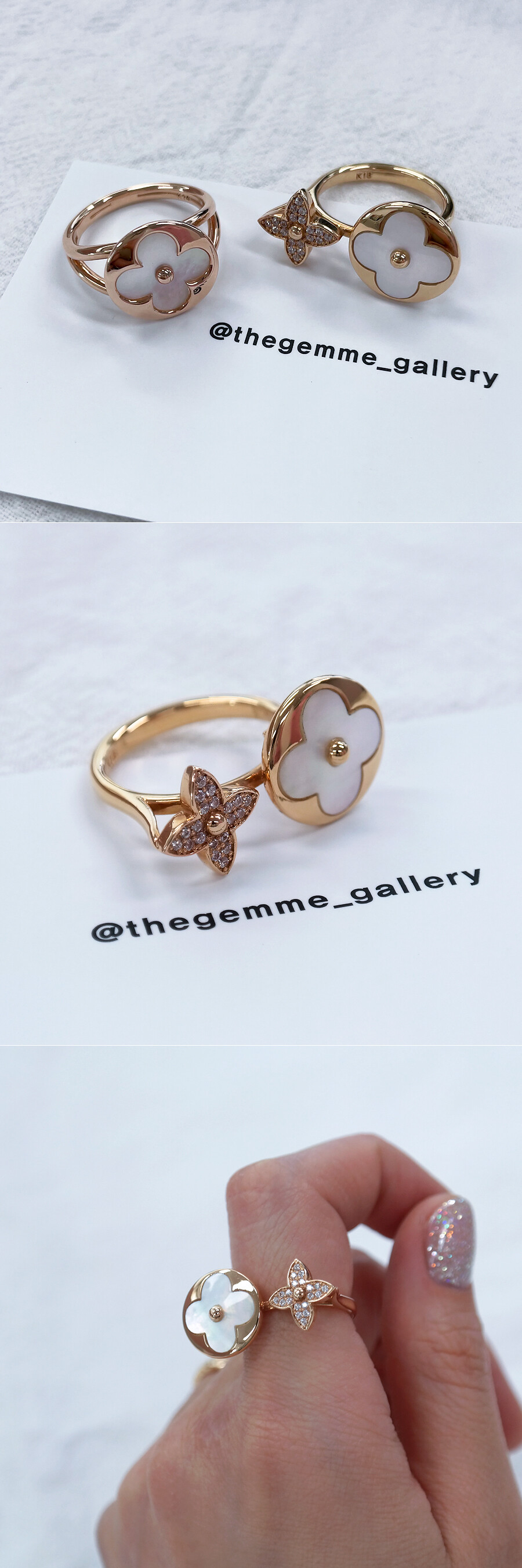 중량감이 다소 나가는 묵직한 스타일의 크로버 반지입니다. 트윈 크로버 디자인으로 오픈 반지처럼 보이지만 오픈된 반지는 아니니 참고해 주세요. 큐빅과 자개가 함께 어우러진 스타일로 라운드 크로버 내부에는 화이트 자개 스톤이 세팅되었어요. 유니크한 매력과 함께 자개의 마더 오브 펄 효과 때문에 밝고 화사한 느낌이 있어서 보면 볼수록 여성스러운 느낌이 물씬 풍기는 반지랍니다. 고급스럽고 화사한 느낌의 반지를 찾으시는 분들께 추천해 드릴게요 :)