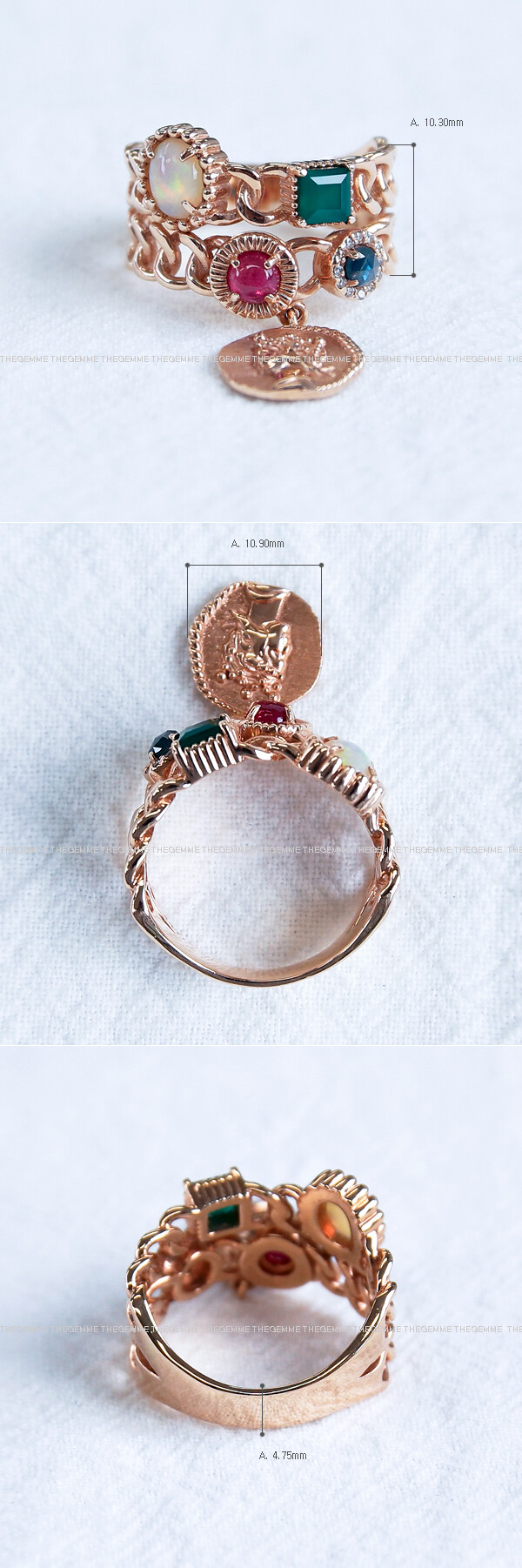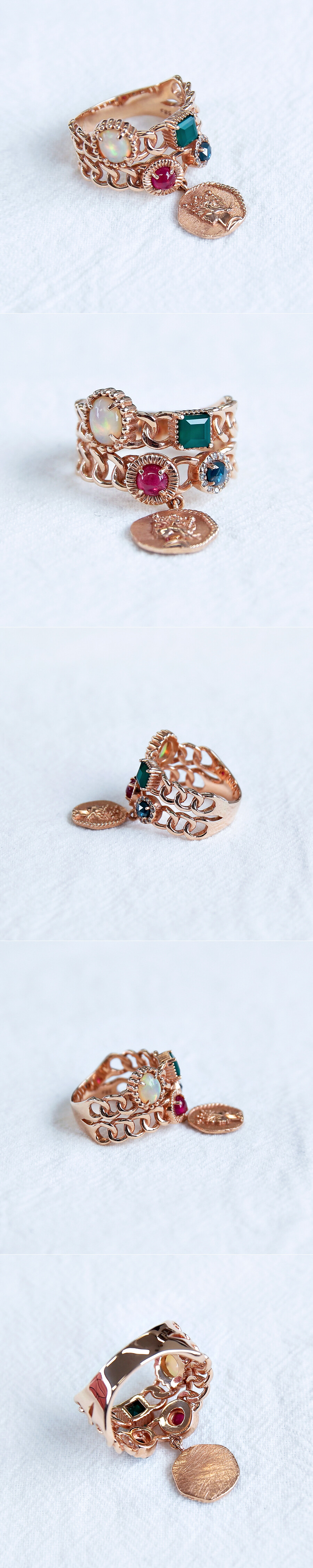 다양한 원석이 셋팅된 칵테일 스타일의 체인 반지입니다. 왕관을 쓴 여인의 옆모슾이 양각으로 새겨진 딸랑이 코인까지 포인트로 들어가 있어요 :) 전체적으로 너무너무 고급스러운 디자인이구요, 중량감이 나가는 묵직~한 스타일의 반지입니다. 셋팅된 원석은 오벌 캐보션 형태의 레인보우 화이트 워터 오팔, 반투명한 스퀘어 형태의 그린 오닉스, 라운드 캐보션 형태의 루비, 그리고 불투명한 로즈컷 형태의 블루 사파이어가 셋팅되었습니다. 다양한 컬러와 다양한 쉐입을 가진 원석들의 매칭도 너무나도 예쁘구요, 살짝 두터우면서 앤틱한 느낌의 코인도 너무너무 고급스럽답니다. 전체중량 14K 기성사이즈 (12호기준) 약 두.돈 3푼정도 나오니 참고해주시구요~ 다양한 면에서 시선을 사로잡는 디자인이라, 레이어드 반지나 포인트 반지로 좋을듯 싶어요. 유색석을 좋아하시는 분들에게 완전 강추해드립니다! :)