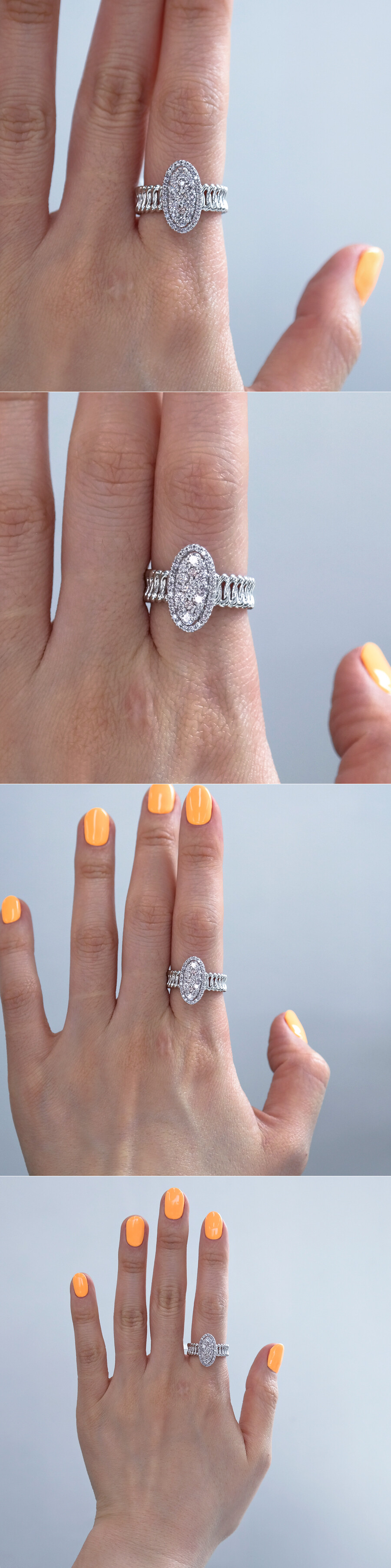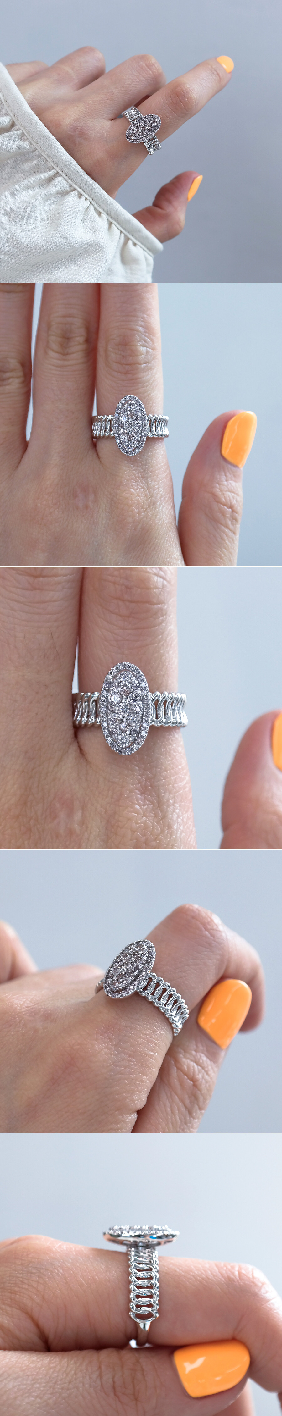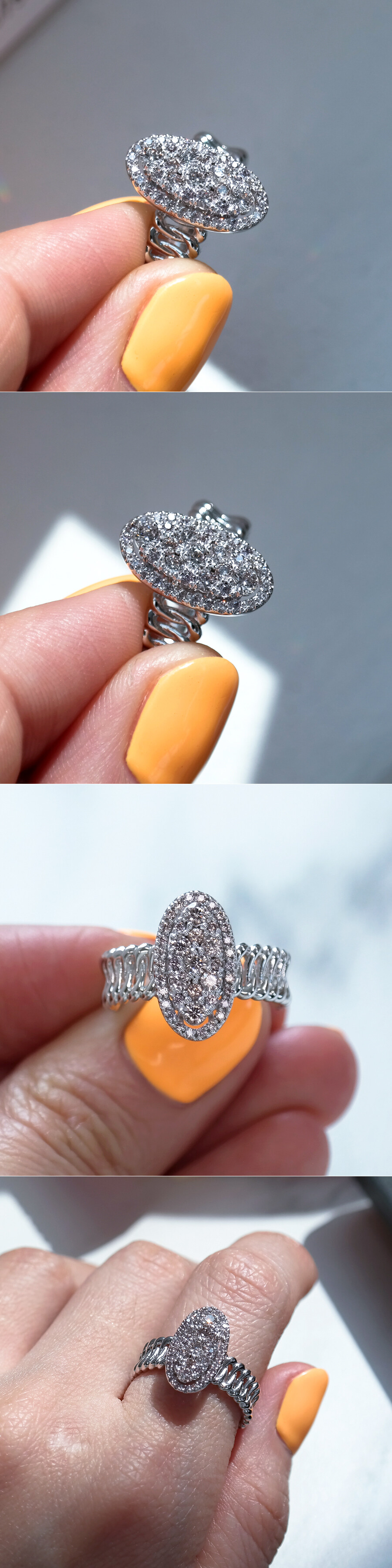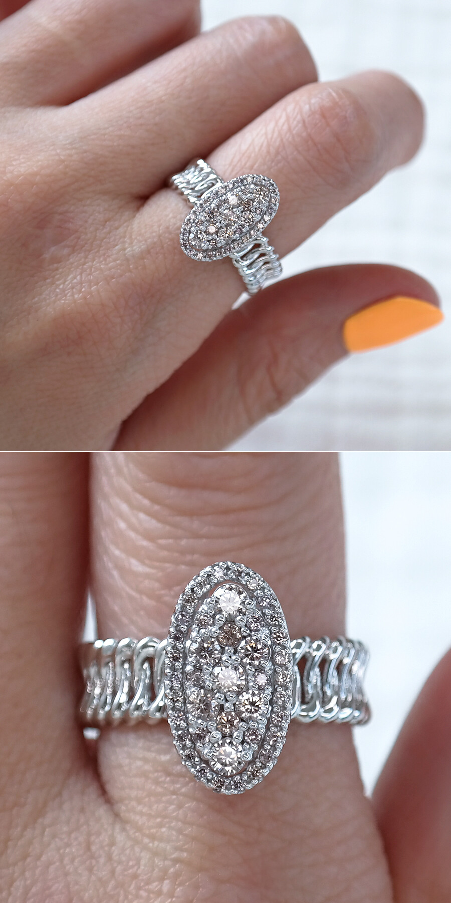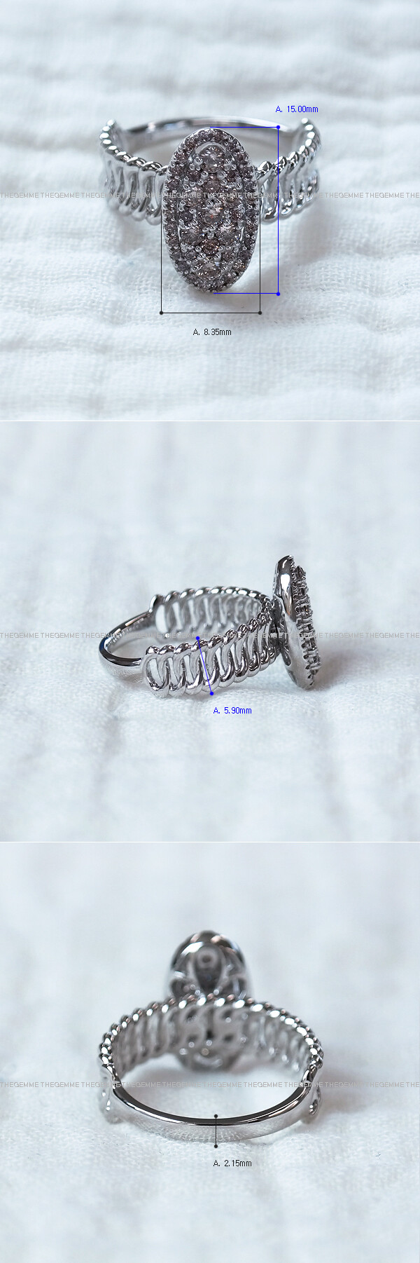 아주 연한 코냑 다이아몬드 색상의 큐빅이 세팅된 오벌 디자인의 포인트 반지입니다. (기존 코냑 다이아몬드 세팅 제품을 비슷한 색상의 큐빅으로 대체하여 가격 부분에서 착하게 제작된 아이에요.) 다양한 사이즈의 큐빅이 촘촘히 세팅된 스타일이라 다양한 각도에서 화려한 빛나면서도 둥글둥글한 곡선 디자인의 체인 밴드와 함께 어우러져 부드러운 이미지를 가진답니다. 고급스러운 느낌이 물씬 풍기는 디자인으로 포인트 반지로 추천해 드려요. 원하시는 경우 추가 옵션에서 화이트 큐빅으로 변경하셔서 세팅 가능하니 참고해 주세요 :)