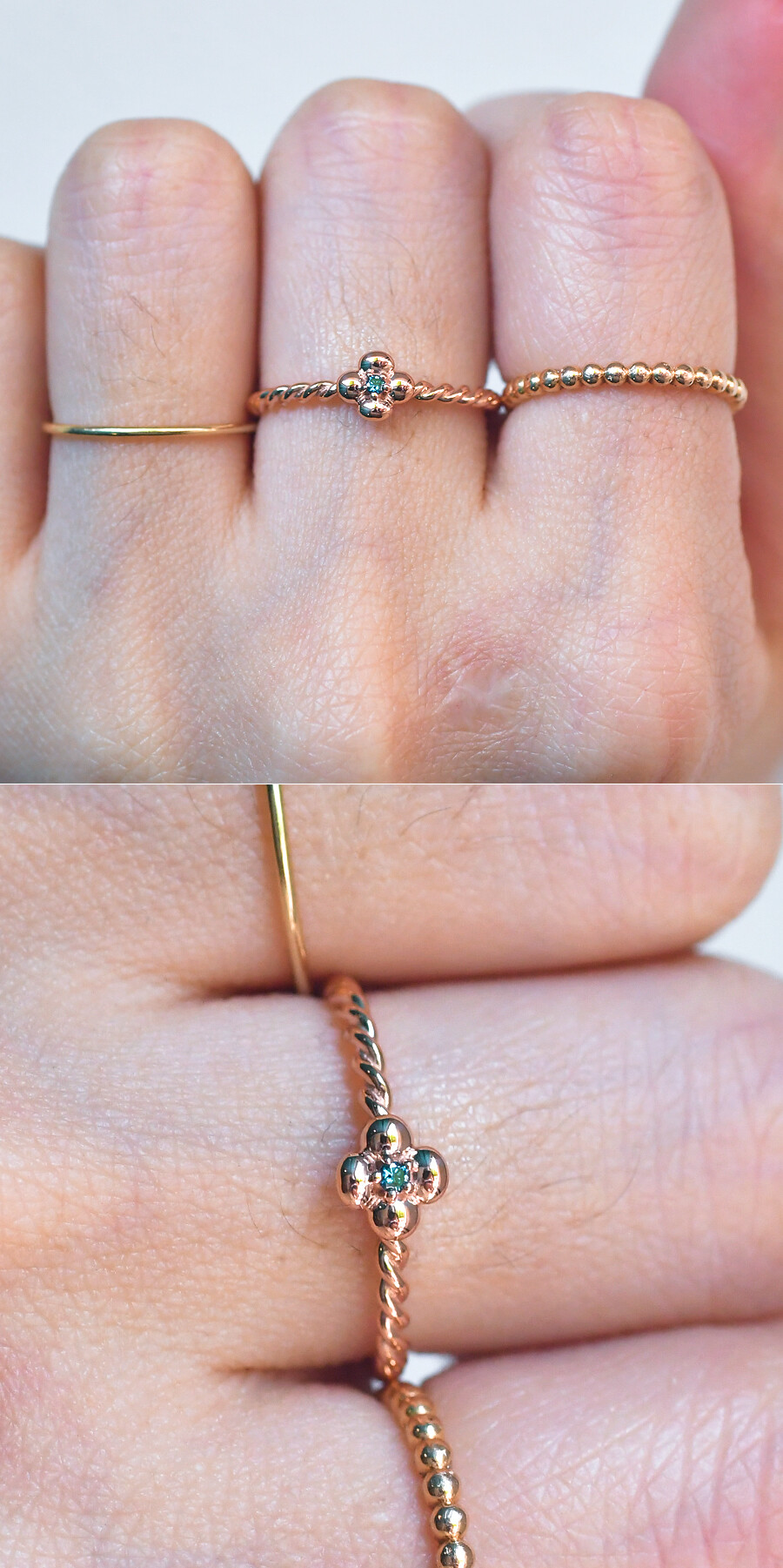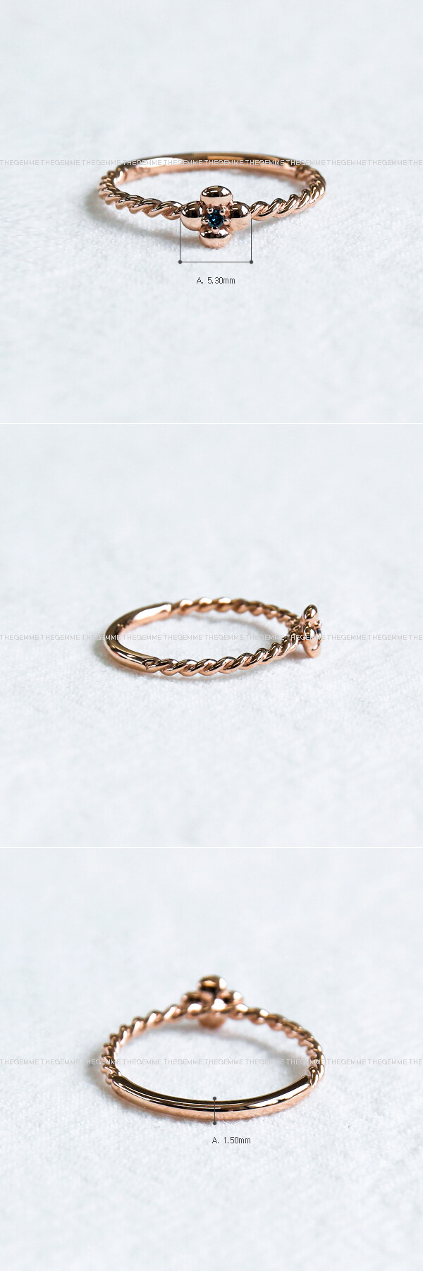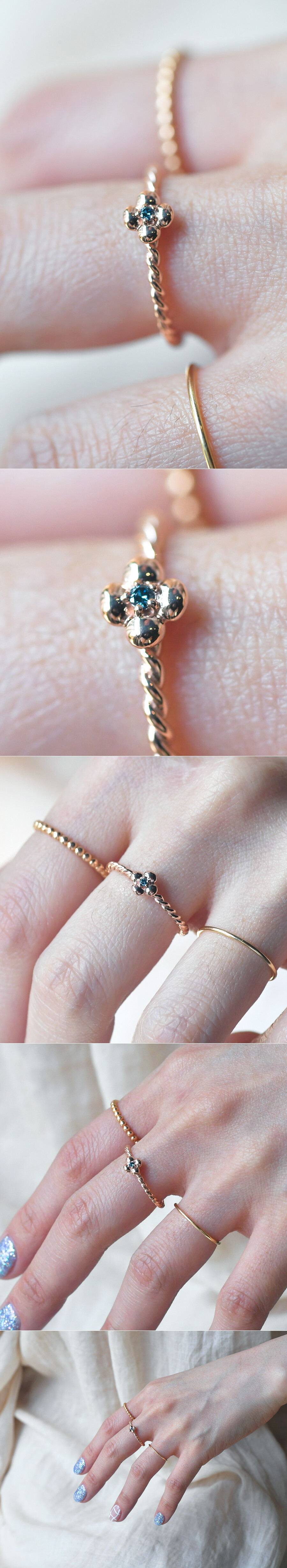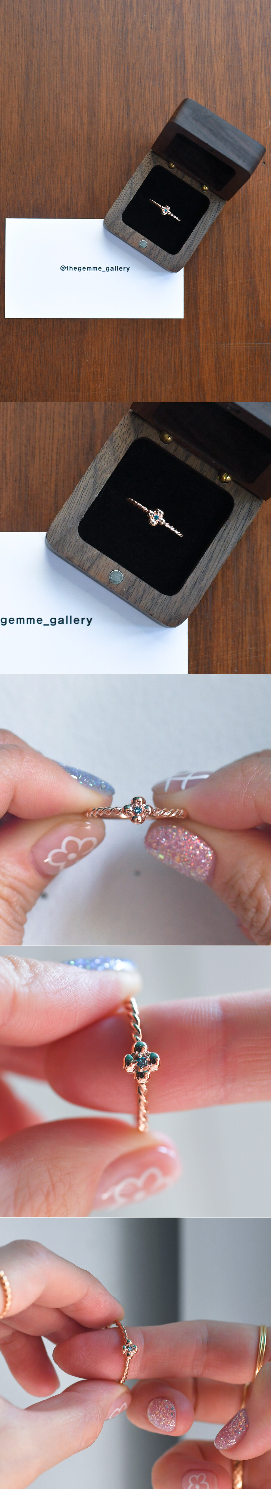 동글동글 귀여운 꽃 모양의 다이아몬드 반지입니다. 미니멀한 사이즈로 중앙에 블루 다이아몬드가 세팅되었구요, 꽈배기 라인의 밴드 디자인으로 작지만 고급스러운 느낌이 있어요. 데일리 및 레이어드 반지로 추천해 드릴게요. ❤️