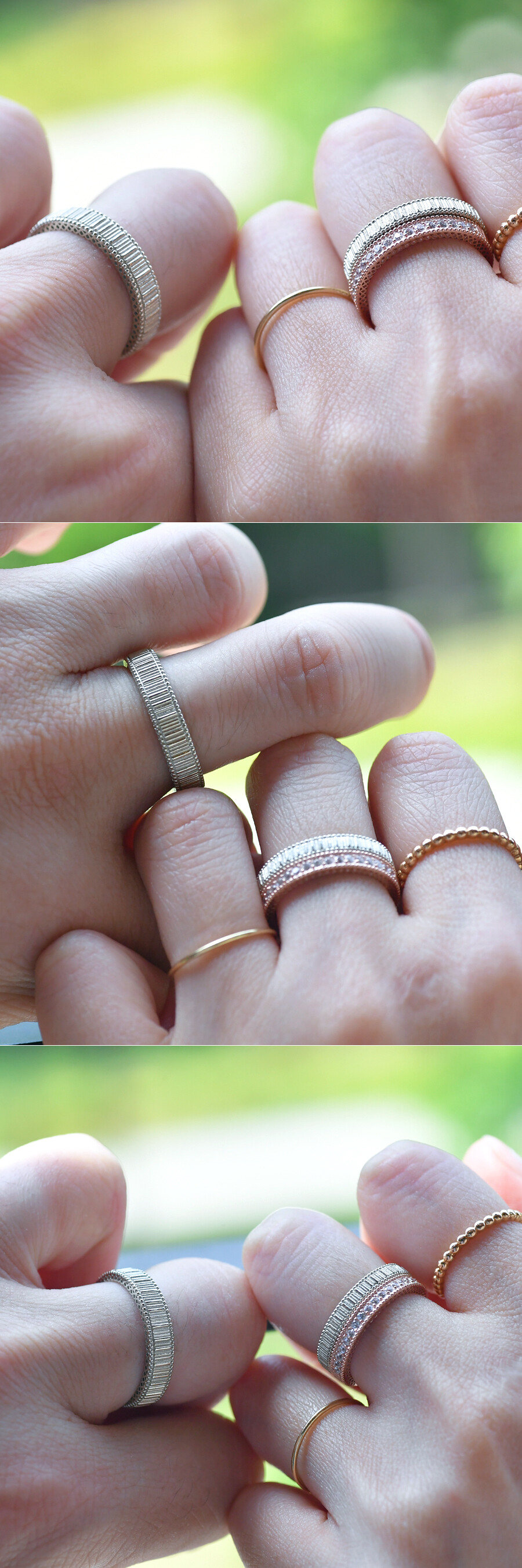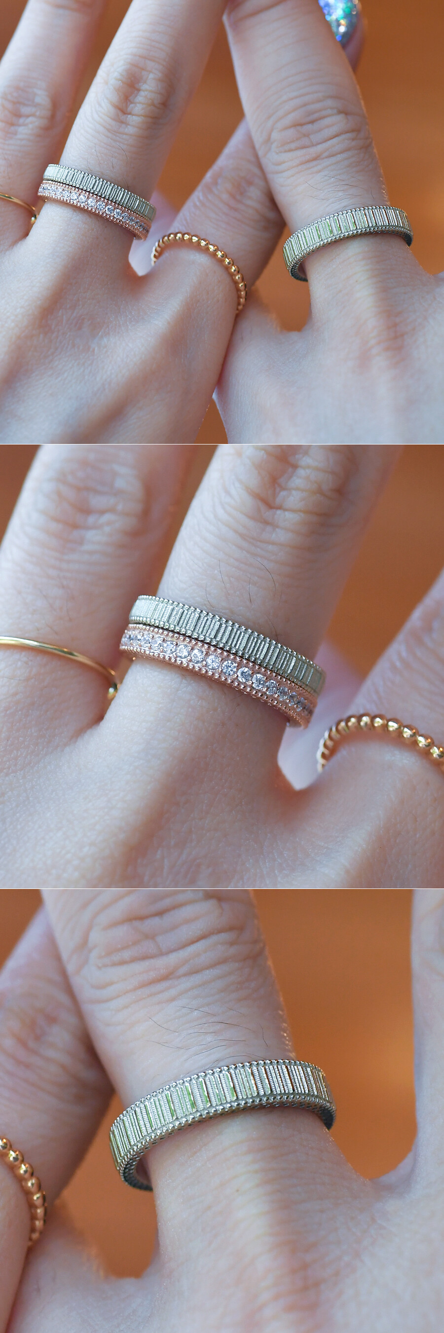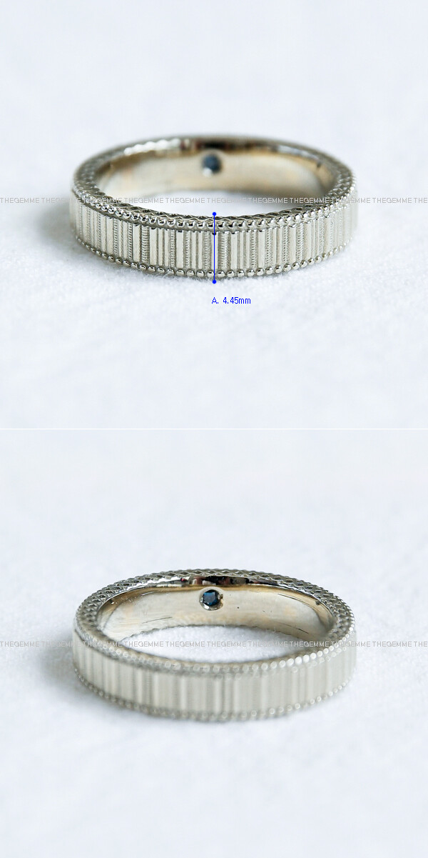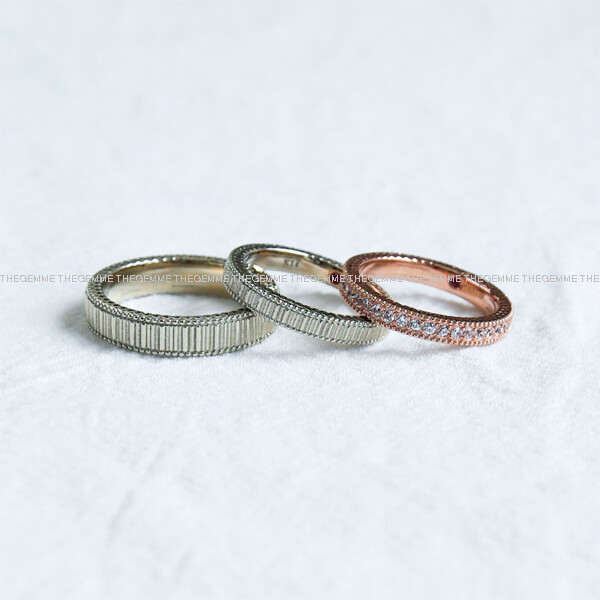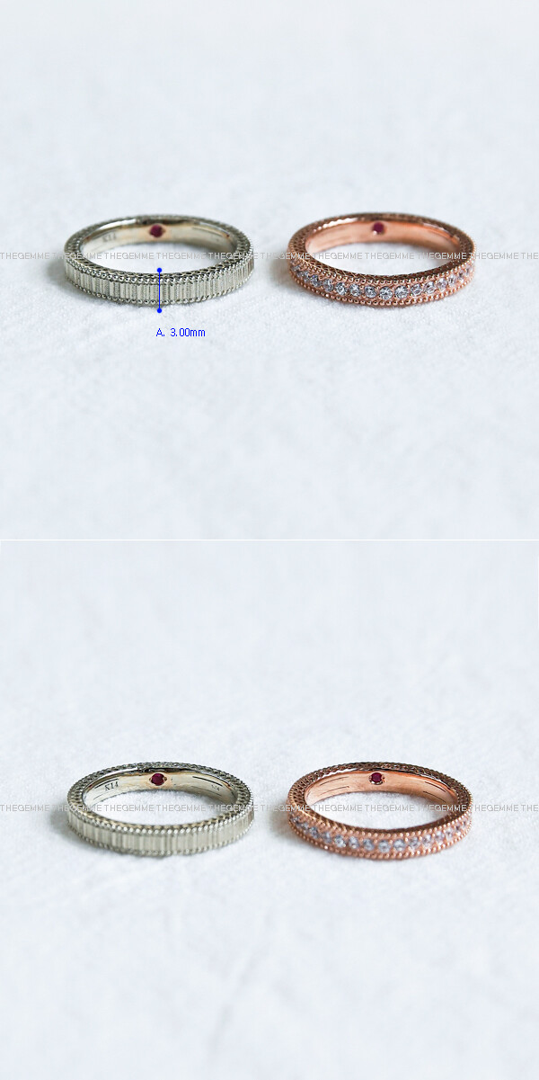 시그니처 디자인의 남녀 커플링입니다. 심플하면서도 세련된 느낌을 주는 빗살 문양의 외관으로 은은한 금속의 광택을 보여주는 아이에요. 요 아이는 외관상으로는 잘 보이지 않는 측면과 내부 (반지 안쪽) 디자인에 신경을 많이 쓴 시그니처 반지로 ; 보면 볼수록 시크릿한 매력을 고루 갖추고 있는 반지랍니다. 특히, 반지 내부 디자인의 경우 ; 반지 안쪽 면에 원하시는 스톤을 세팅하실 수 있게 제작되어 탄생석이나 다이아몬드 등 원하시는 스톤을 세팅해 다양한 의미를 더할 수 있다는 장점이 있어요. (이미지에는 블루 사파이어 (대) 사이즈와 루비 (소) 사이즈가 세팅되었습니다.) 이 외에도 정교한 문양이 들어간 반지의 측면 디자인도 보면 볼수록 매력적으로 눈에 들어온답니다. 자세한 디테일은 이미지에서 확인해 주시구요, 여자 반지 (소) 사이즈의 경우 ; 두 가지 타입으로 민자 디자인과 큐빅 디자인으로 나뉩니다. 큐빅 디자인은 360도 디자인이 들어간 반지로 이터니티 스타일로 전체 큐빅이 세팅되어요. 특별한 의미를 새길 수 있는 볼드한 스타일의 커플링 또는 우정링을 찾으시는 분들께 적극 추천해 드릴게요.