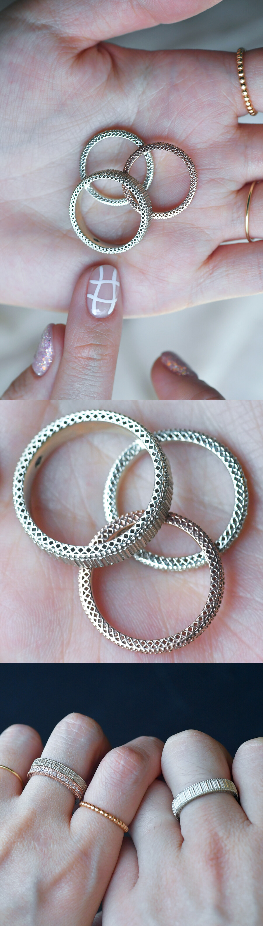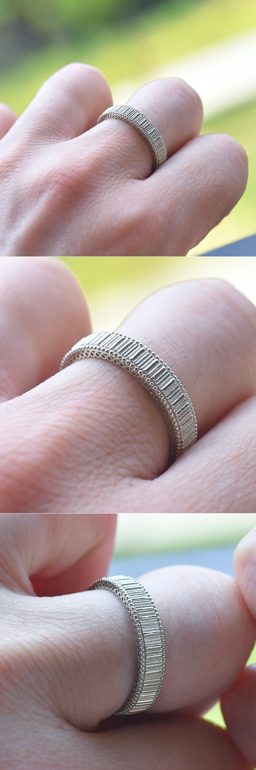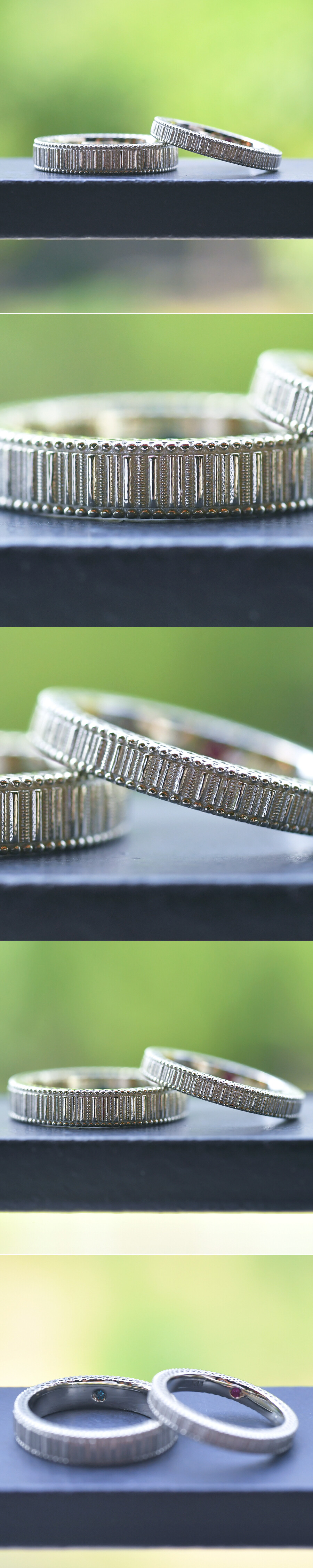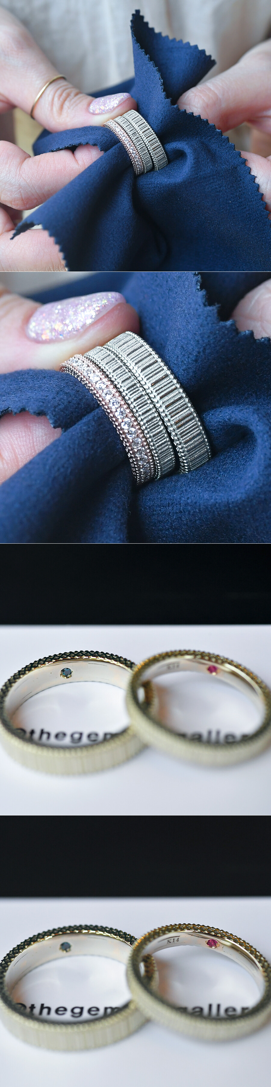 시그니처 디자인의 남녀 커플링입니다. 심플하면서도 세련된 느낌을 주는 빗살 문양의 외관으로 은은한 금속의 광택을 보여주는 아이에요. 요 아이는 외관상으로는 잘 보이지 않는 측면과 내부 (반지 안쪽) 디자인에 신경을 많이 쓴 시그니처 반지로 ; 보면 볼수록 시크릿한 매력을 고루 갖추고 있는 반지랍니다. 특히, 반지 내부 디자인의 경우 ; 반지 안쪽 면에 원하시는 스톤을 세팅하실 수 있게 제작되어 탄생석이나 다이아몬드 등 원하시는 스톤을 세팅해 다양한 의미를 더할 수 있다는 장점이 있어요. (이미지에는 블루 사파이어 (대) 사이즈와 루비 (소) 사이즈가 세팅되었습니다.) 이 외에도 정교한 문양이 들어간 반지의 측면 디자인도 보면 볼수록 매력적으로 눈에 들어온답니다. 자세한 디테일은 이미지에서 확인해 주시구요, 여자 반지 (소) 사이즈의 경우 ; 두 가지 타입으로 민자 디자인과 큐빅 디자인으로 나뉩니다. 큐빅 디자인은 360도 디자인이 들어간 반지로 이터니티 스타일로 전체 큐빅이 세팅되어요. 특별한 의미를 새길 수 있는 볼드한 스타일의 커플링 또는 우정링을 찾으시는 분들께 적극 추천해 드릴게요.