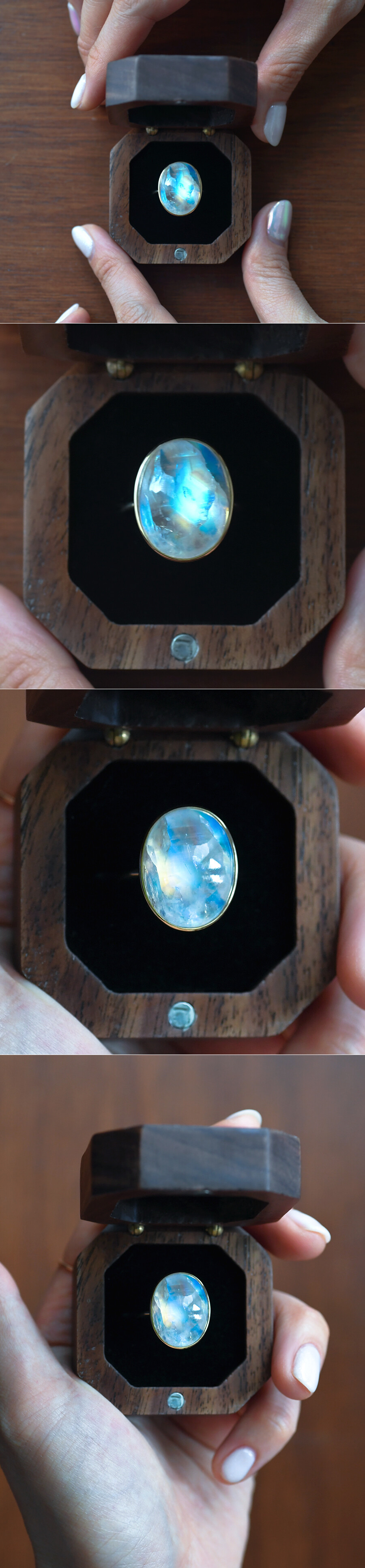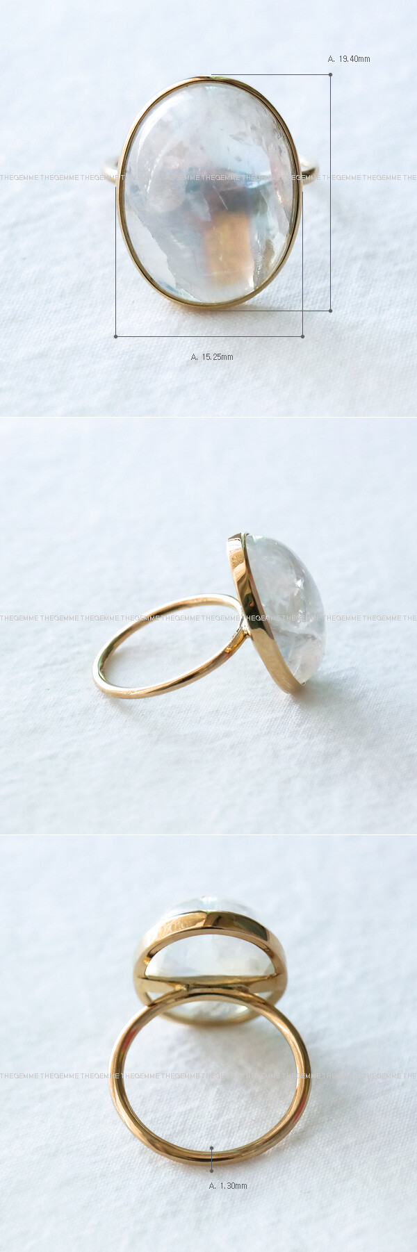 화려한 광학효과를 가진 14X18mm 사이즈의 큰 사이즈 문스톤 캐보션입니다. 유색효과 보석들 중에서도 이렇게 강한 광학효과를 나타내는 스톤의 경우, 별다른 디자인을 추가하지 않고 원석을 감싸는 심플한 디자인으로 제작을 하고 있어요. 특히나 이 아이는 사이즈가 무지 커서 원석 자체만으로도 돋보이기 때문에 역시나 깔끔한 라인으로 제작하였습니다. 앞에서도 언급하였듯이 스톤의 사이즈가 커서 확실히 문스톤만이 가지는 유색효과인 아둘라레센스 효과도 뛰어나답니다. 진주와 함께 6월의 탄생석으로도 각광받고 있는 문스톤은 펠드스파 그룹의 보석 변종의 하나로서 각도에 따라서 다양한 컬러로 산출되는 변채 효과를 가지는데, 이 아름다운 유색효과로 인하여 많은 사람들에게 알려진 보석 중에 하나랍니다. 문스톤도 유색효과가 있는 문스톤이 있고 그렇지 않은 문스톤이 있는데 보통은 유색효과를 띄는 문스톤이 가치가 훨씬 더 높습니다. 그중에서도 가장 가치 있는 컬러는 런던 블루 계열의 색상과 무지개색이 한꺼번에 표출되는 것이 가장 가치가 높아요. 세팅된 문스톤은 많은 내포물들과 크랙이 있지만 강렬하고 매혹적인 레인보우 컬러를 나타내는 문스톤이랍니다. (문스톤은 내부에 무수히 많은 내포물과 내부 균열들로 인하여 광학효과가 나오는 아이입니다.) 자세한 유색효과는 사진으로만 담기가 힘든 부분이 있기 때문에 동영상을 첨부해 드리니 영상을 꼭 참고해 주시구요, 움직일 때마다 강렬하게 보여지는 레인보우 효과와 블루 쉴드효과 역시 아주 뛰어난 아이로 신비로운 빛의 영롱한 반지를 찾으시는 분들에게 완전한 포인트 반지로 추천해 드립니다. 💙 * 이미지 제품은 하나밖에 없는 스톤으로 제작한 반지로, 온리원 (Only One) 제품입니다. 총 1점 제작되었으며 사이즈 조절이 가능합니다. (당일 발송은 제작된 사이즈 기준이며 사이즈 조절 요청 시에는 제품을 받으시는 날까지 2~3일 정도 소요되니 이 점 꼭 참고해 주세요.)