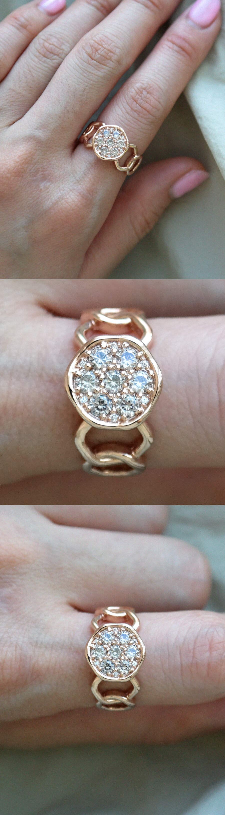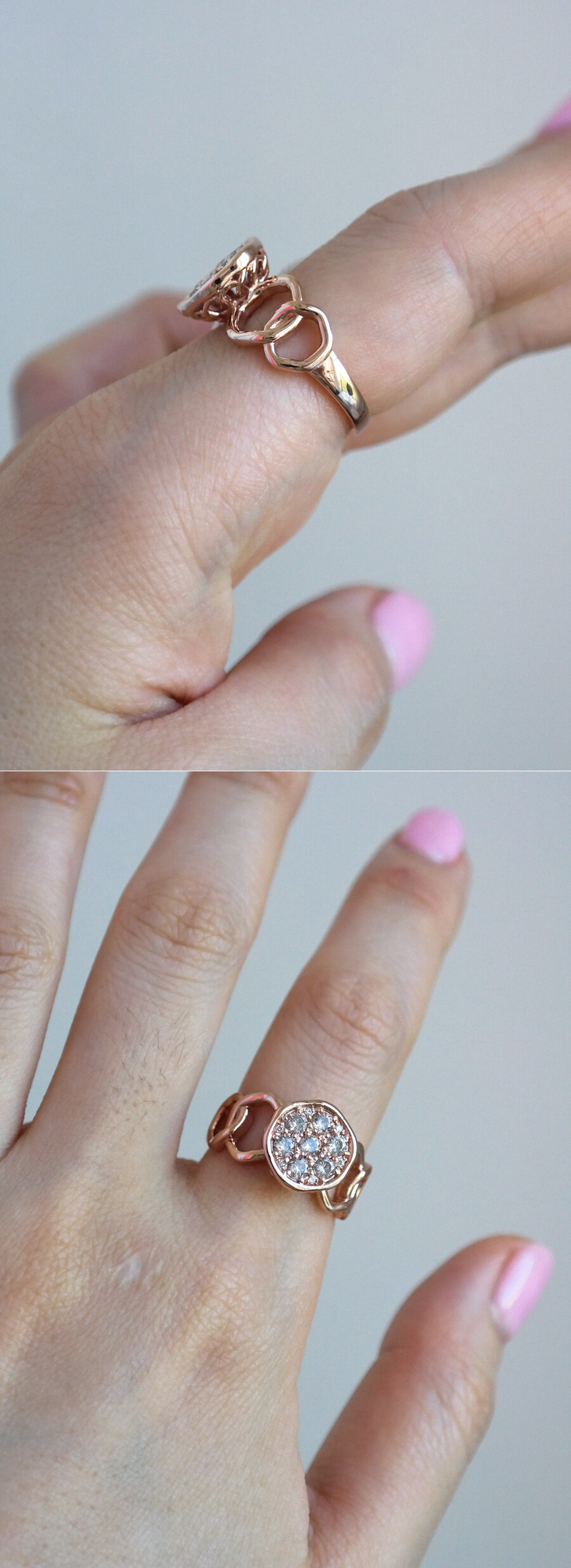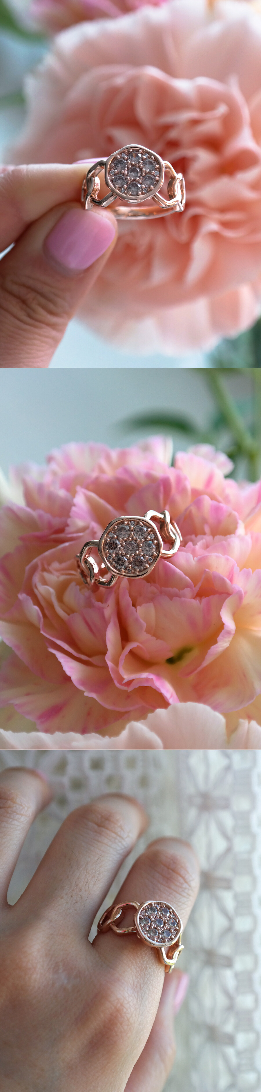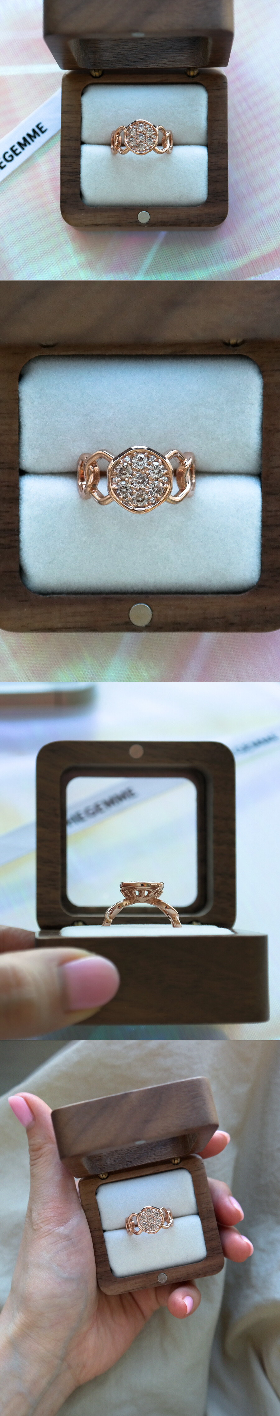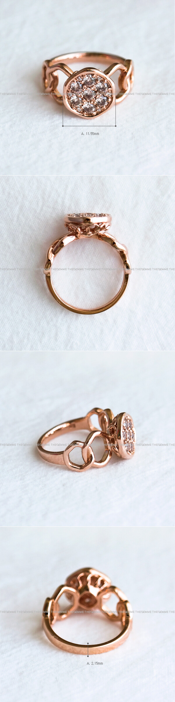 여성스럽고 고급스러운 느낌이 물씬 풍기는 디자인의 메인 반지입니다. 스톤은 코냑 다이아몬드와 컬러가 유사한 코냑 큐빅 컬러의 큐빅이 세팅되었어요. 크고 작은 사이즈들의 큐빅들이 촘촘히 세팅된 파베 세팅 디자인으로 움직일 때마다 반짝이는 느낌이 고급스럽게 보여집니다. 약 1부가 조금 못 되는 사이즈의 큐빅들이구요, 자세히 보시면 가장자리 부분에도 서브 스톤으로 작은 스톤들이 세팅되어 있어요. 스톤을 감싸고 있는 사이드 부분의 금속도 테두리가 완벽한 느낌의 원형이라기보다 살짝 굴곡진 핸드 디자인 형태의 라운드 느낌이라서 훨씬 더 고급스러운 느낌을 주는 것 같아요. 밴드 부분은 각진 형태의 넓은 체인 디자인입니다. 측면에서 보면 보다 유니크한 느낌이 있어요 :) 디자인에 대한 설명을 글로 자세히 적어보았는데, 굳이 설명이 필요 없을 정도로 충분히 여심을 자극할 만한 디자인의 반지랍니다! 중량감도 있어서 그립감도 좋구요, ^^ 여자라면 모두가 마음에 들어 할 만한 디자인이라 포인트 반지 및 레이어드 반지로 추천해 드릴게요. ❤️
