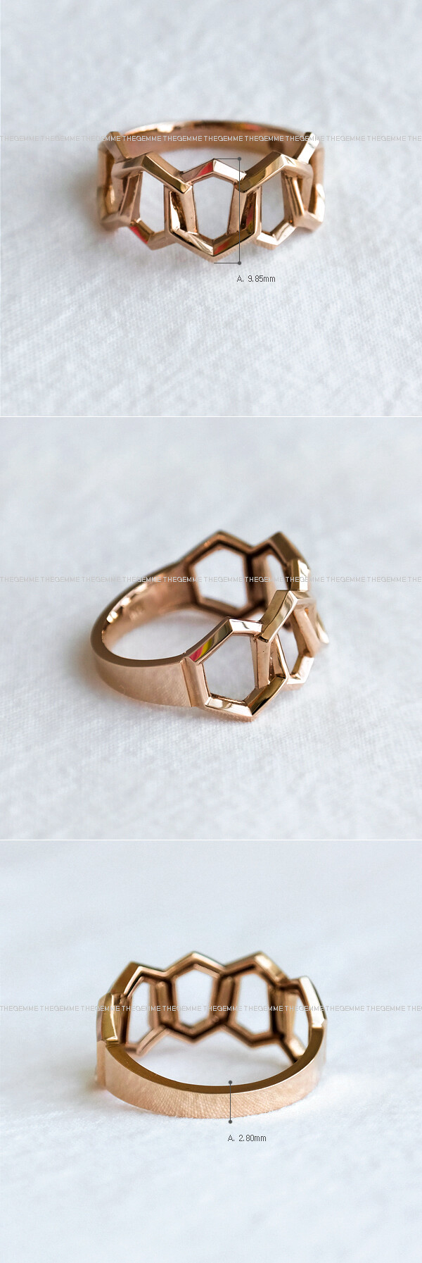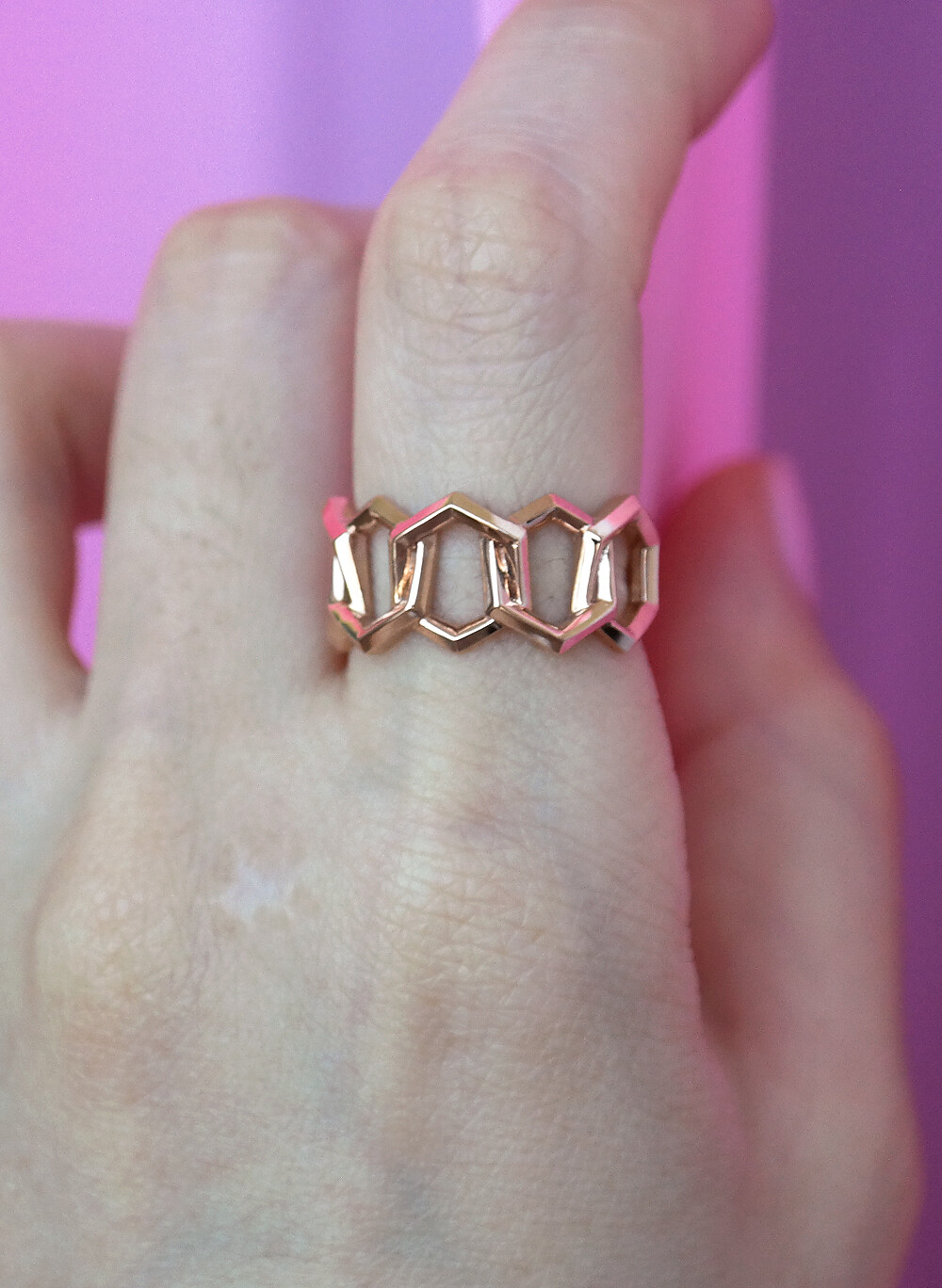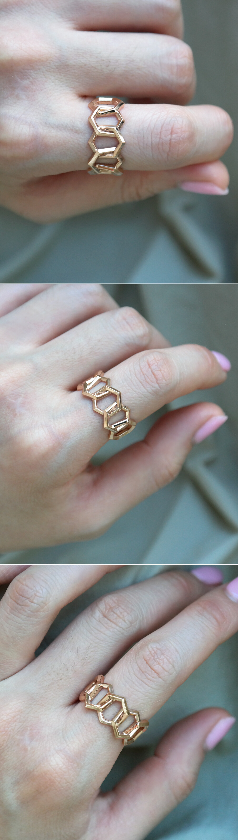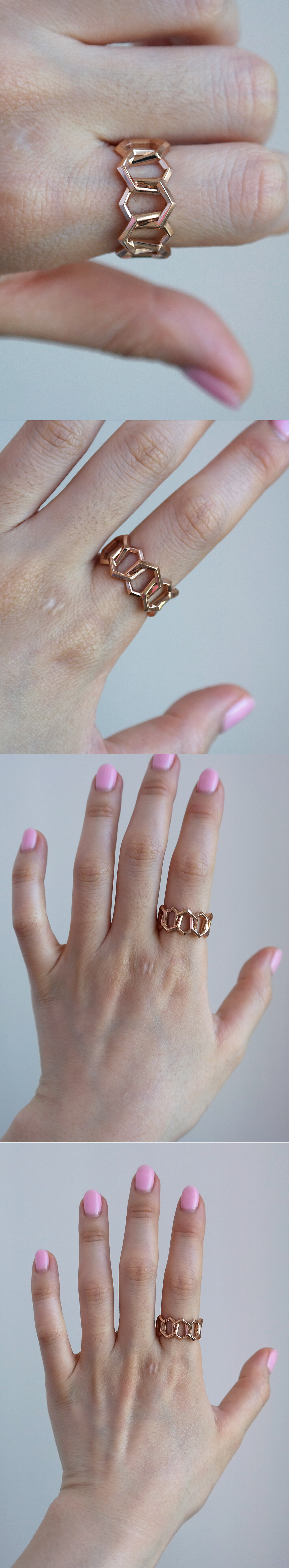 육각형 모양의 도형이 링크 스타일로 연결된 체인 반지입니다. 세련된 느낌으로 착용하시기 좋아요. 🙂💛