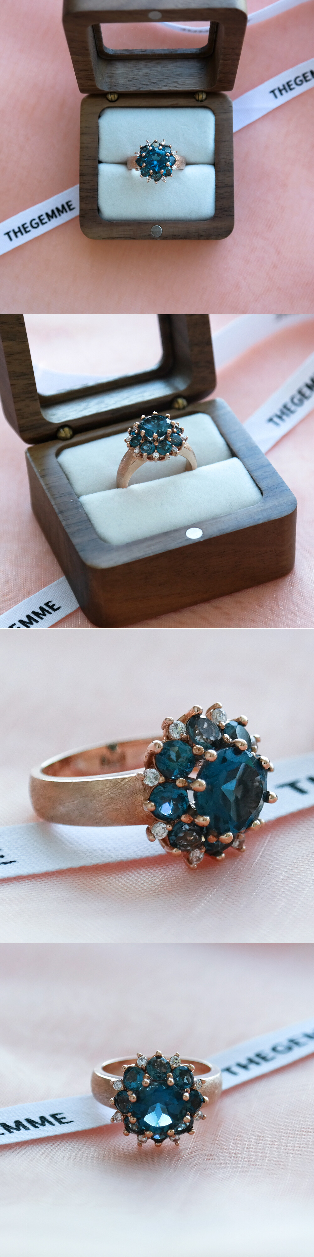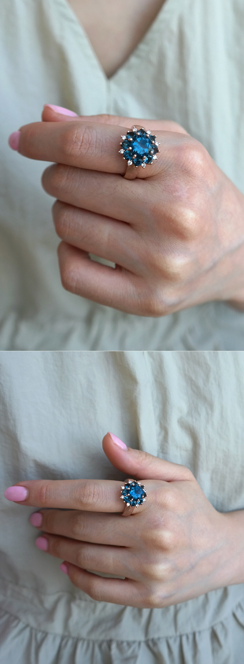 중후한 매력을 풍기는 런던블루 토파즈가 세팅된 플라워 디자인의 반지입니다. 💙 딥한 블루 컬러를 가진 일명 '런던블루 토파즈'는 차분한 감성과 깊은 바다색으로 많은 여성분들에게 사랑을 받고 있는 스톤 중에 하나인데요, 스톤 자체가 일반 블루 토파즈보다 색이 더 짙고 깊어서 훨씬 더 고급스러운 느낌을 준답니다. 기성 디자인은 런던 블루 토파즈와 큐빅이 함께 세팅된 디자인이구요, 올 스톤으로 원하시는 경우에는 화이트 큐빅 부분을 다이아몬드로 변경하셔서 주문해 주시는 것도 추천드릴게요 :) 기본적으로 중량감도 꽤 나가고 중앙에 세팅된 스톤도 약 2캐럿 사이즈로 큰 편이라 파인 주얼리 느낌으로 착용하셔도 좋을 것 같아요.☺️ 정교하고 섬세한 세팅으로 여성스러운 느낌이 있구요, 밴드 부분은 샌딩된 스타일로 마감되어 훨씬 더 세련되면서 앤틱한 느낌이 있답니다. (기본 골드 느낌인 유광으로 주문을 원하시는 분들은 추가 옵션에서 유광으로 변경하셔서 주문 가능합니다.) 스톤과 디자인 모두 중후한 느낌이 강하기 때문에 약 30대 중반 이상~ 여성분들에게 존재감 확실한 포인트 반지로 권해드릴게요! :) 💎