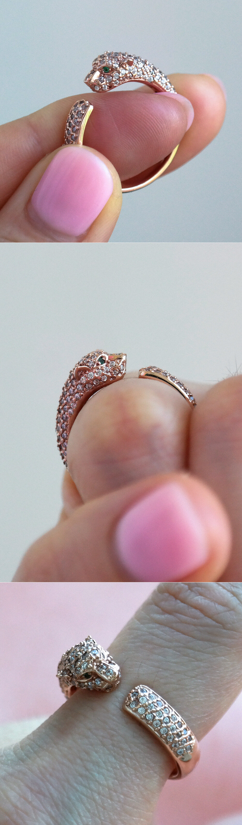 정교하고 디테일한 표범 디자인의 오픈 반지입니다. 💍 고급스러움이 돋보이는 볼드한 형태의 반지인데 자세히 보면 표정이 너무 앙증맞고 귀여운 표범이에요 ... 😊 우대를 제외한 전체 부분에 큐빅이 세팅된 디자인으로 약 140개에 달하는 큐빅들이 파베 세팅으로 촘촘하게 세팅되어 있어요. (눈 부분은 그린 색상 큐빅, 나머지 바디에 세팅된 큐빅들은 투명한 화이트 색상의 큐빅입니다.) 원하시는 경우 다이아몬드나 기타 원석으로 대체하셔서 주문 가능하시니 네이버 톡톡 문의 주세요! 중량감이 어느 정도 나가는 디자인이라 안정감 있는 데일리 반지로도 손색이 없답니다. 참고해 주시구요~ 자세한 디테일은 영상에서 확인해 주세요! :)