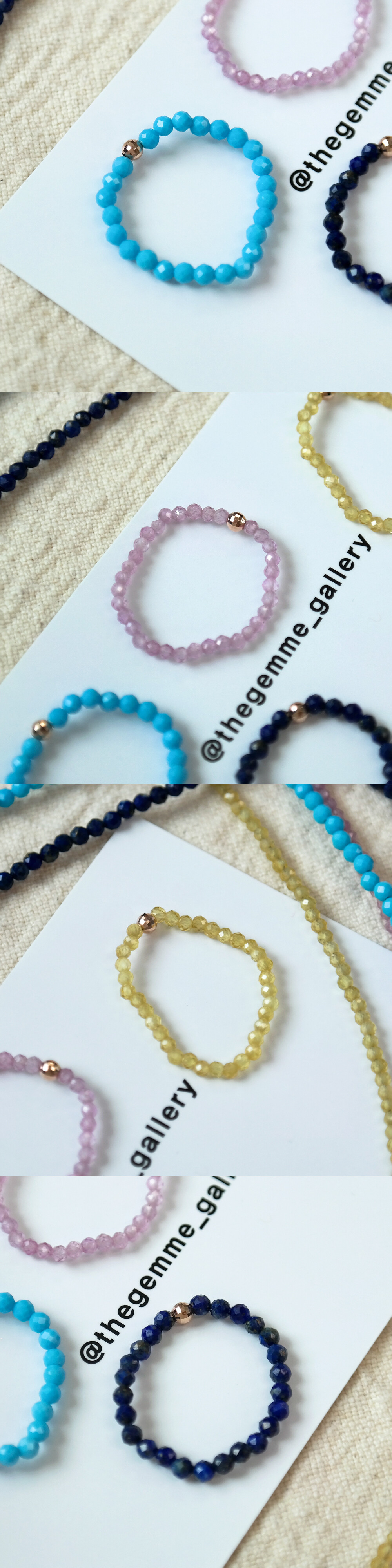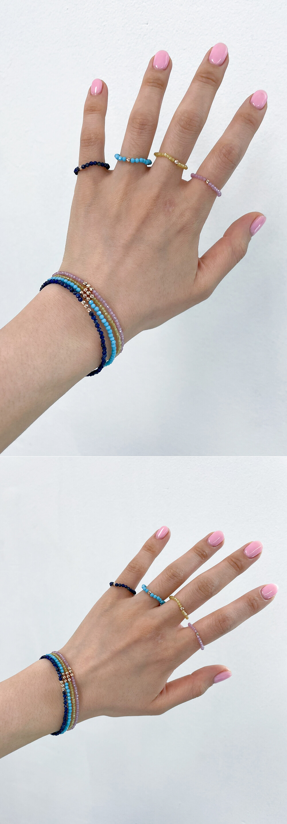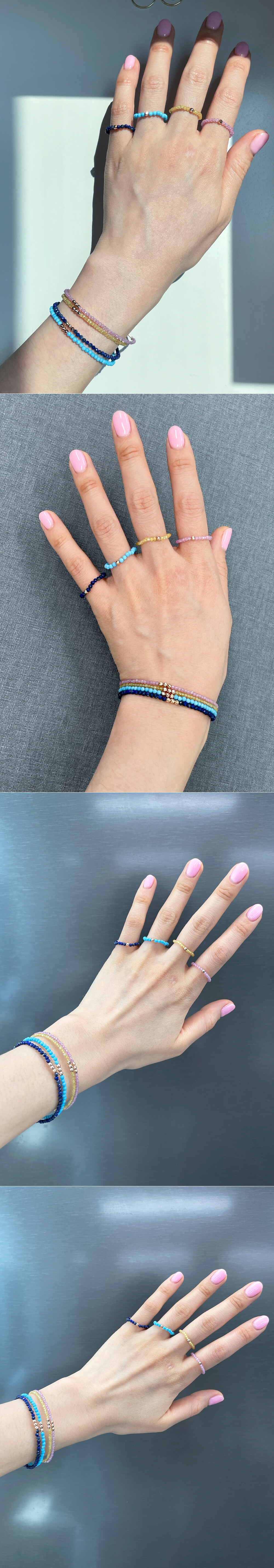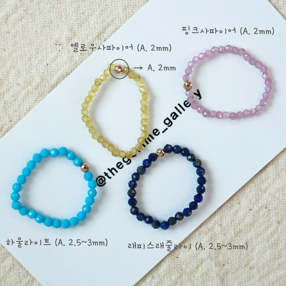 블리블리하고 화사한 느낌으로 착용하시기 좋은 원석 반지입니다, !!!!! ❤️ 론델컷으로 컷팅된 원석에 14K 컷팅 볼이 포인트로 들어간 비즈 반지에요. 원석은 하울라이트, 사파이어 (옐로우 & 핑크), 래피스래줄라이 원석입니다. 약 2~3mm 사이즈의 원석이구요, 원석에 따라서 아주 약간씩은 사이즈가 상이하니 자세한 사이즈는 상세 사이즈 이미지에서 확인해 주세요. ☺️ 원석 종류에 따라서 가격도 조금씩 차이가 있어요~ 자세한 가격은 옵션에서 확인! 😛 :) 우레탄 줄로 꿰어놓은 반지라 고무줄처럼 늘어납니다! 반짝반짝한 비즈 느낌으로 하나만 착용하셔도 예쁘고, 다른 반지들과 레이어드하셔도 너무 예쁘답니다. 포인트 및 레이어드 반지로 추천해 드려요! 👍🏼