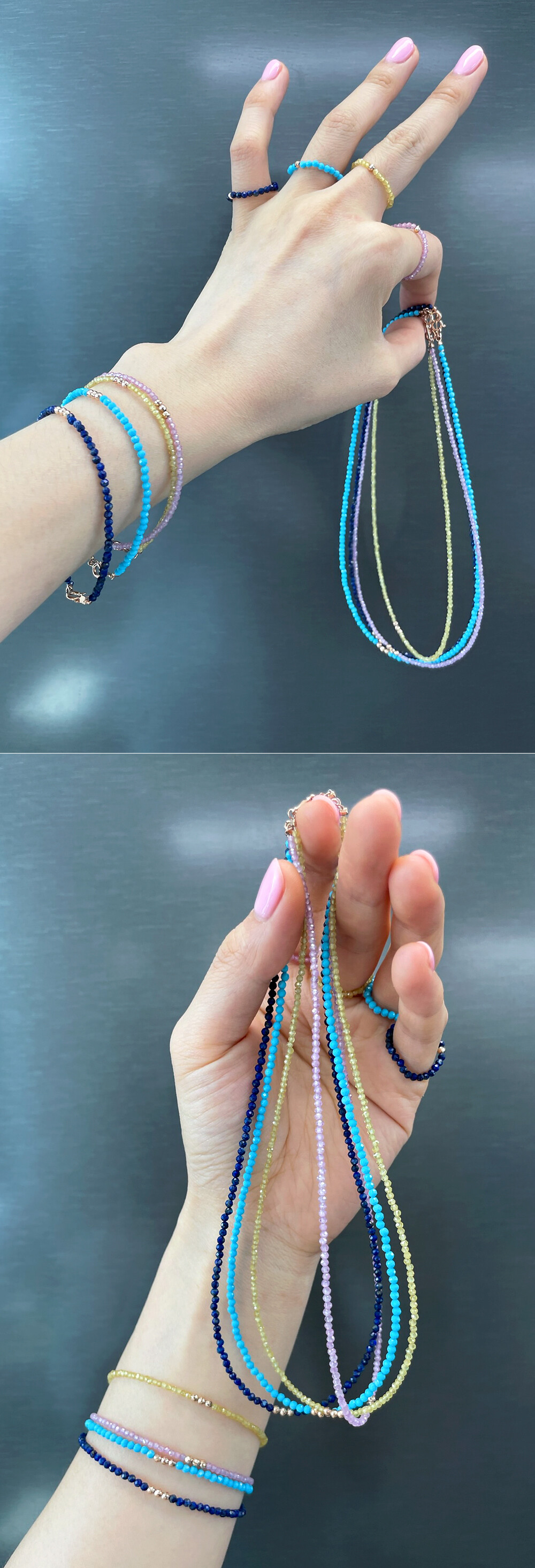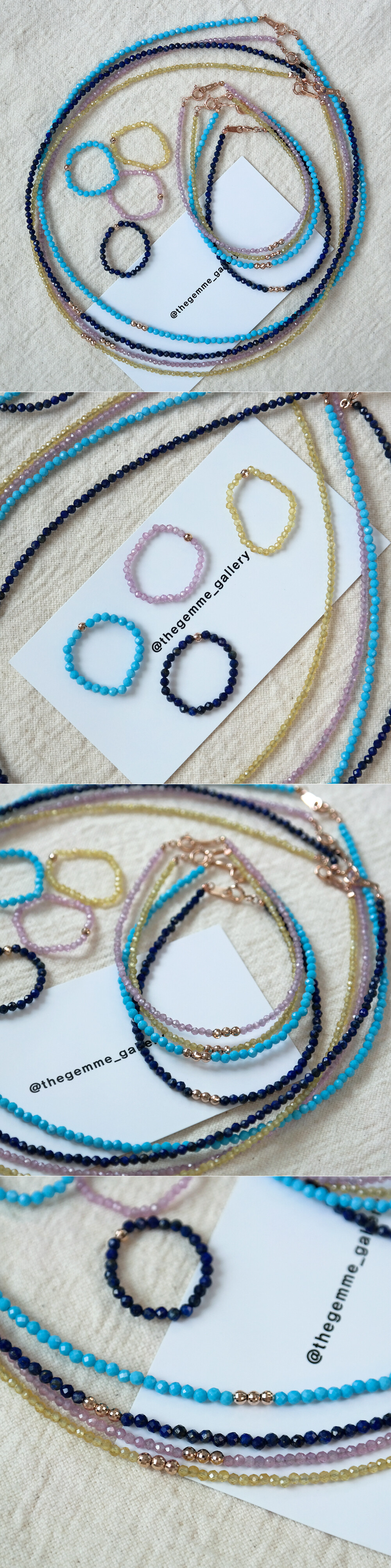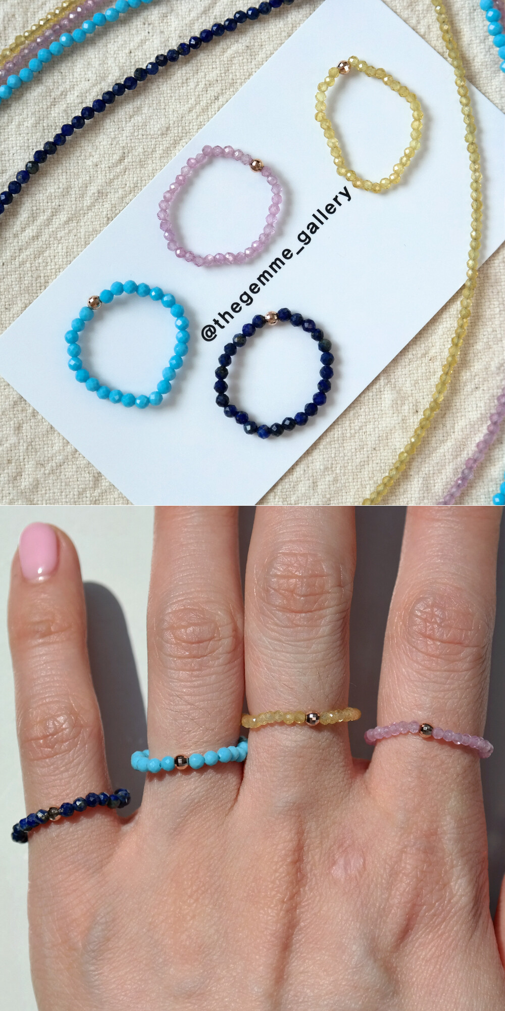 블리블리하고 화사한 느낌으로 착용하시기 좋은 원석 반지입니다, !!!!! ❤️ 론델컷으로 컷팅된 원석에 14K 컷팅 볼이 포인트로 들어간 비즈 반지에요. 원석은 하울라이트, 사파이어 (옐로우 & 핑크), 래피스래줄라이 원석입니다. 약 2~3mm 사이즈의 원석이구요, 원석에 따라서 아주 약간씩은 사이즈가 상이하니 자세한 사이즈는 상세 사이즈 이미지에서 확인해 주세요. ☺️ 원석 종류에 따라서 가격도 조금씩 차이가 있어요~ 자세한 가격은 옵션에서 확인! 😛 :) 우레탄 줄로 꿰어놓은 반지라 고무줄처럼 늘어납니다! 반짝반짝한 비즈 느낌으로 하나만 착용하셔도 예쁘고, 다른 반지들과 레이어드하셔도 너무 예쁘답니다. 포인트 및 레이어드 반지로 추천해 드려요! 👍🏼