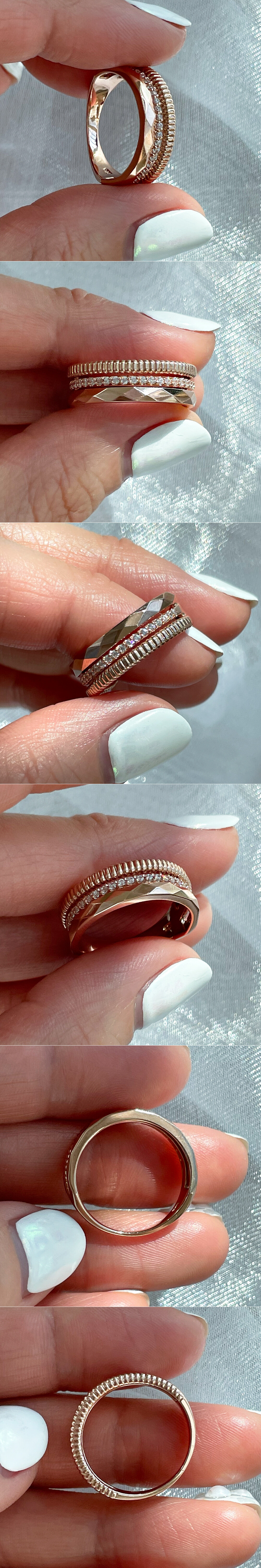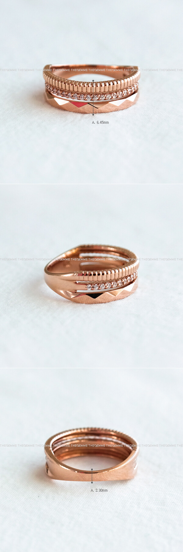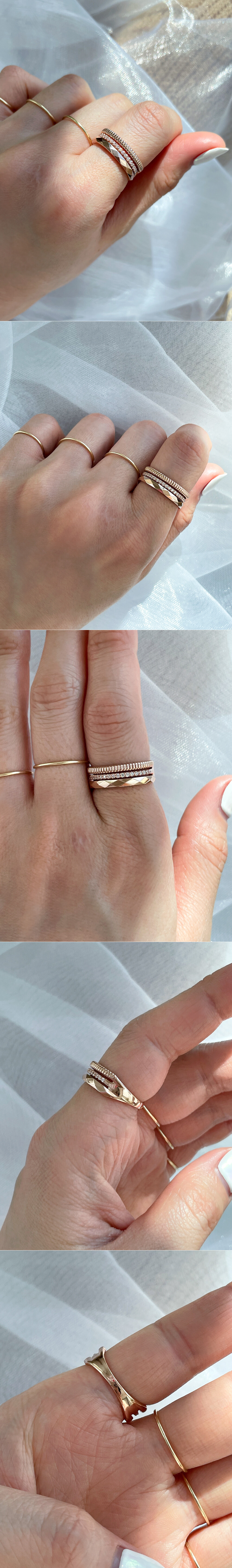 각각 다른 디자인의 밴드들이 연결된 세 줄 반지입니다. 유니크하고 세련된 스타일로 중량감도 있는 편이라 안정감 있게 착용하시기 좋아요. 볼드한 스타일의 세련된 반지를 찾으시는 분들께 데일리 및 포인트 반지로 추천해 드릴게요 :) 💙