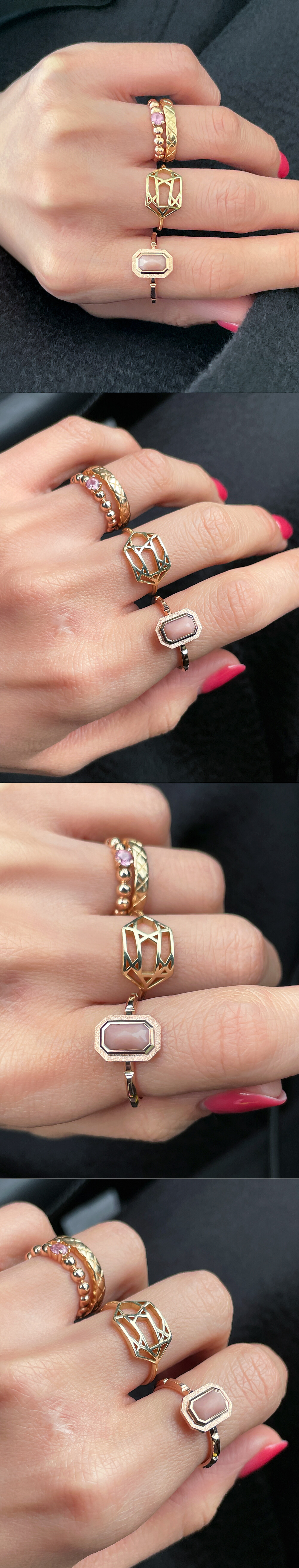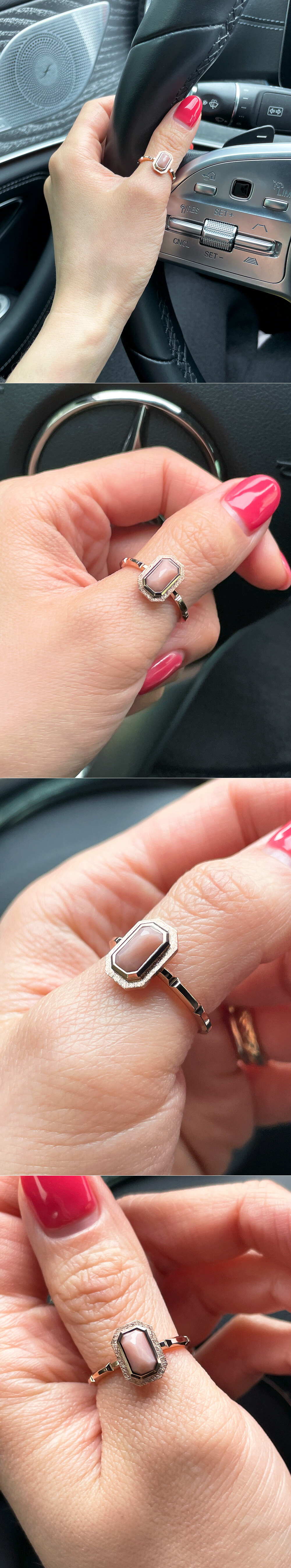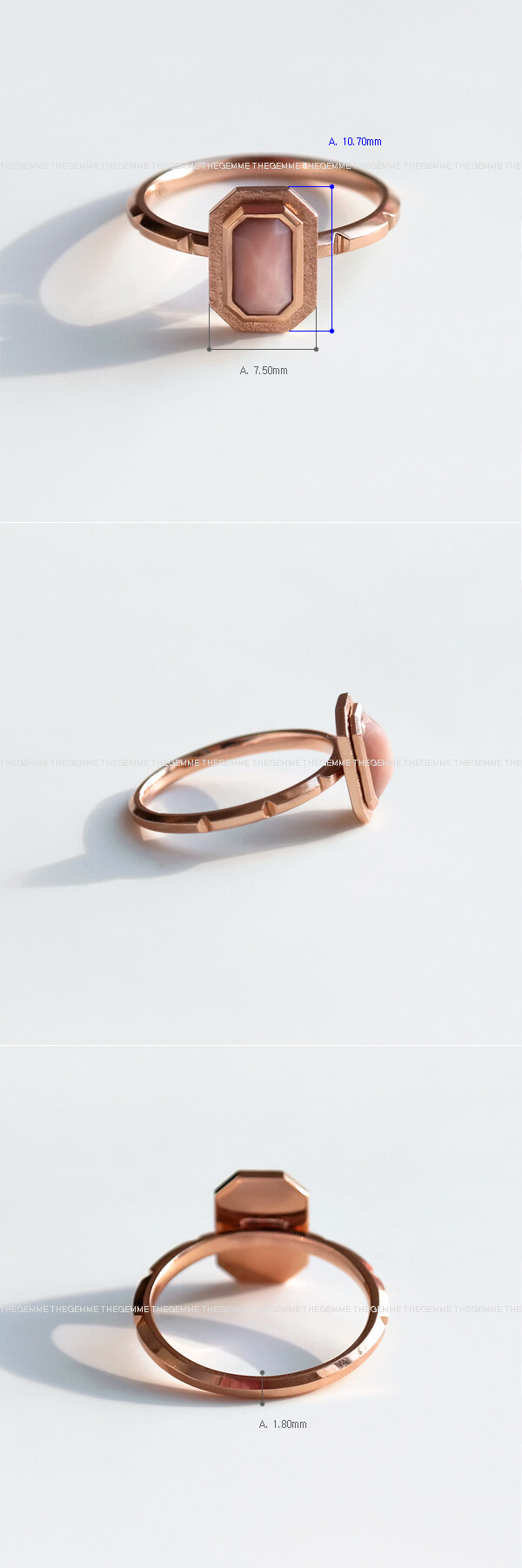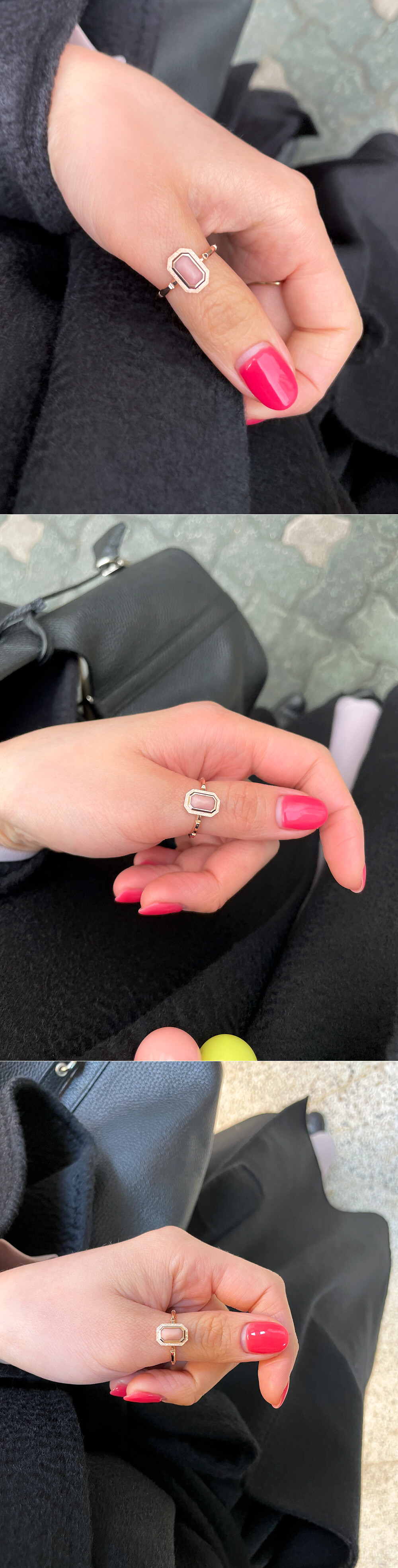 반짝반짝~ ✨ 사랑스럽고 러블리한 컬러를 가진 핑크 오팔 반지입니다. 💍 귀한 사각 로즈컷의 핑크 오팔이 메인으로 세팅된 포인트 반지로, 엣지있고 세련된 느낌을 주는 아이에요 :) 깔끔한 베즐 세팅으로 제작되었구요, 베즐 부분에 샌딩된 무광 포인트가 들어가 있어서 고급스러운 느낌이 한층 더해졌어요. 밴드 부분에도 디테일한 디자인이 들어가 있어 전체적으로 다양한 매력이 느껴지는 아이랍니다. 😃 세련미 넘치는 디자인으로 멋스러운 느낌의 포인트 반지로 추천해 드릴게요! 🩷
