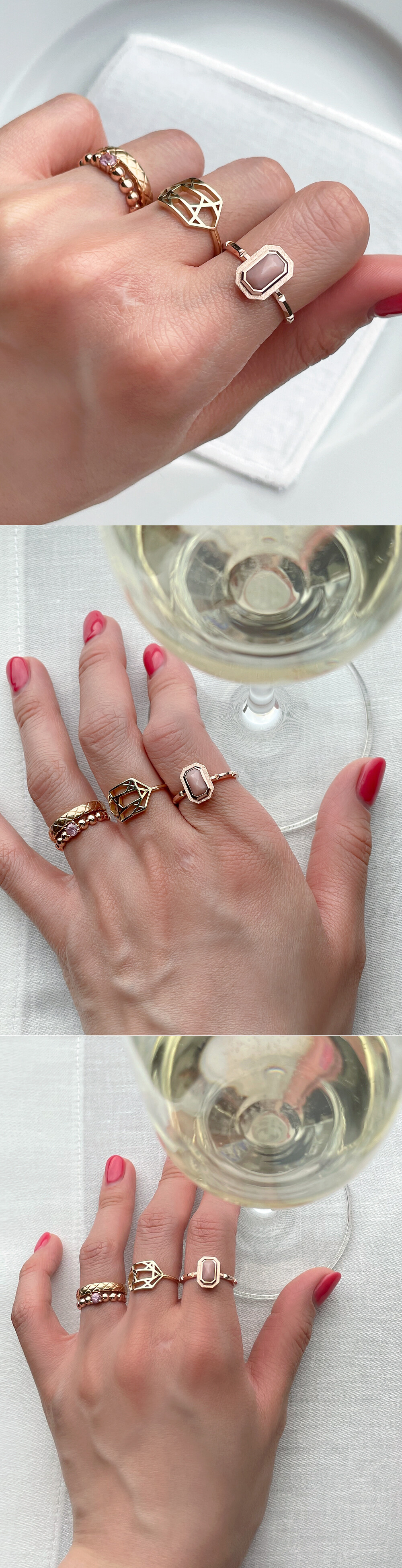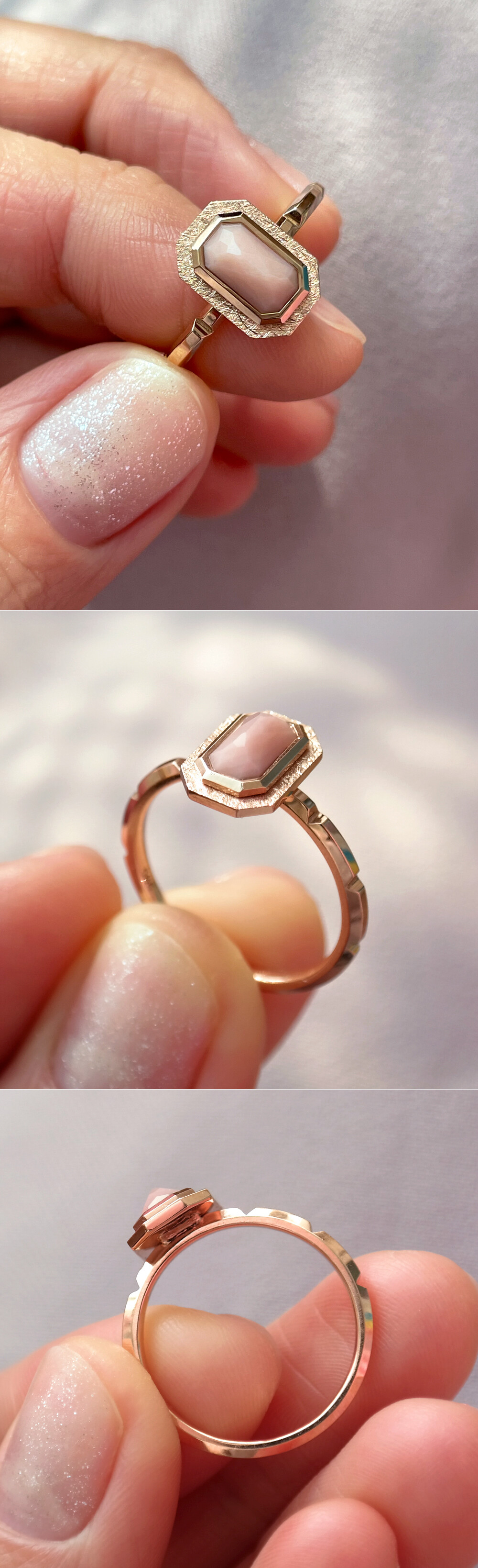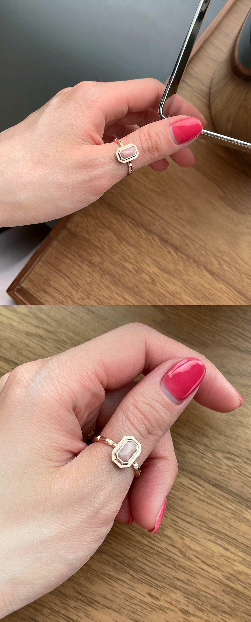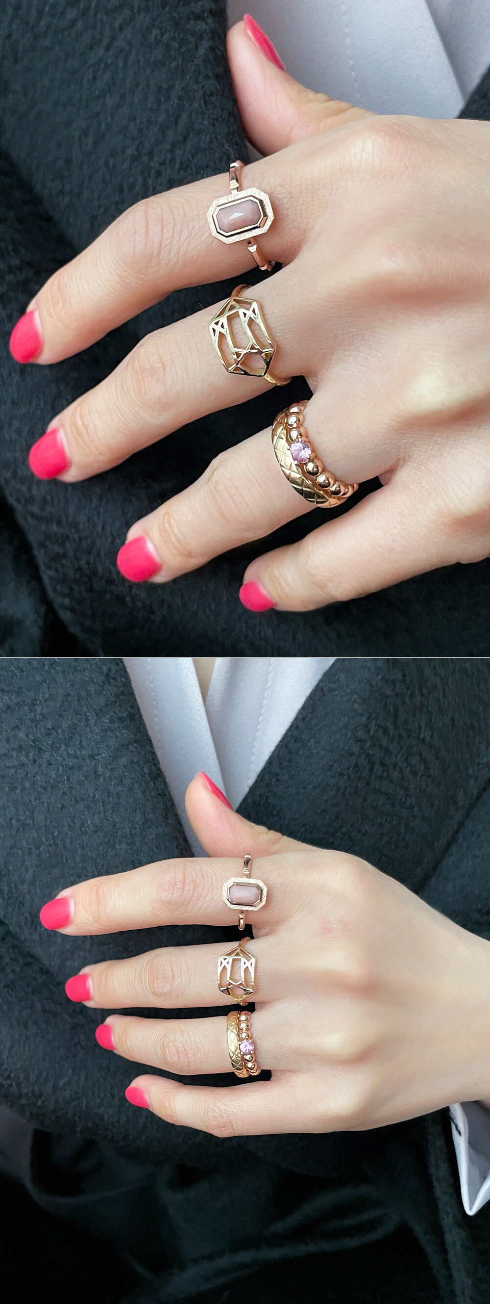 반짝반짝~ ✨ 사랑스럽고 러블리한 컬러를 가진 핑크 오팔 반지입니다. 💍 귀한 사각 로즈컷의 핑크 오팔이 메인으로 세팅된 포인트 반지로, 엣지있고 세련된 느낌을 주는 아이에요 :) 깔끔한 베즐 세팅으로 제작되었구요, 베즐 부분에 샌딩된 무광 포인트가 들어가 있어서 고급스러운 느낌이 한층 더해졌어요. 밴드 부분에도 디테일한 디자인이 들어가 있어 전체적으로 다양한 매력이 느껴지는 아이랍니다. 😃 세련미 넘치는 디자인으로 멋스러운 느낌의 포인트 반지로 추천해 드릴게요! 🩷
